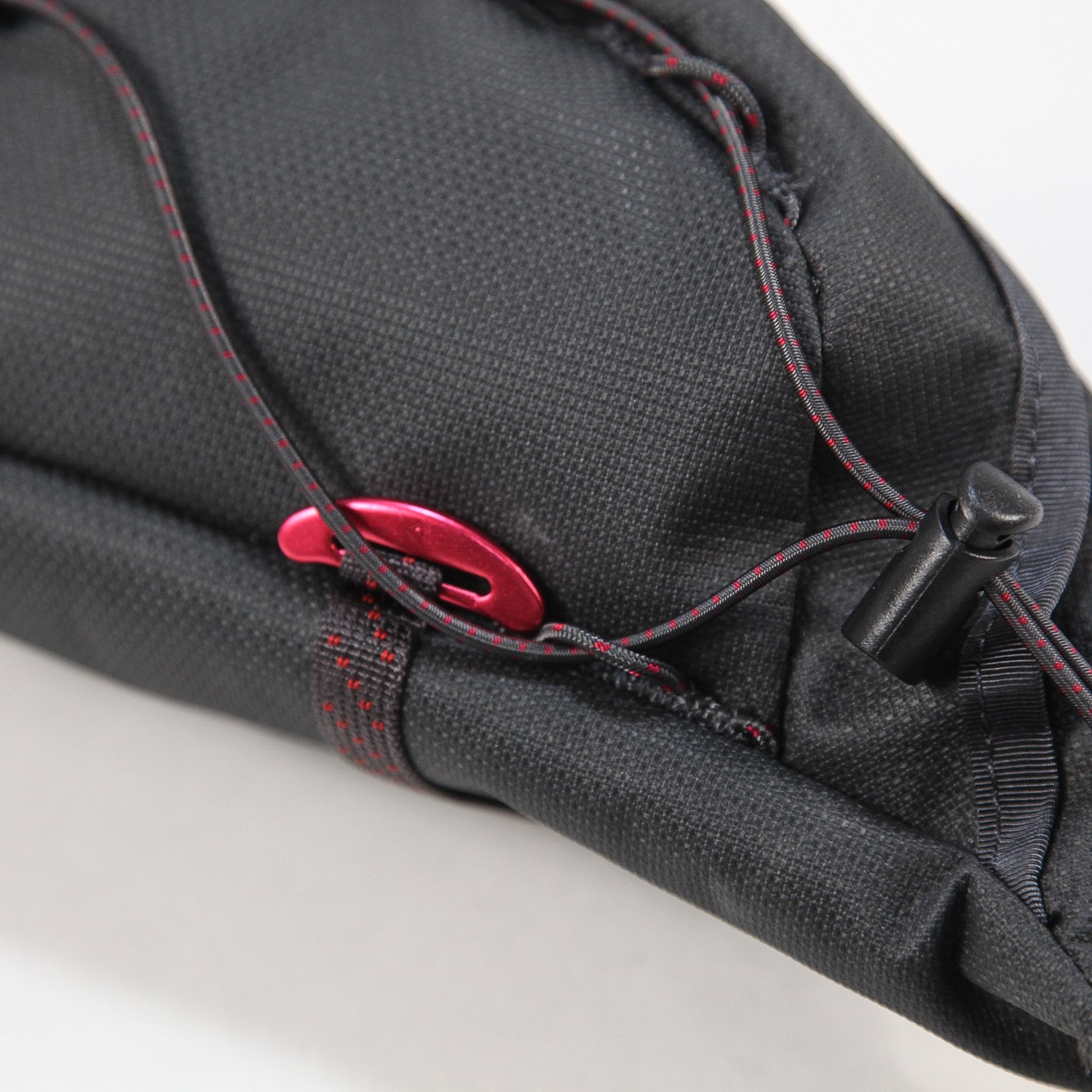 上部のバンジーコードには薄手のレインジャケットなどのアイテムを留めることができ、前面に伸縮性のあるメッシュポケットを備えているのですぐに手に取りたいアイテムを入れることができます。