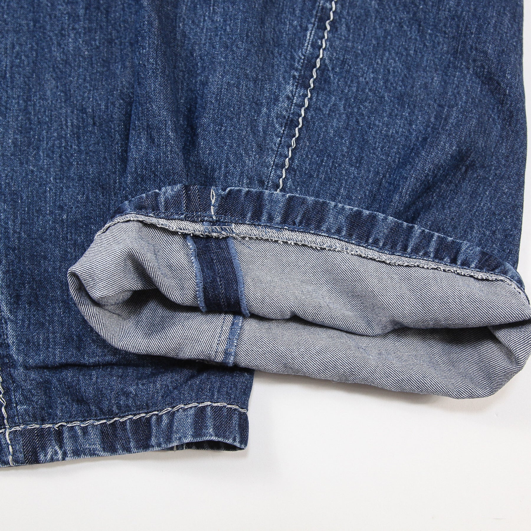太もものサイドから裾にかけて斜めに配されたステッチラインが特徴的で、背面中央のベルトループやバックポケットのトライアングルステッチもポイント。