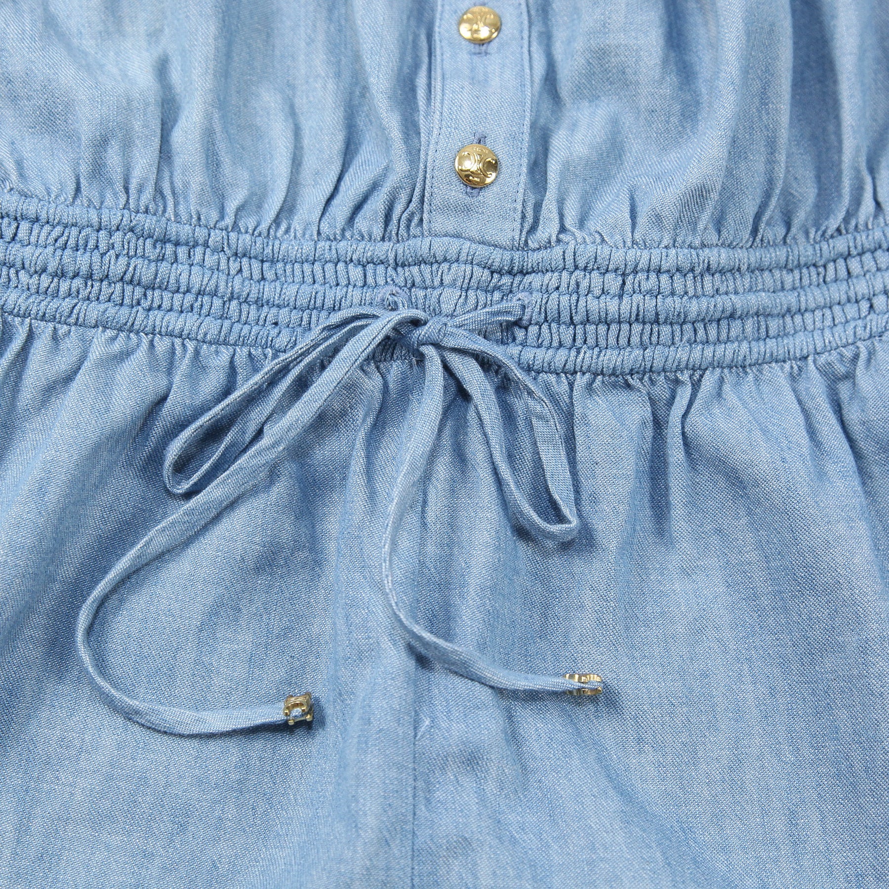 胸元とウエスト部分がシャーリング仕様になった、スモックプレイスーツ。