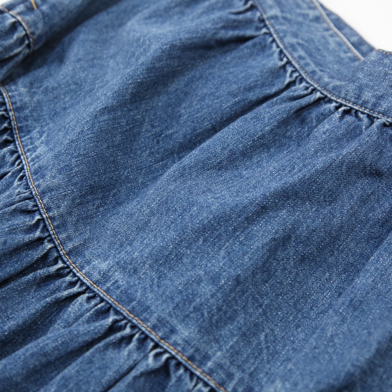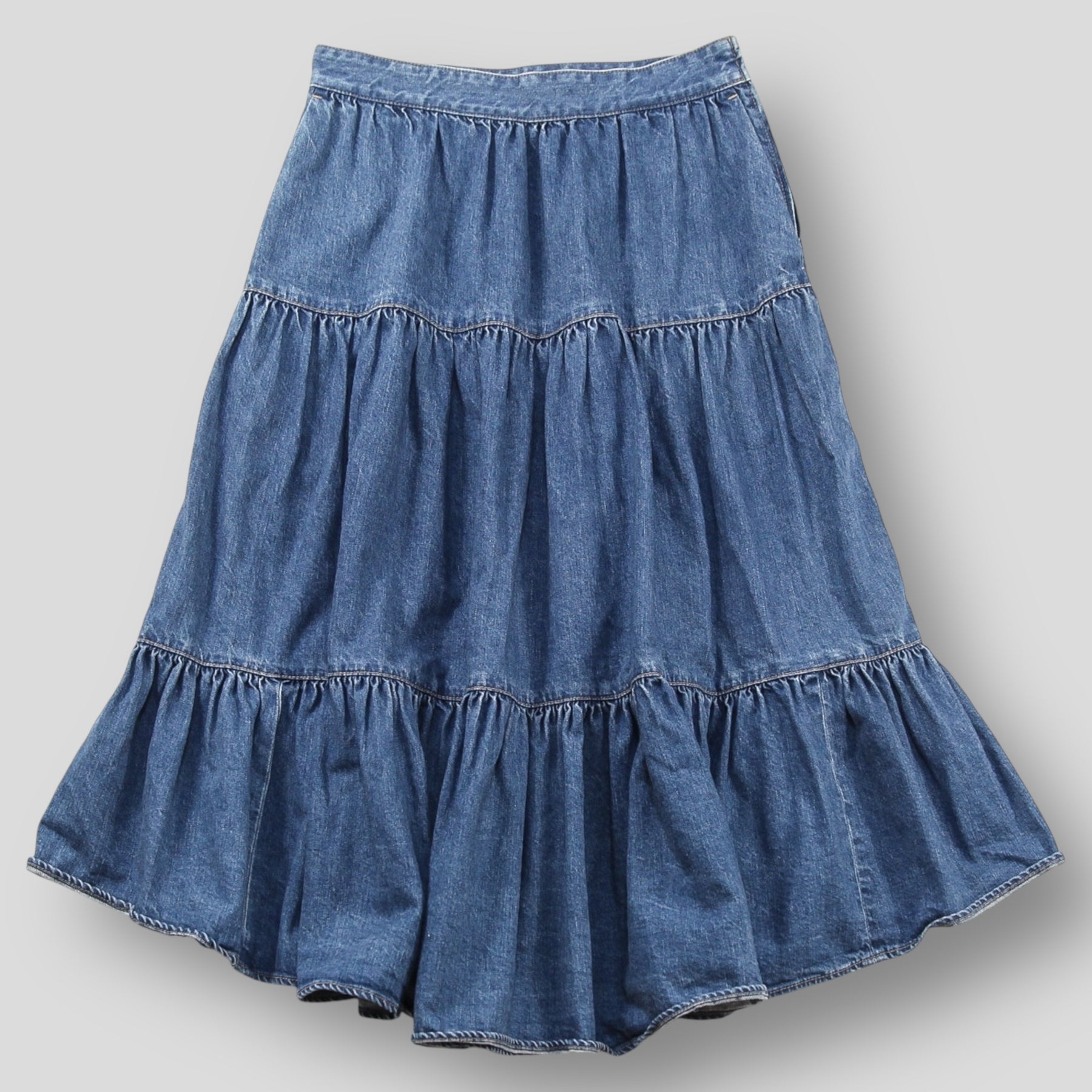 コットン100%の日本製デニムを使用した、ミディ丈のティアードスカート。