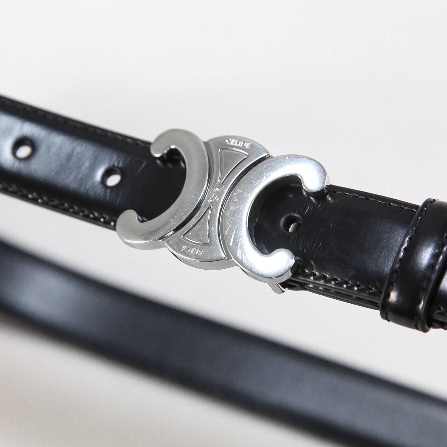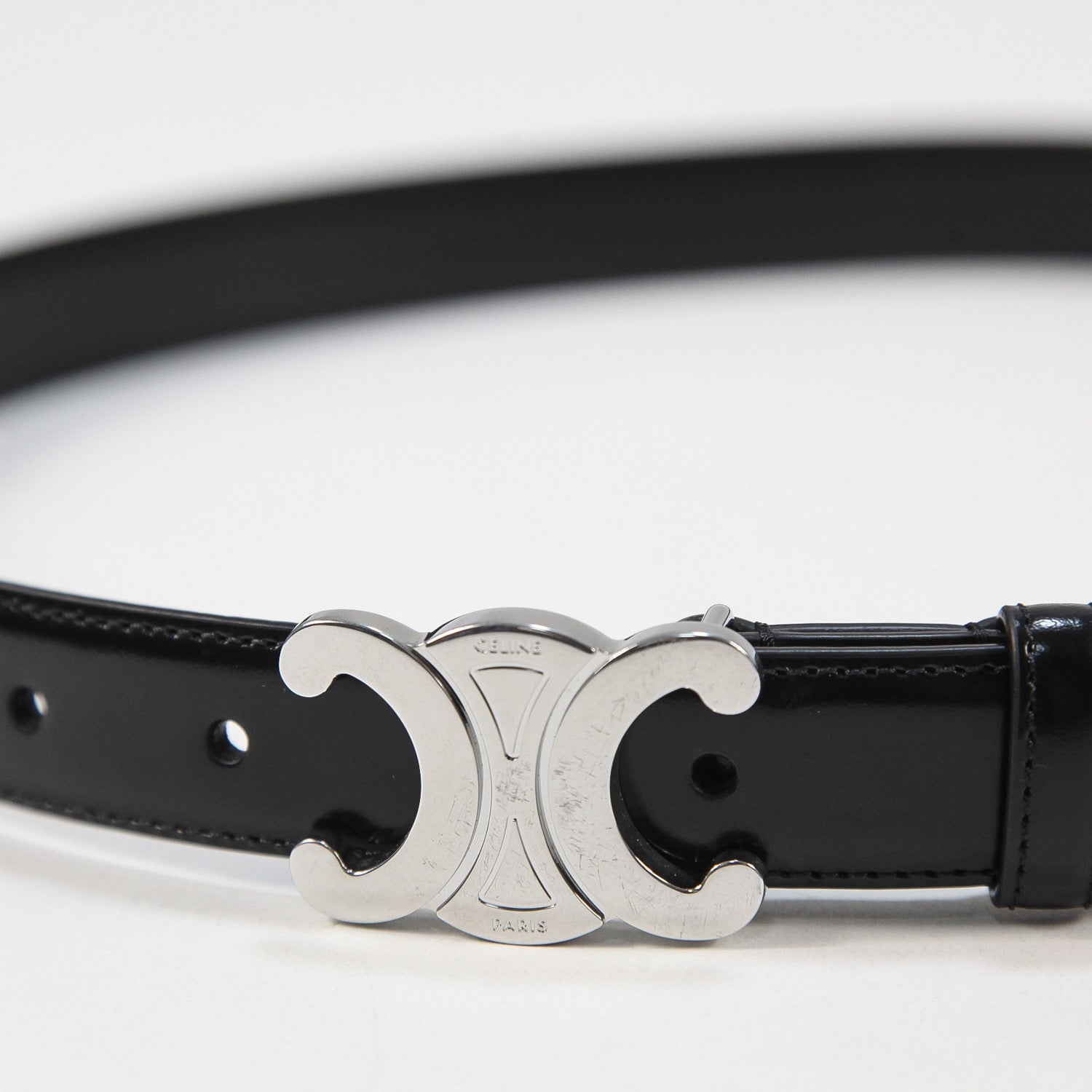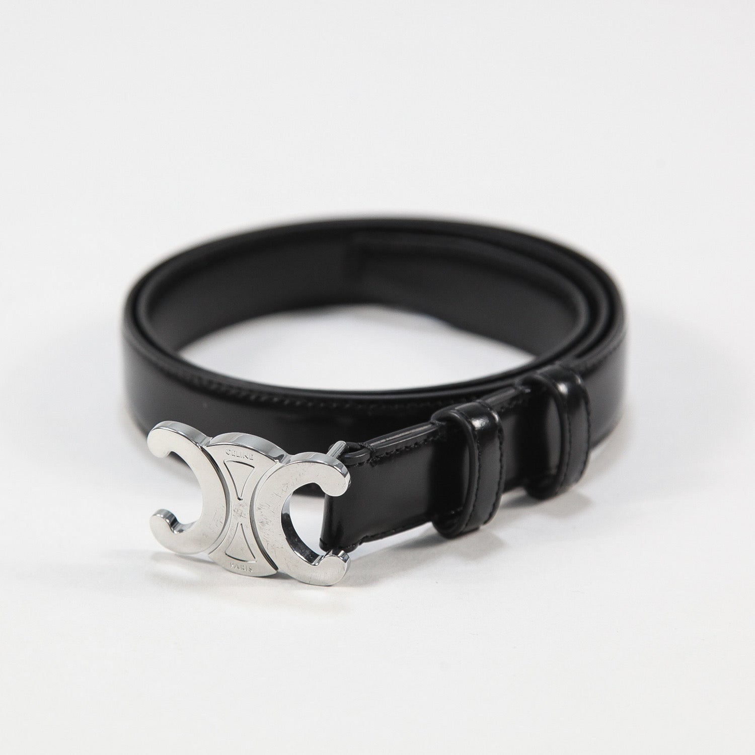 トリオンフモチーフのシルバーフィニッシュバックルを配したアイコニックなデザインで、2.5cm幅のミディアムウエストを採用。