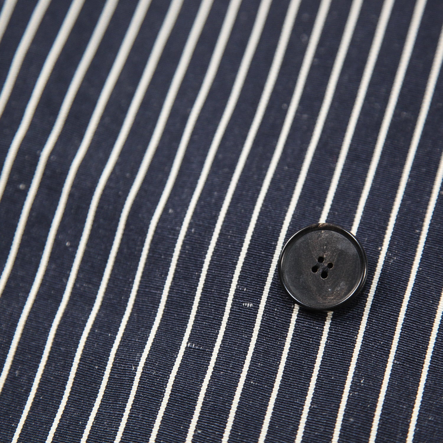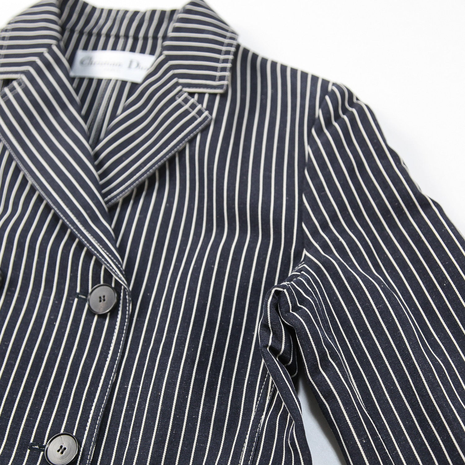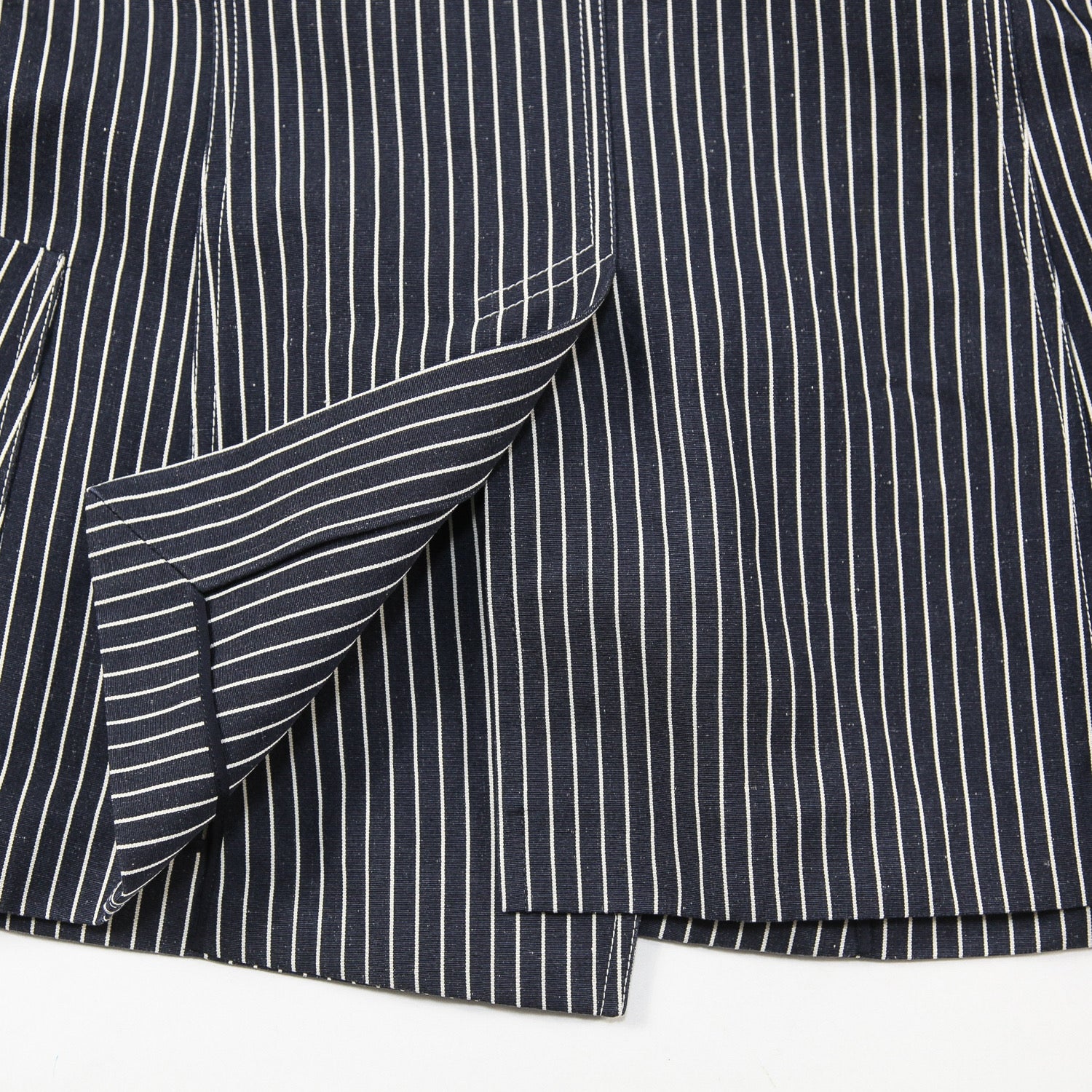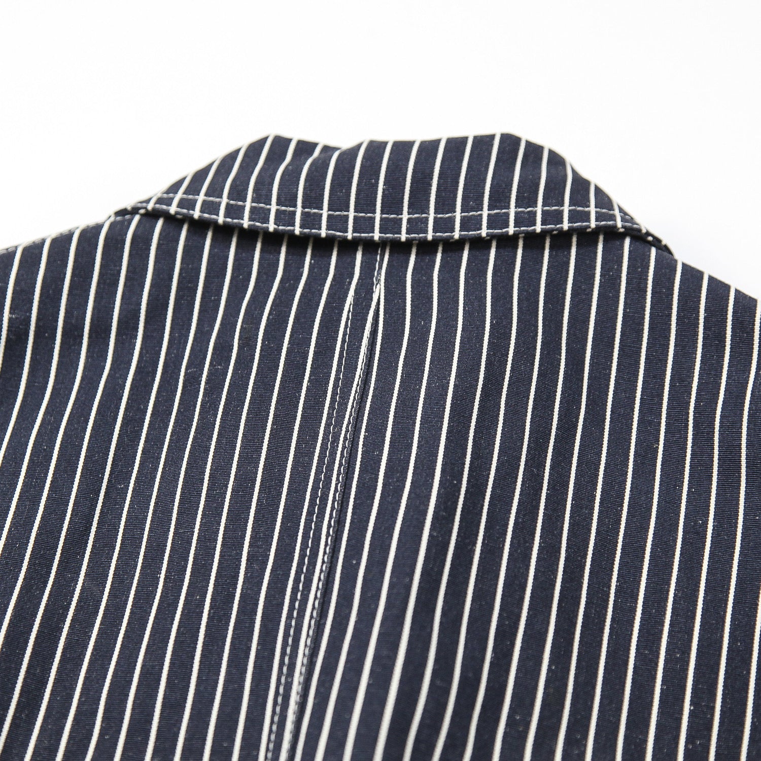 程よくリラックス感のあるシルエットで、ブラックに近いダークネイビーのボディにオフホワイトのストライプが主張しすぎない上品な仕上がり。