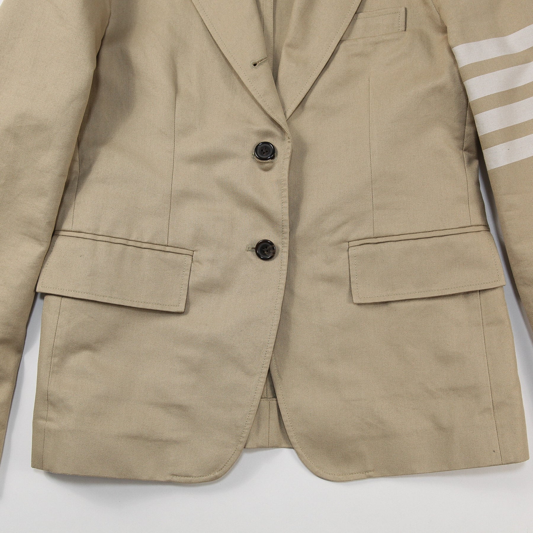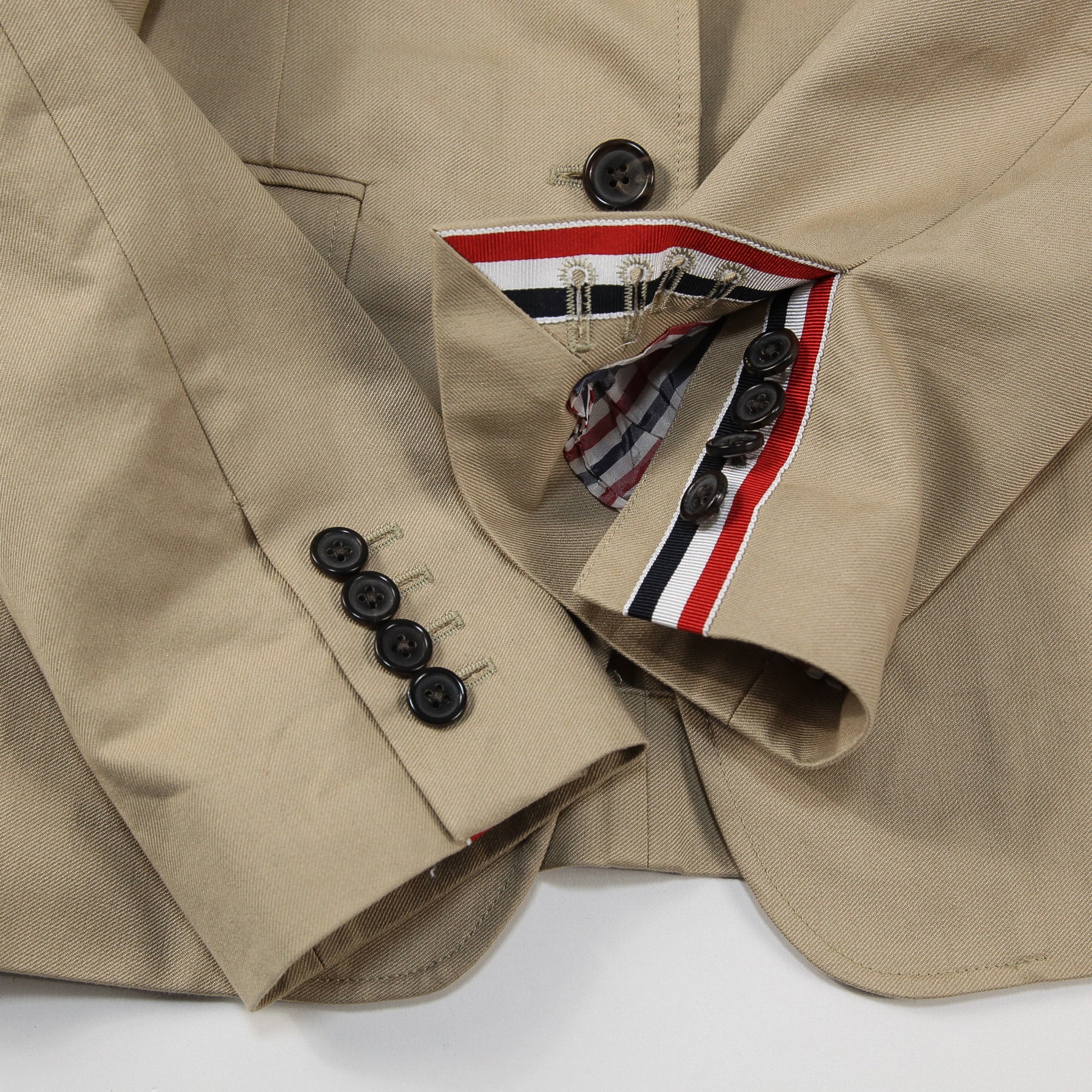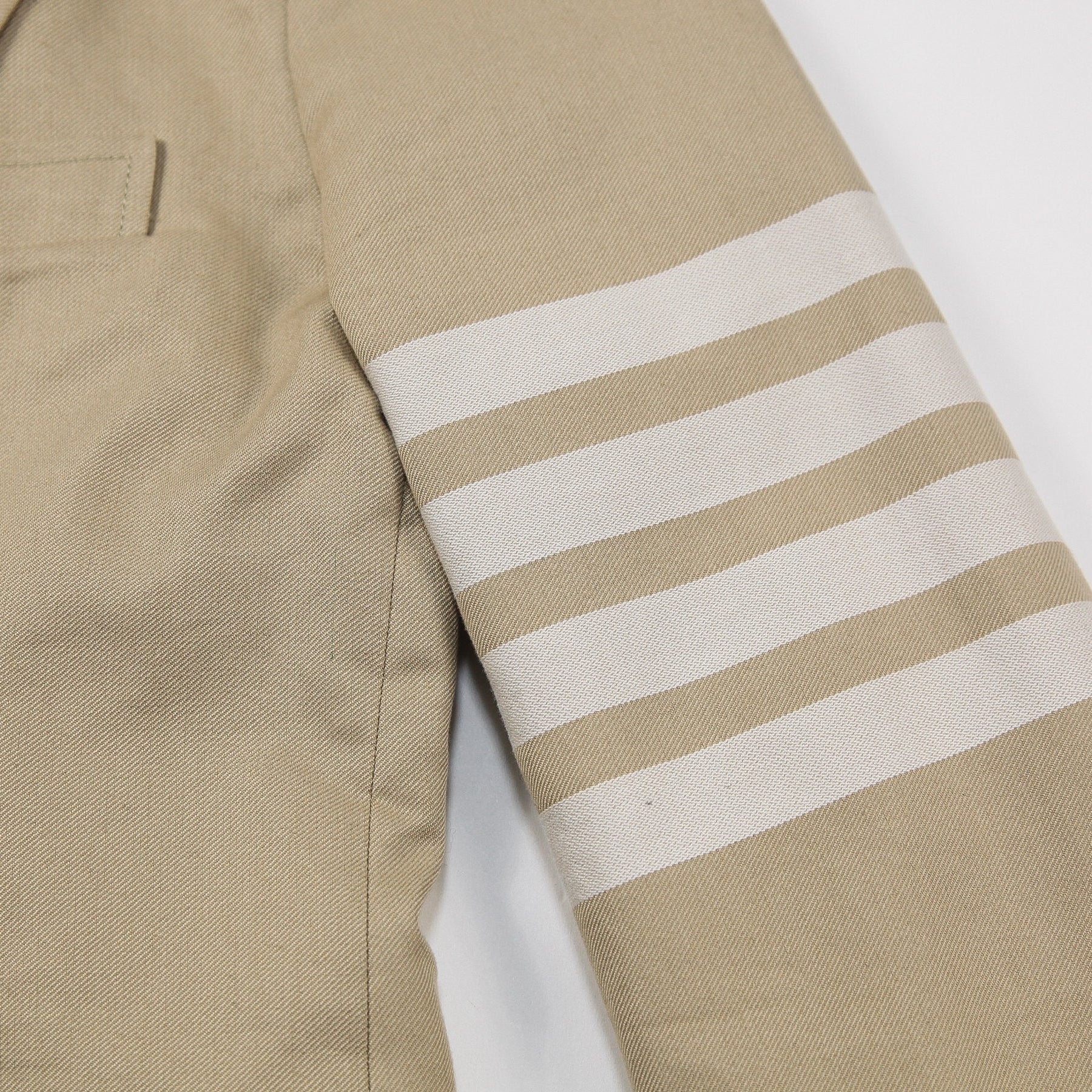 左腕には4BARラインをあしらい、本切羽の袖口にはシグネチャーストライプのグログランテープをトリミングしたアイコニックな仕上がり。