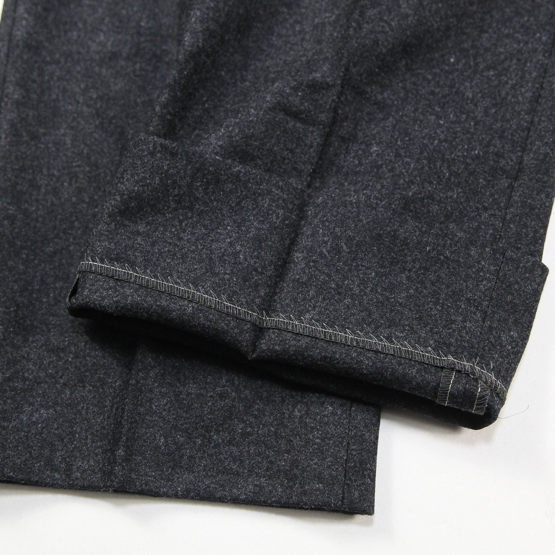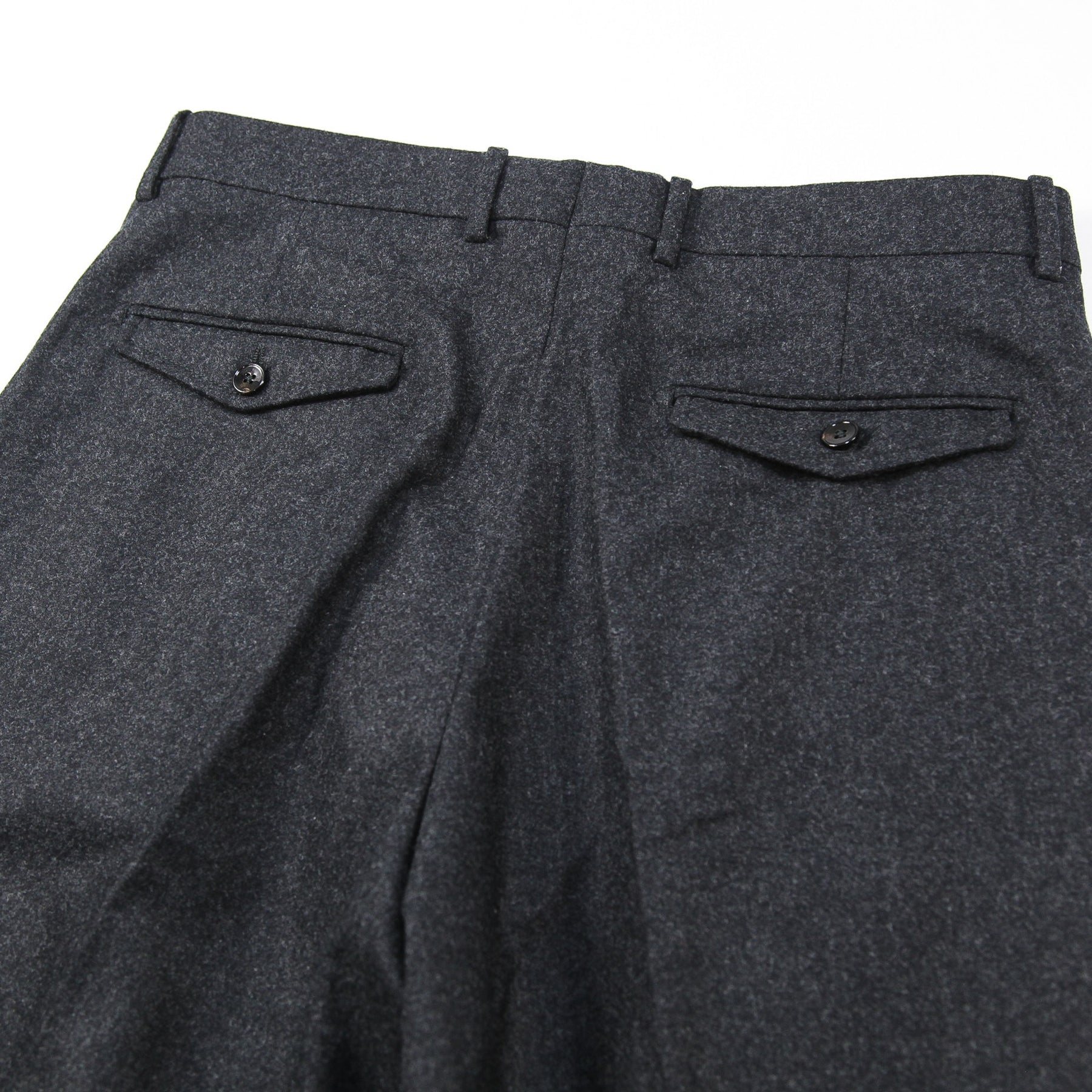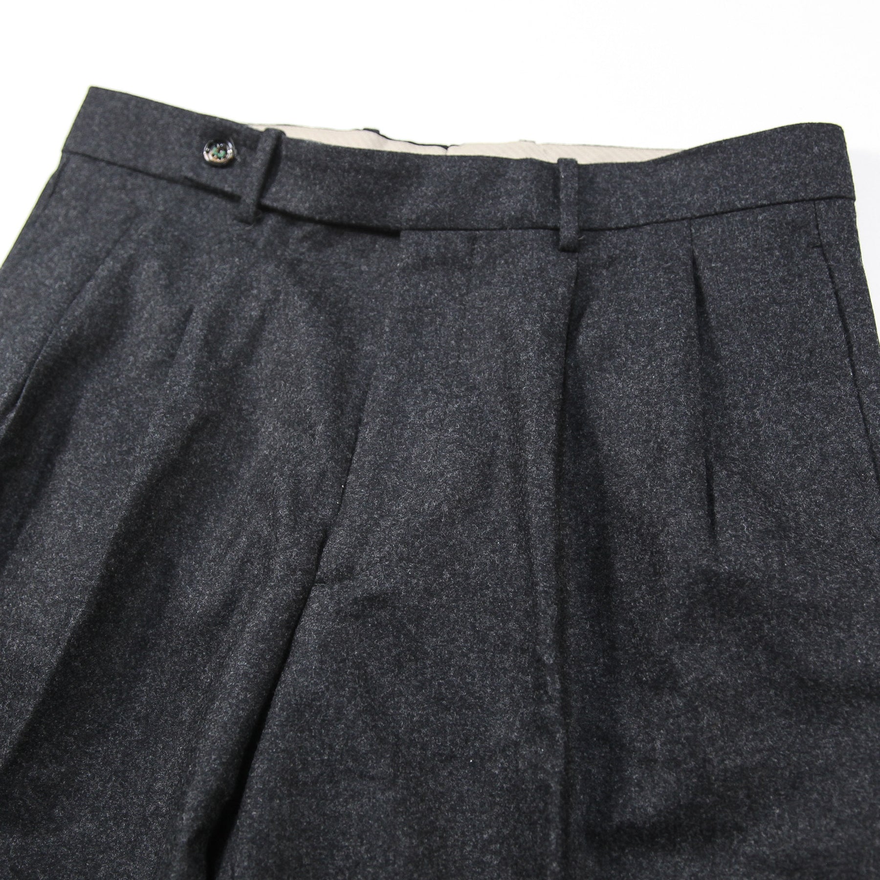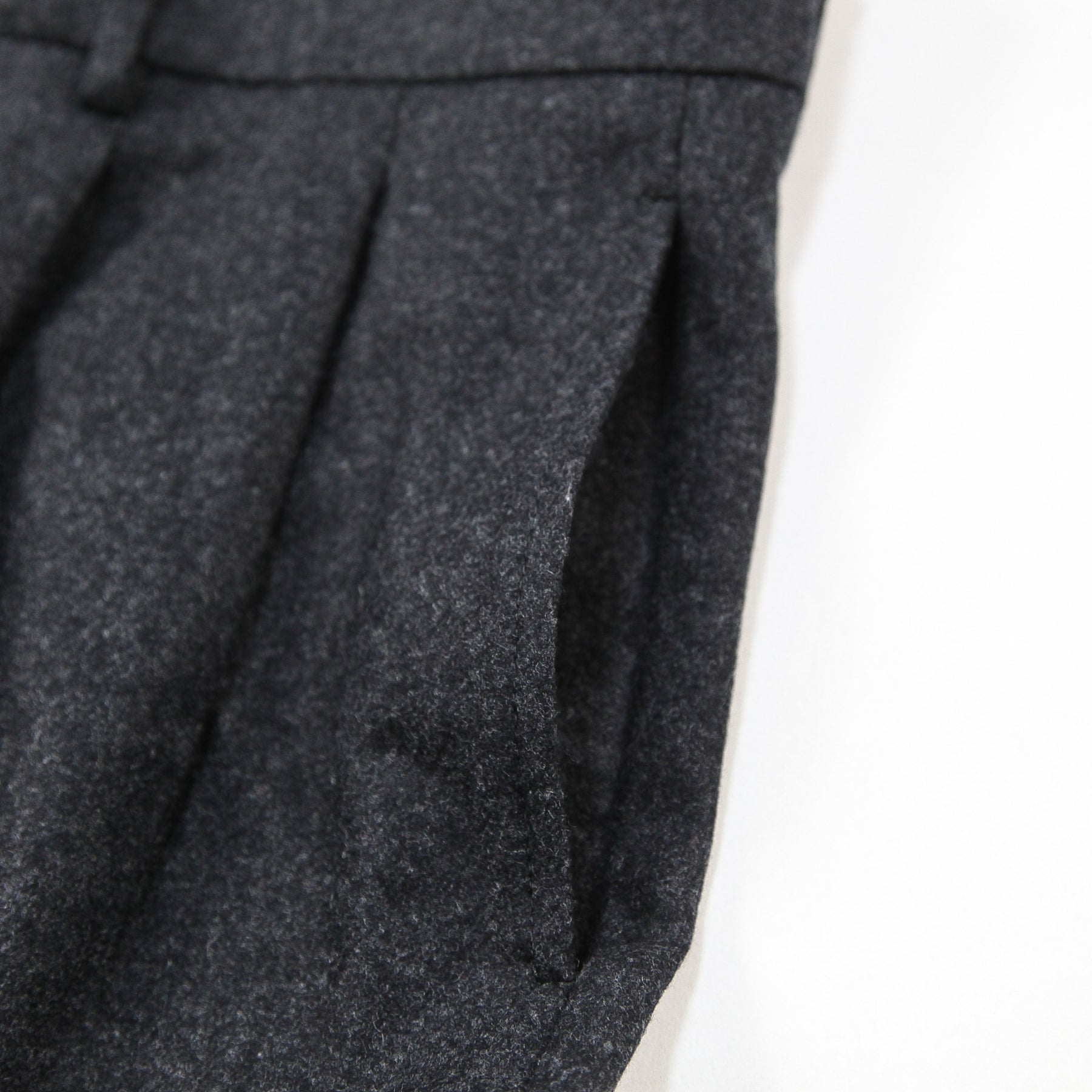 アウトプリーツが2つ入ったチャコールグレーのフランネル素材のスラックスは、ジャケットスタイルからショールカラーニットなどと合わせるカジュアルスタイルまで幅広く取り入れることが出来ます。