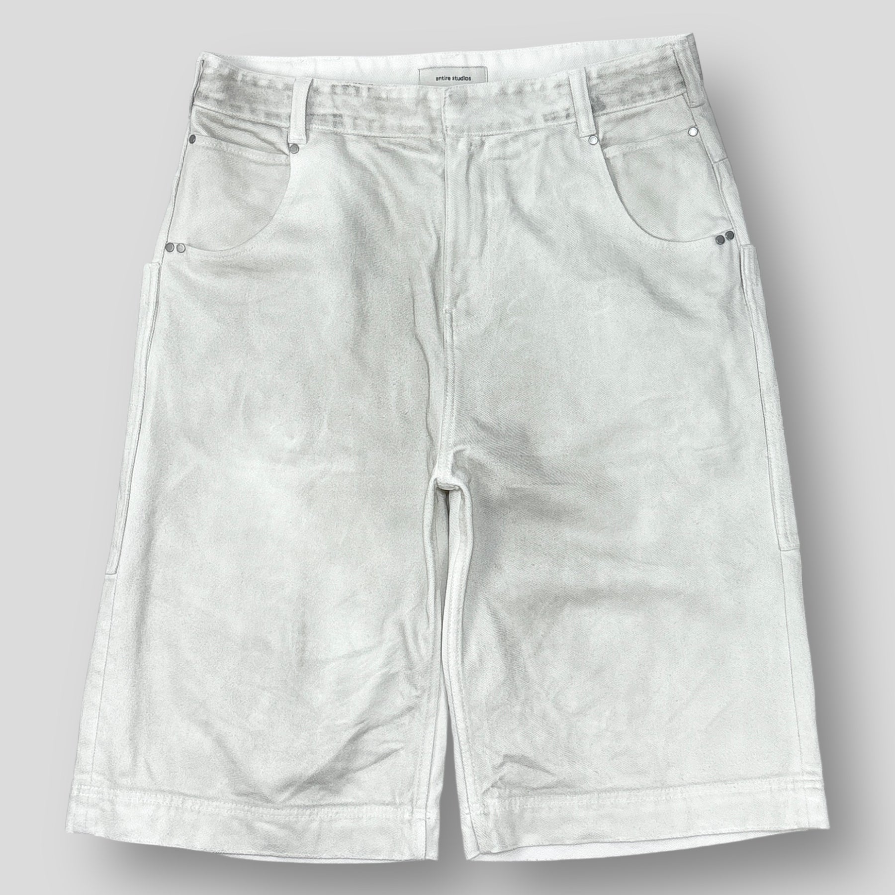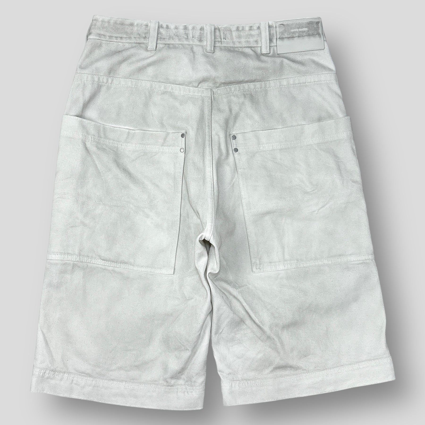 オーバーサイズシルエットに仕上げられたデニムショーツで、背面の大ぶりなポケットに付けられたスタッズがアクセントになっています。