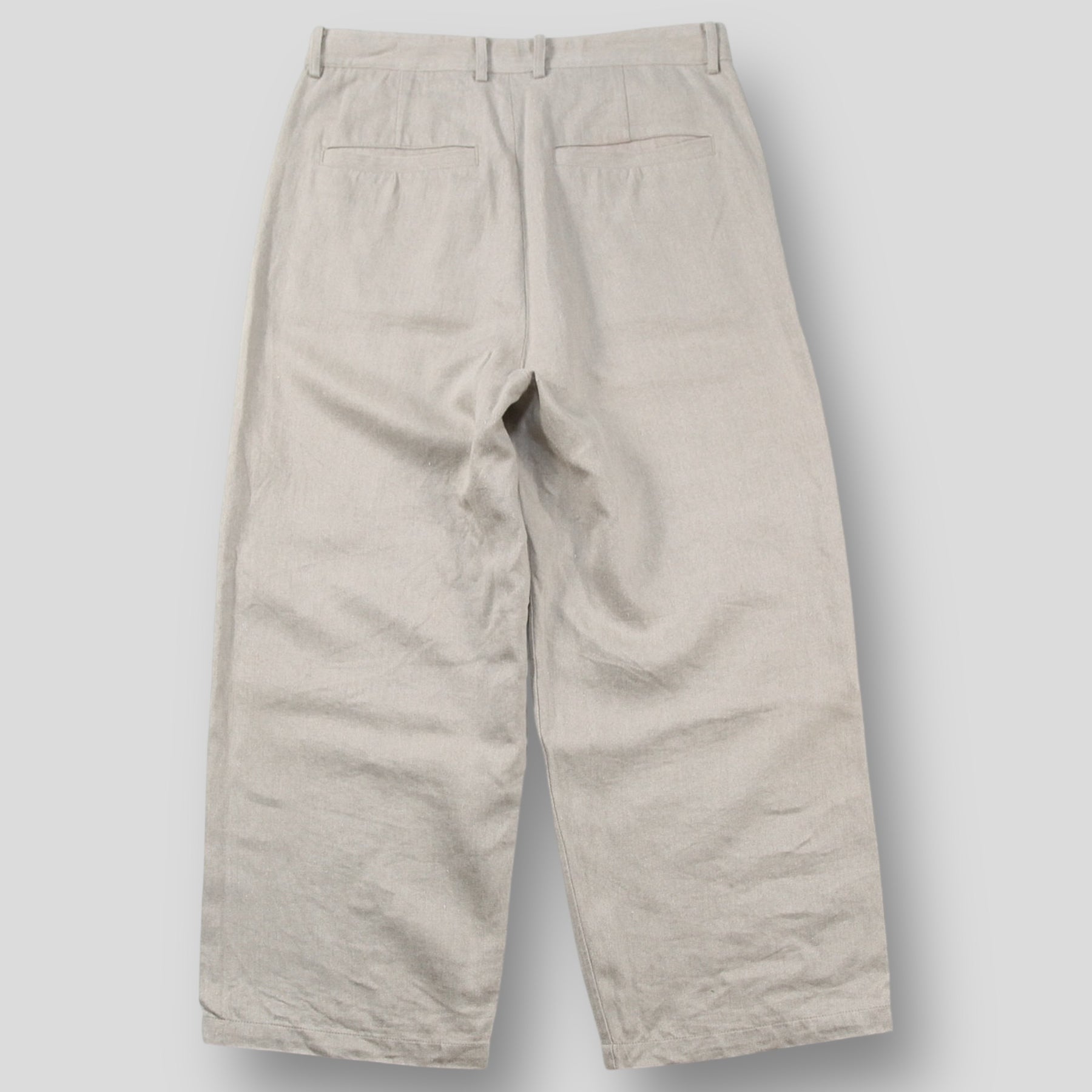 ウエストを大きく、股上を深くもたせた迫力のあるワイドストレートシルエットで、あえてクリースを入れずリラックスした雰囲気に仕上げられています。