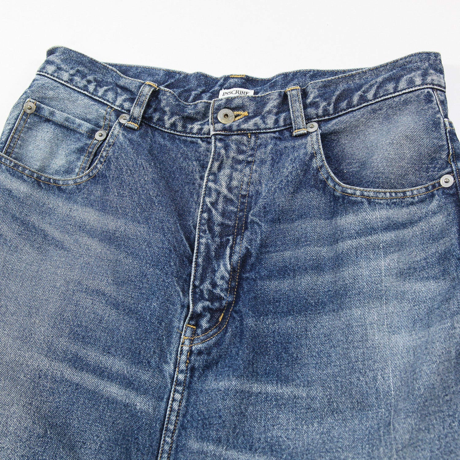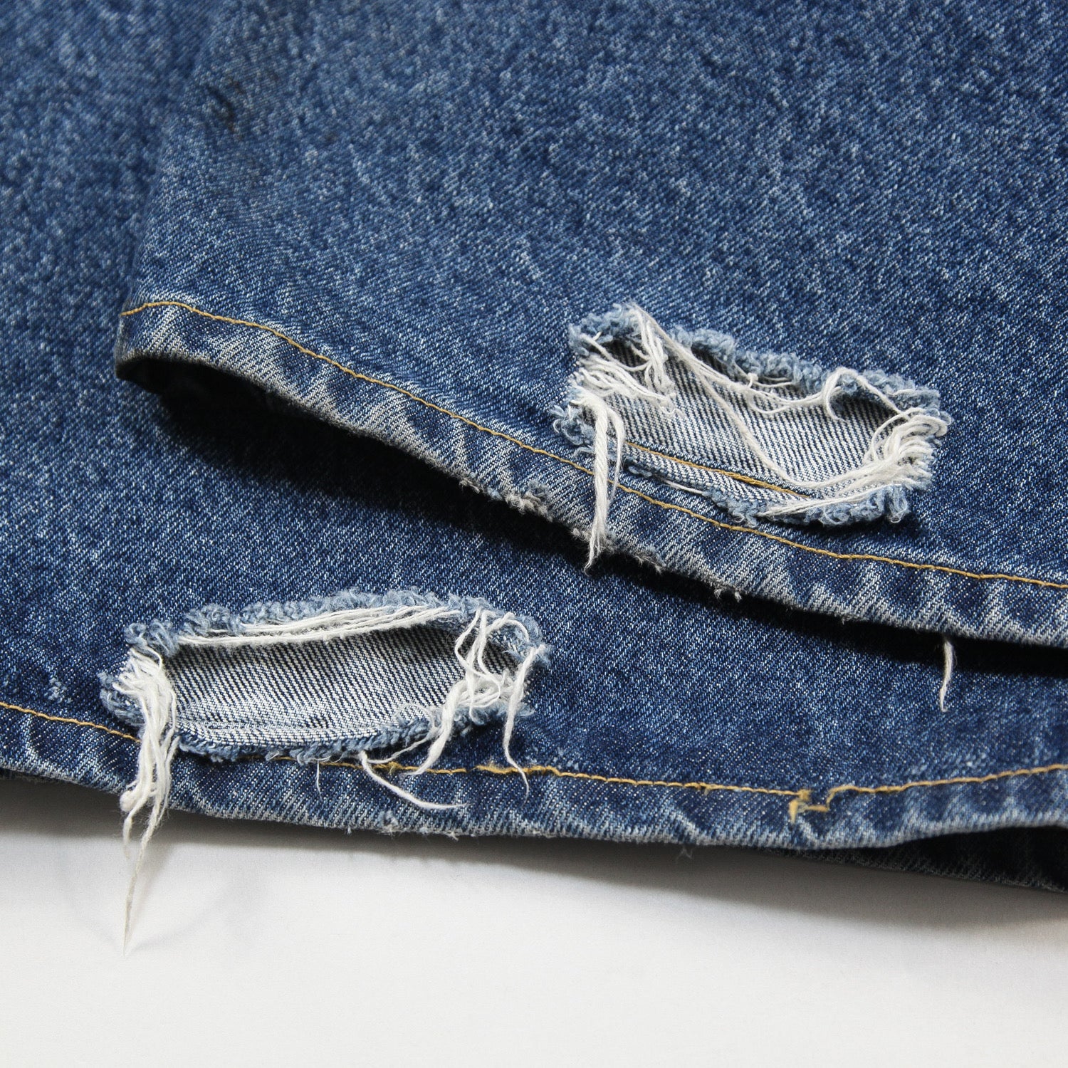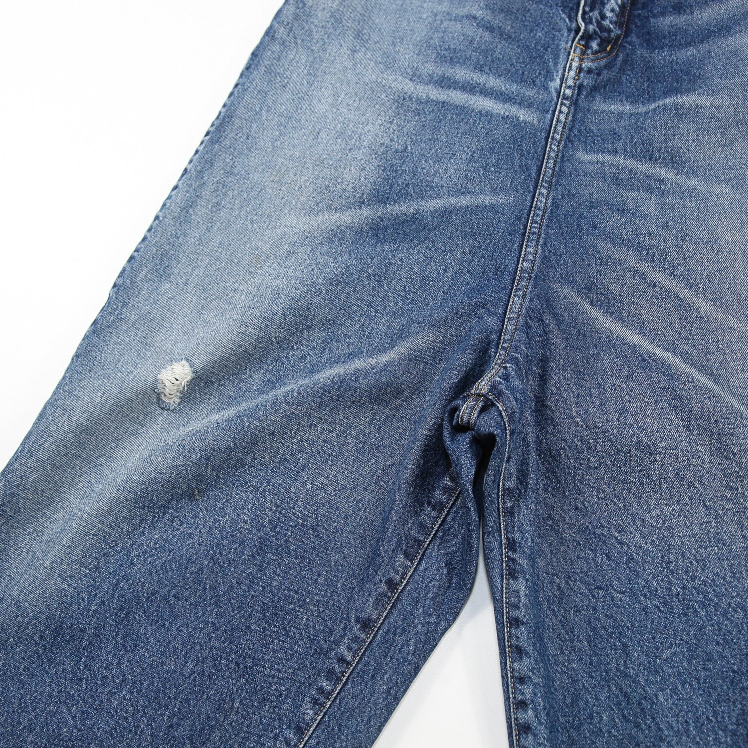 膝や背面裾部分のクラッシュ、ダメージ加工が特徴的で、リアルなヴィンテージ感が上手く表現されています。