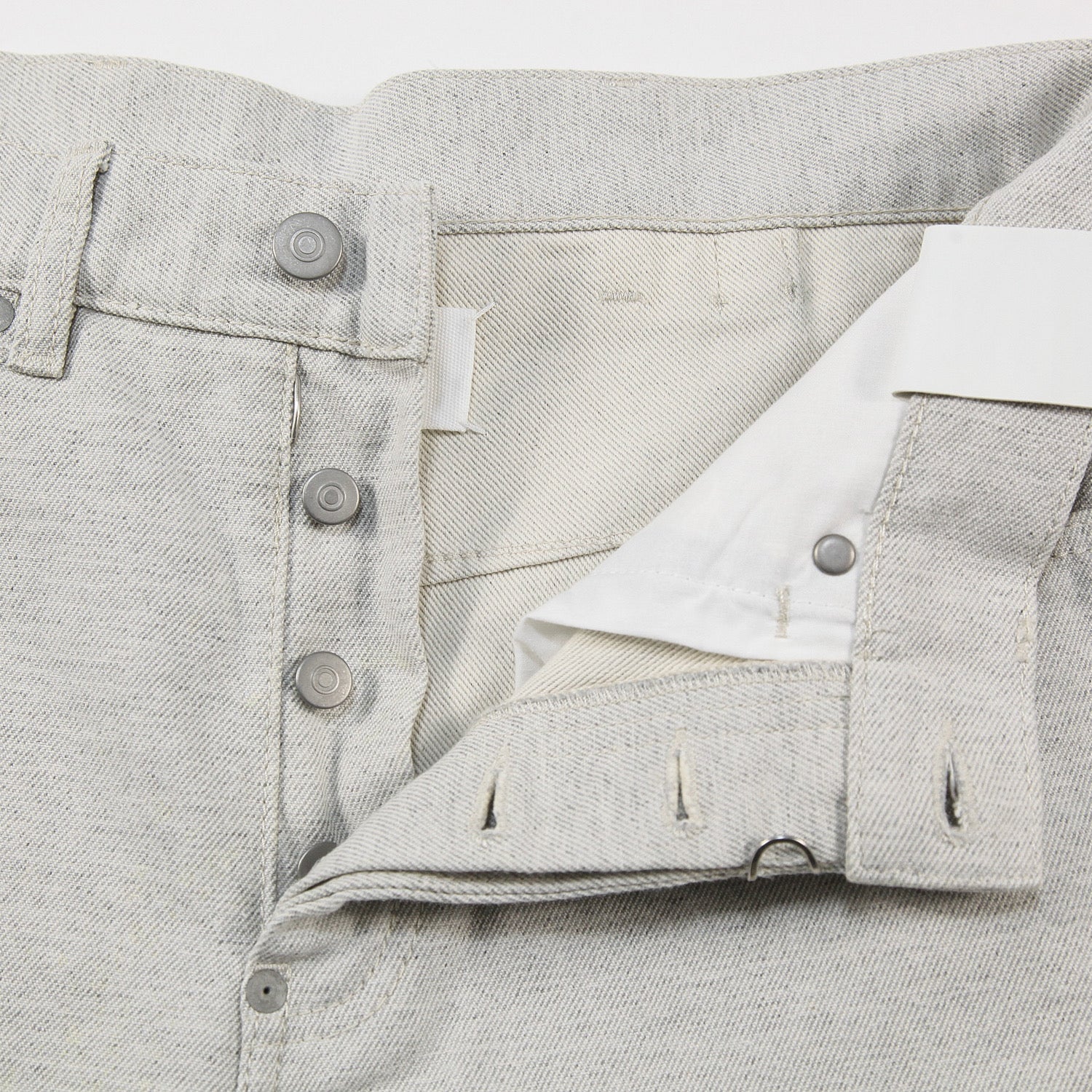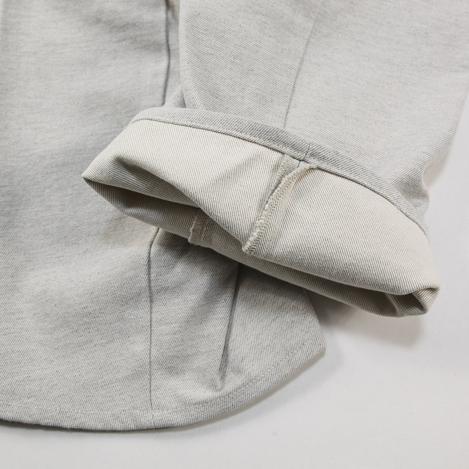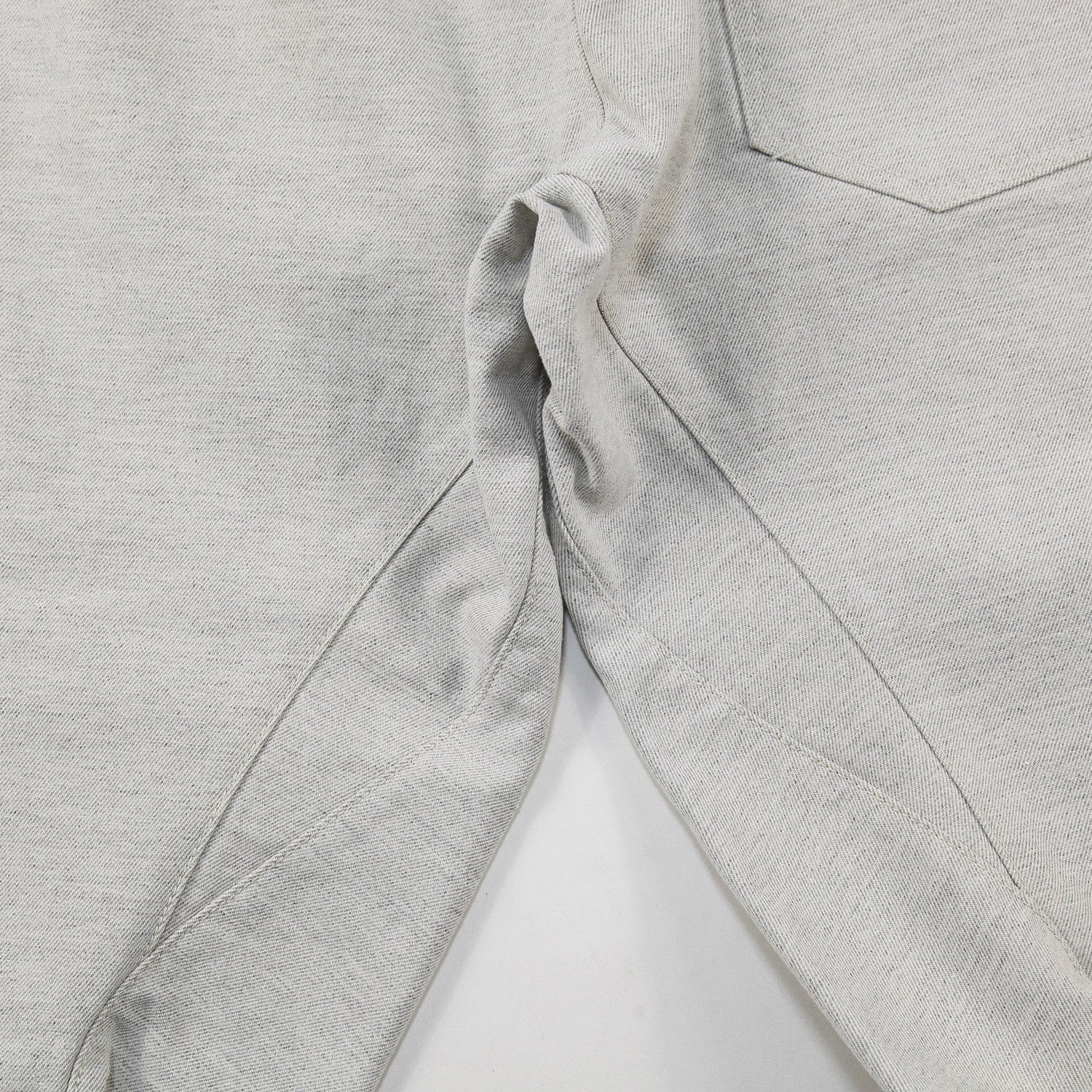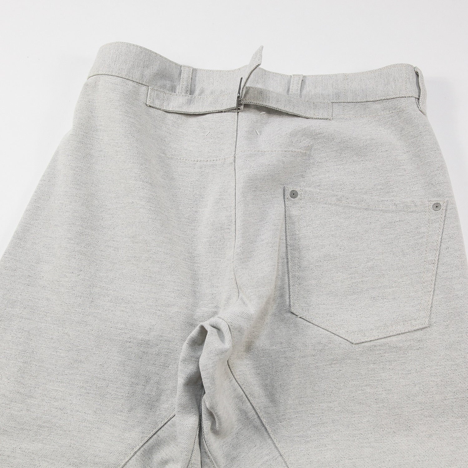 股上を深くとり、裾にかけてツイストさせた独特なラインが特徴的なデニムパンツ。