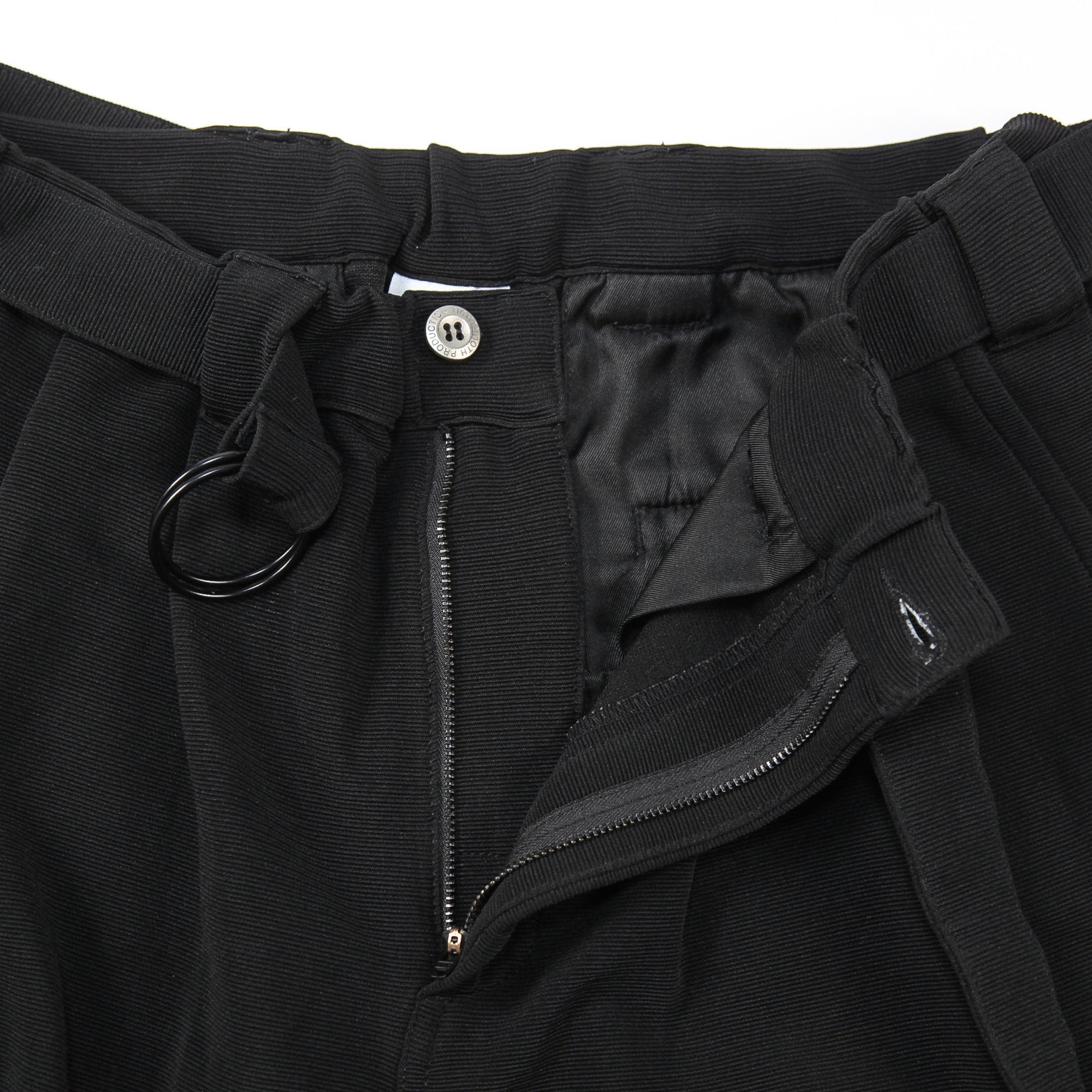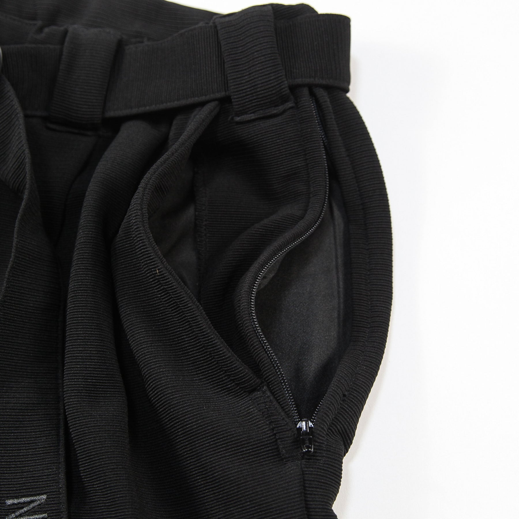 ウエストはゴム仕様で、本体と共地で平たい仕様のダブルリングベルトが装備され調節が可能で、剣先の方にブランドネームが刺繍で施されています。