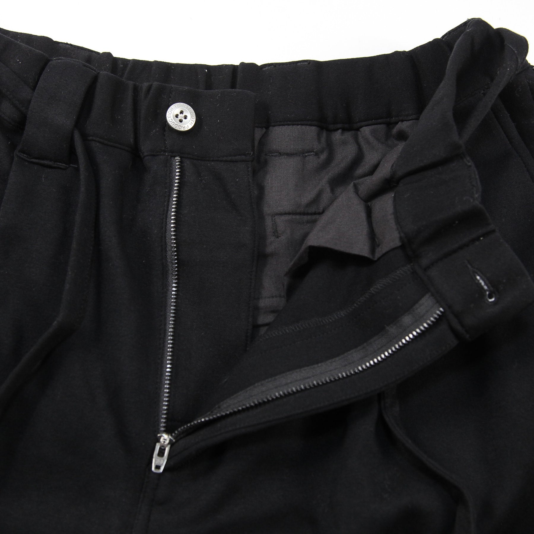 ウエストはゴム仕様で、本体と共地のウエストコードが装備され調節が可能。コード先の方にブランドネームがプリントされています。