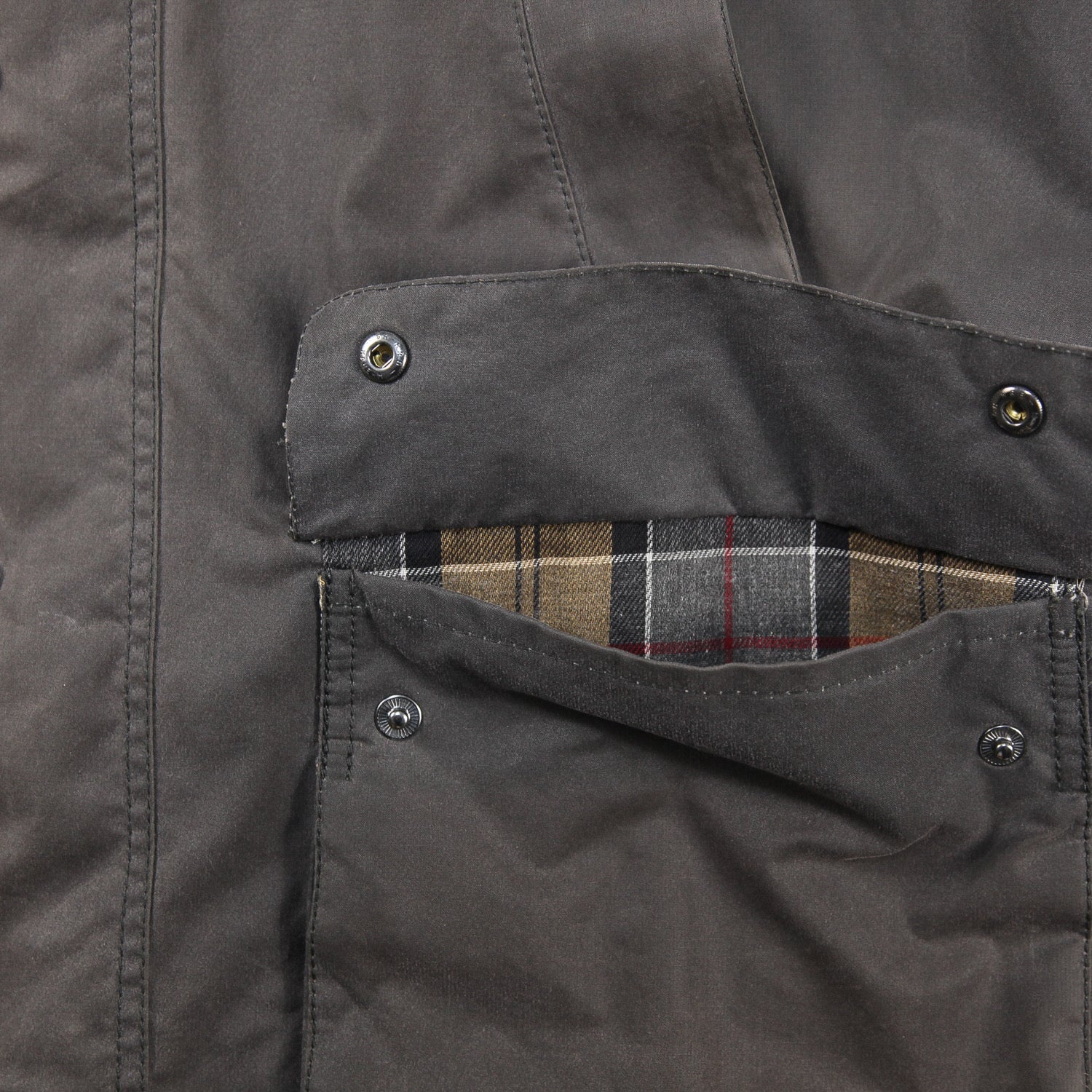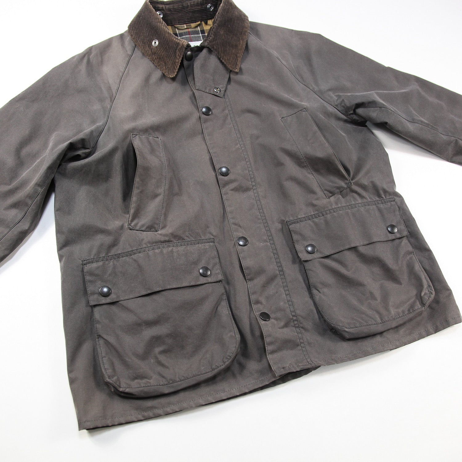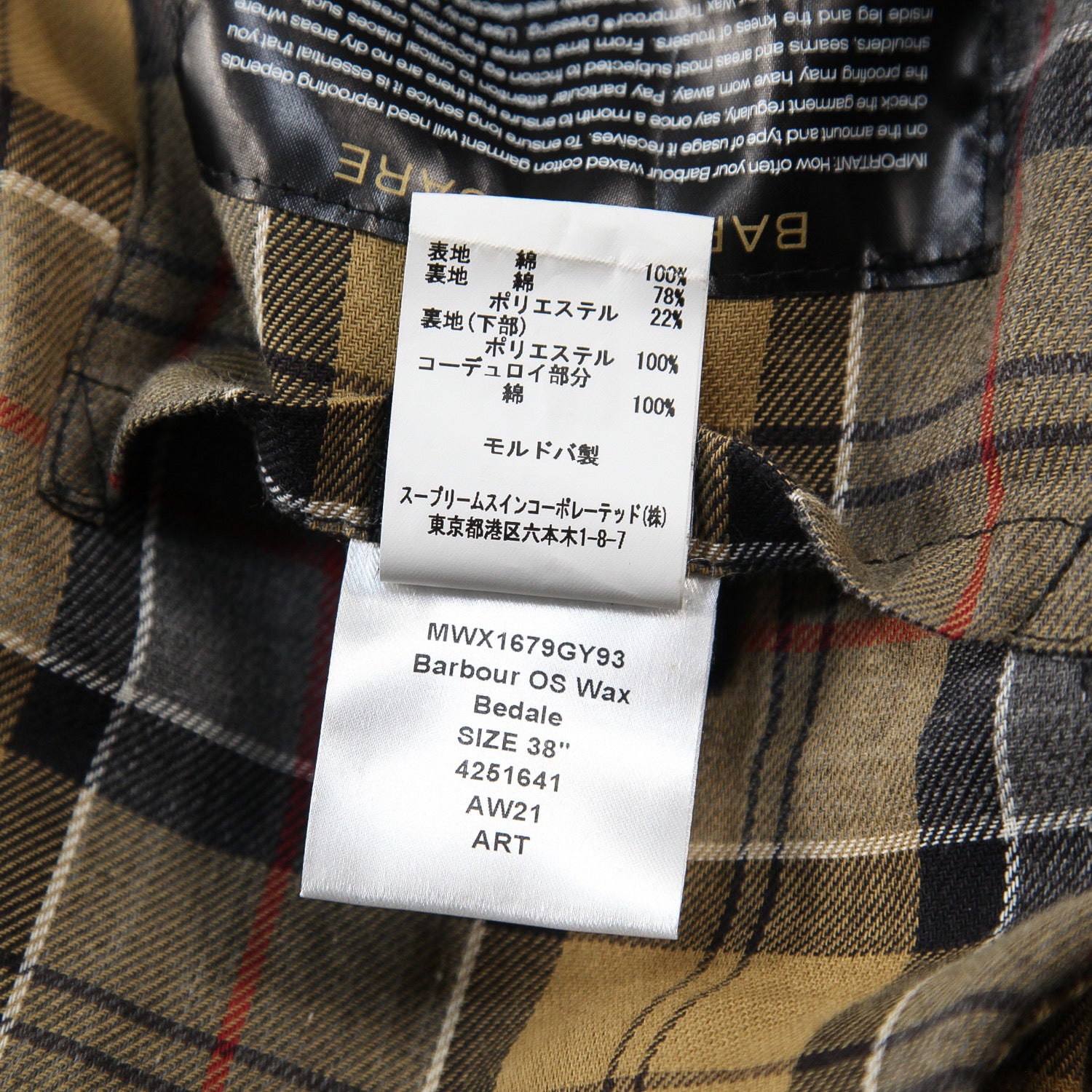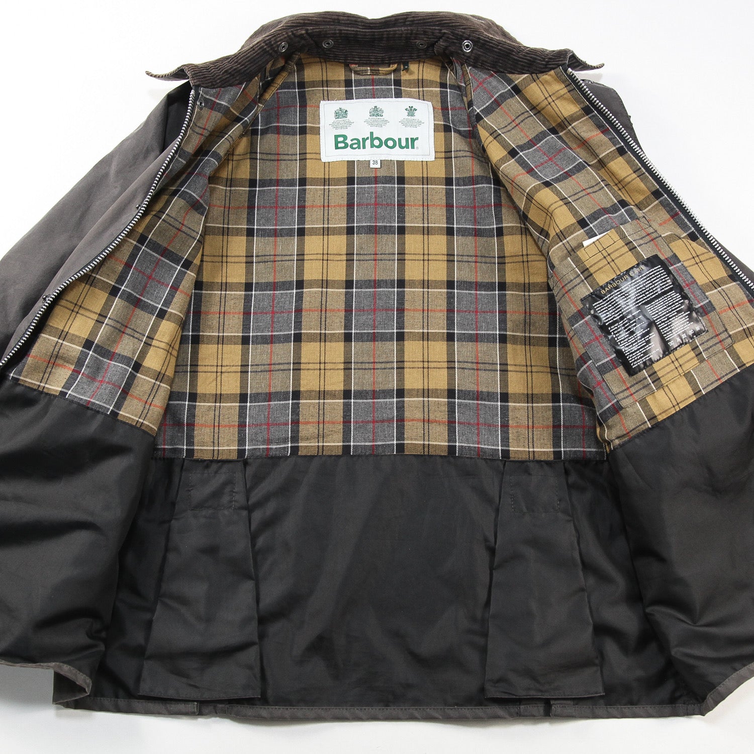 ショルダー部分はきれいなシルエットを演出するラグランスリーブ仕様で、裏地にはバブアーの伝統の証であるハウスタータンチェックがあしらわれています。