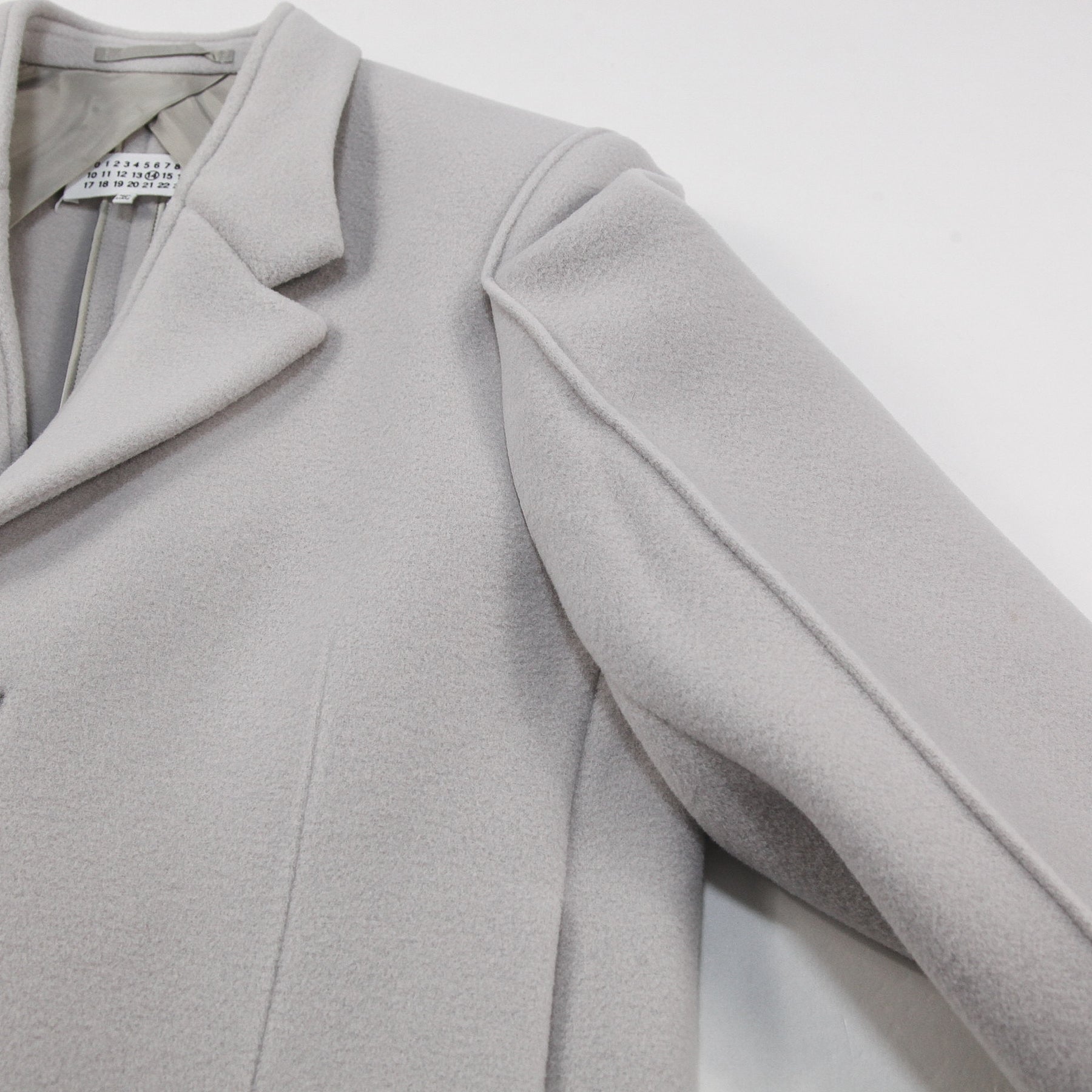 襟元はスタンドカラーのようなボリュームを抑えたパターンで、ラペルのみ立体感を出した特徴的なデザイン。