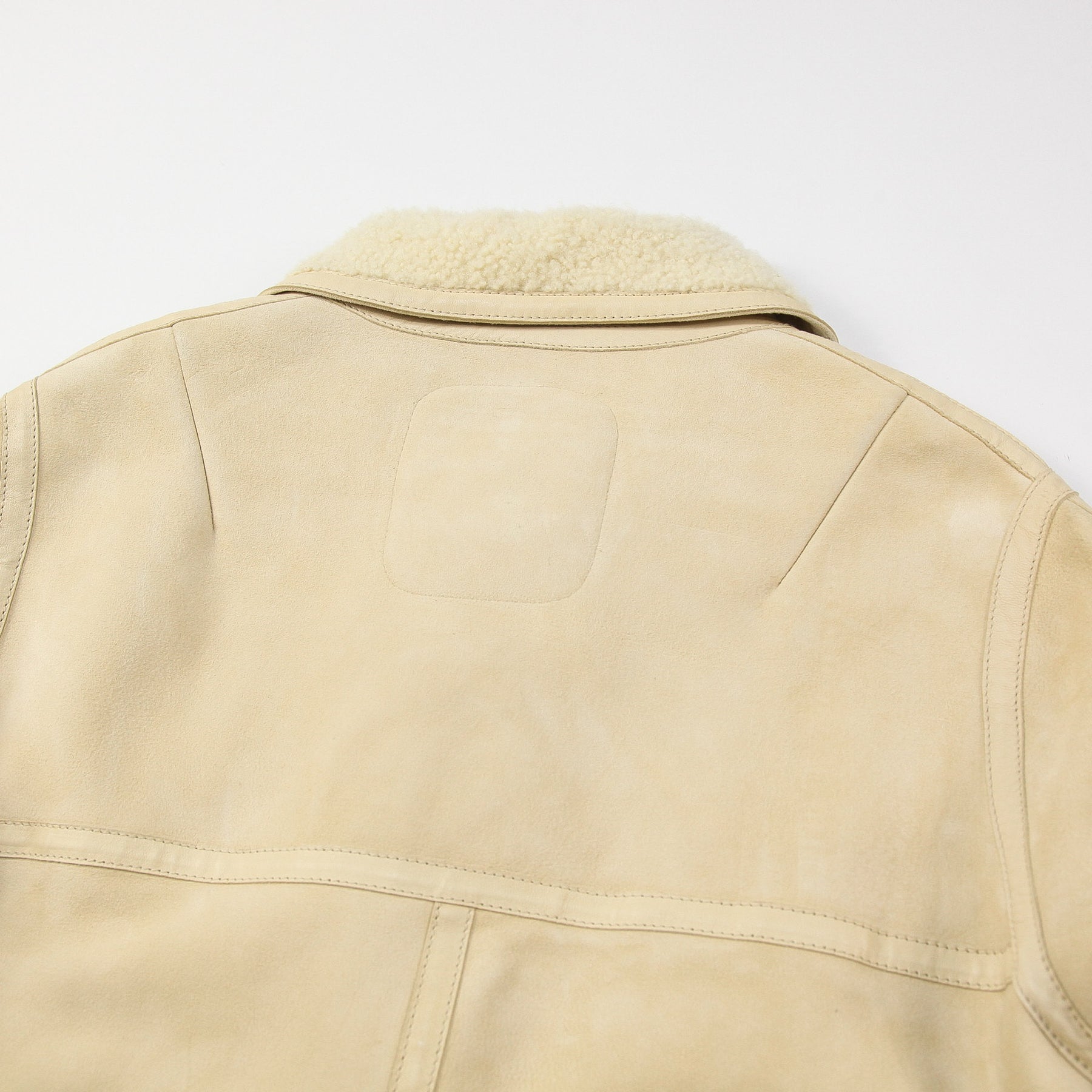 襟元から覗くムートン地が高級感を漂わせており、身頃や肩、腕や背面にあしらわれたレザーのトリムパイピングがデザインを引き締めています。