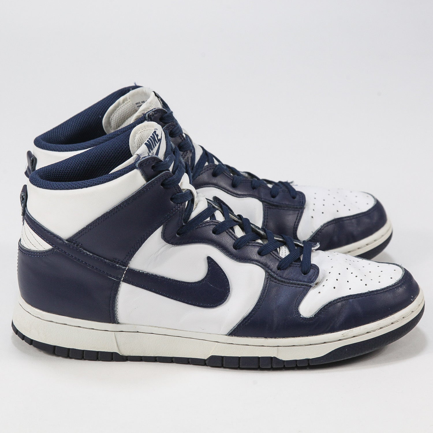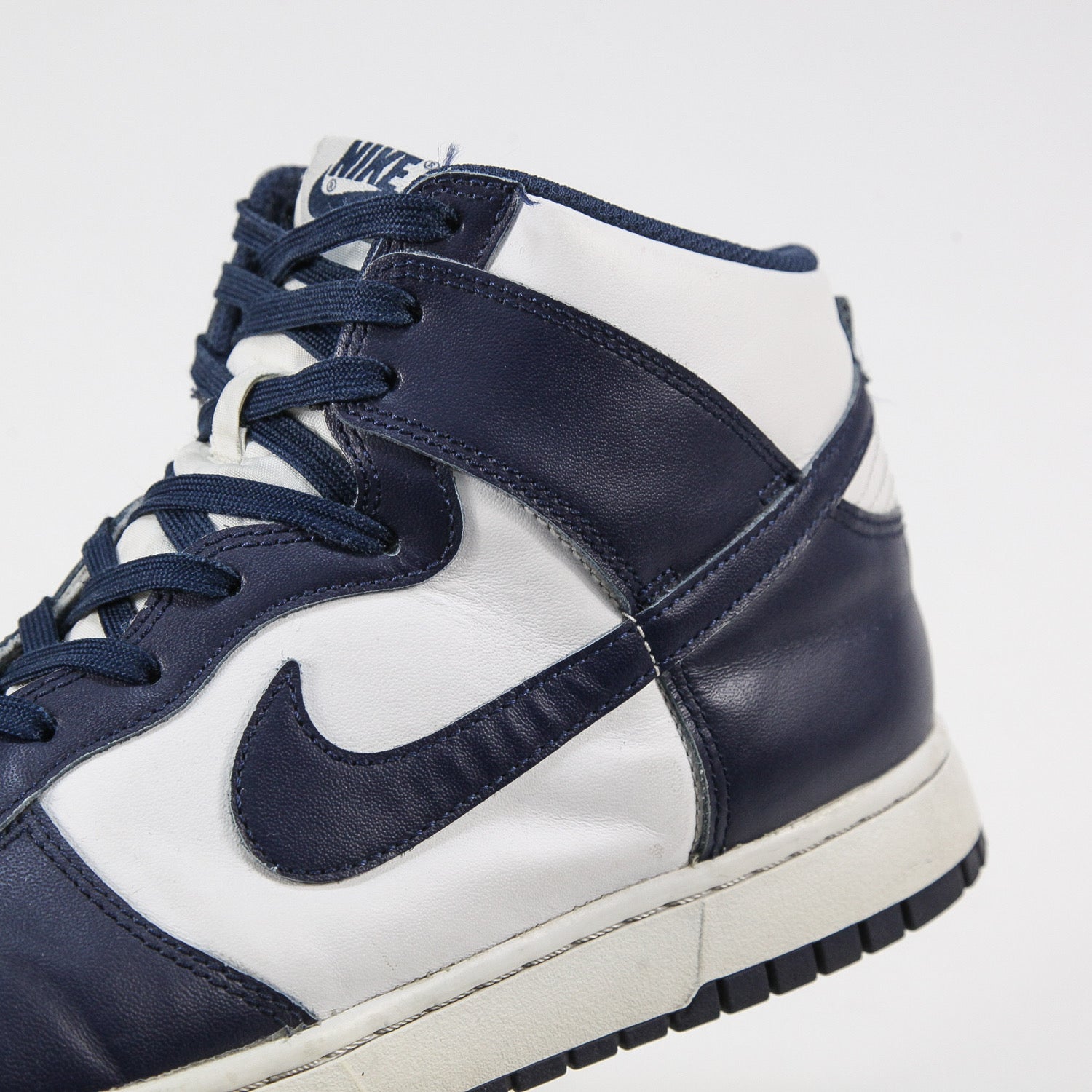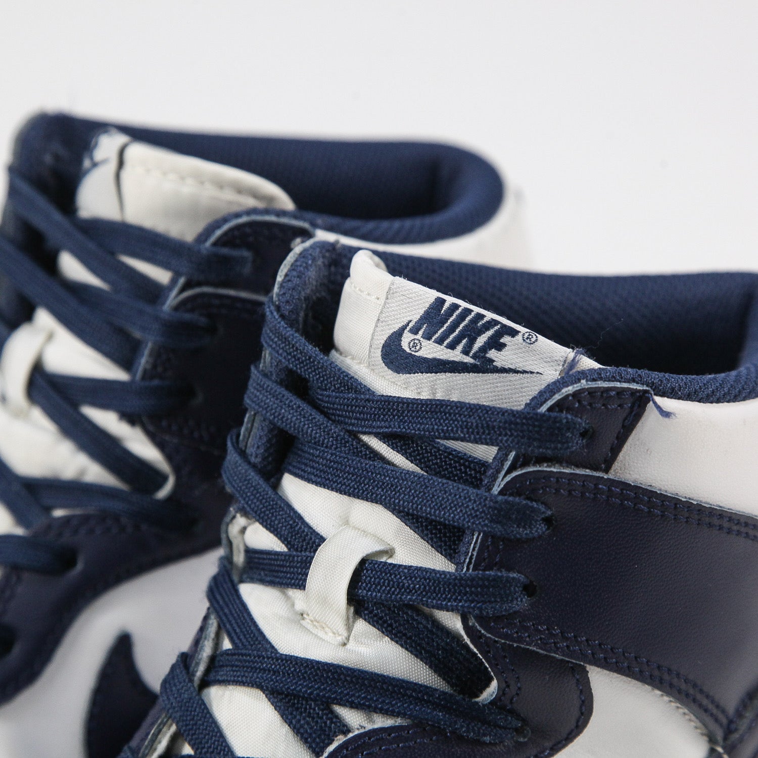 ホワイトカラーのレザーアッパーとミッドナイトネイビーのオーバーレイを組み合わせ、オリジナルカラーの一つであるビラノバ大学(Villanova)カラーに仕上げられた一足。