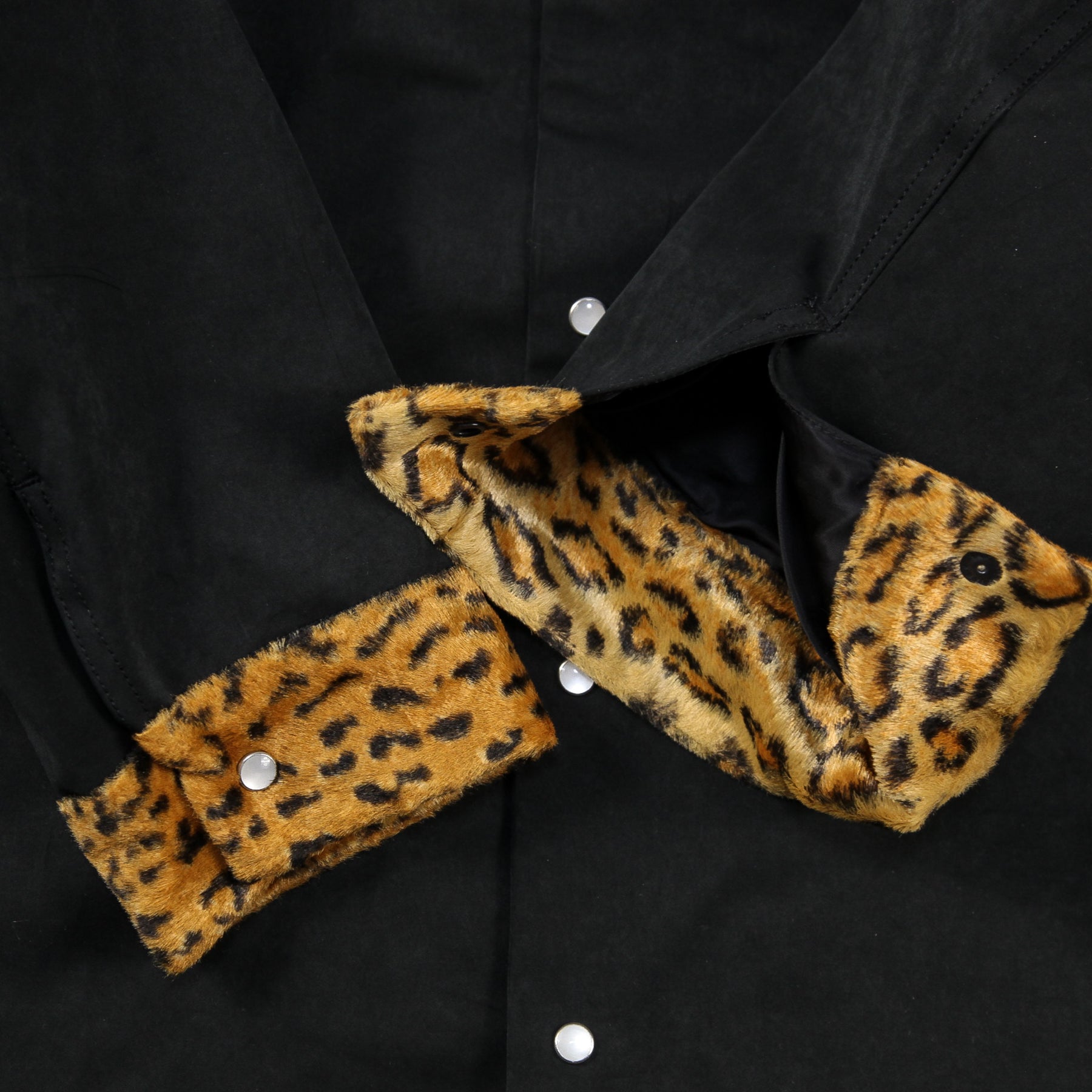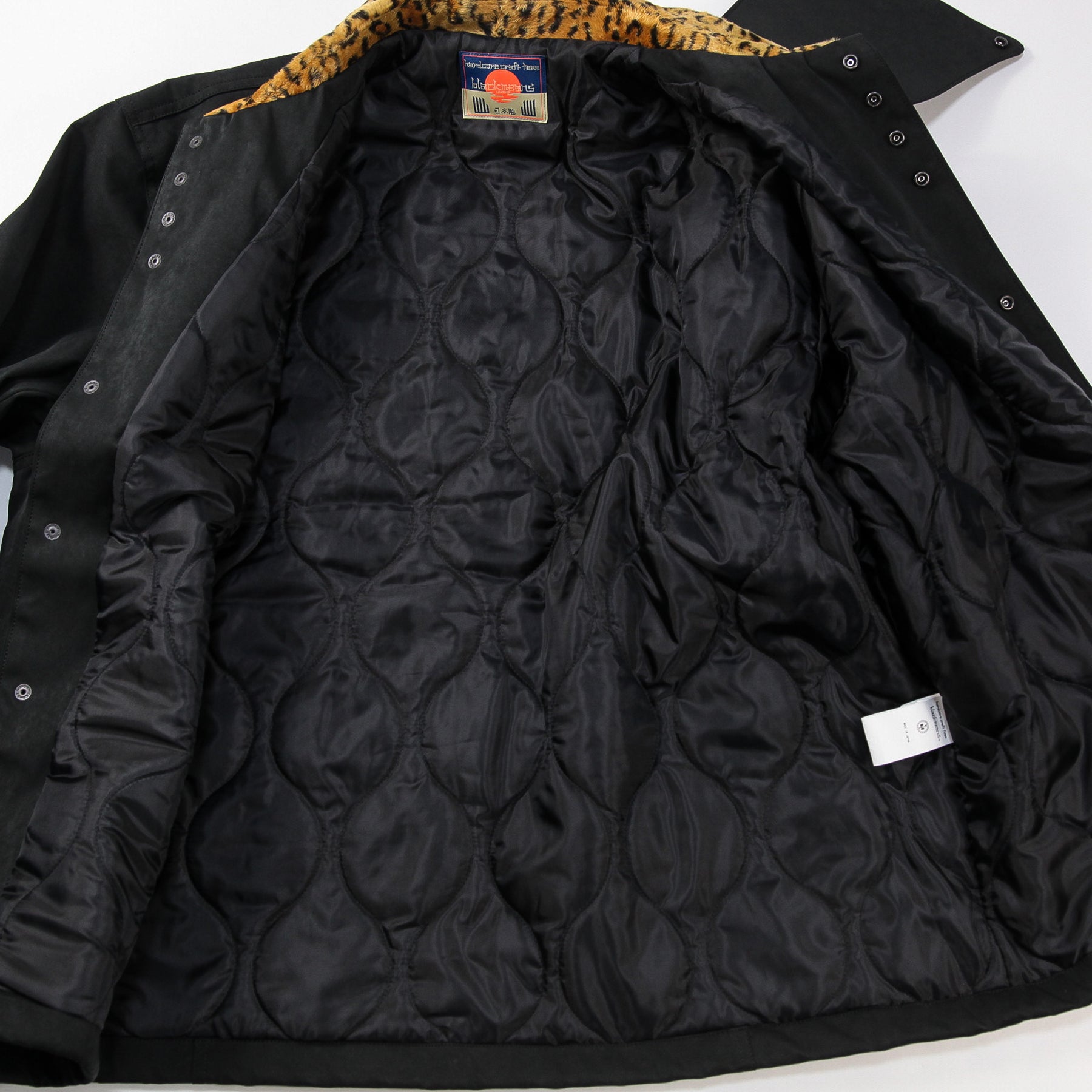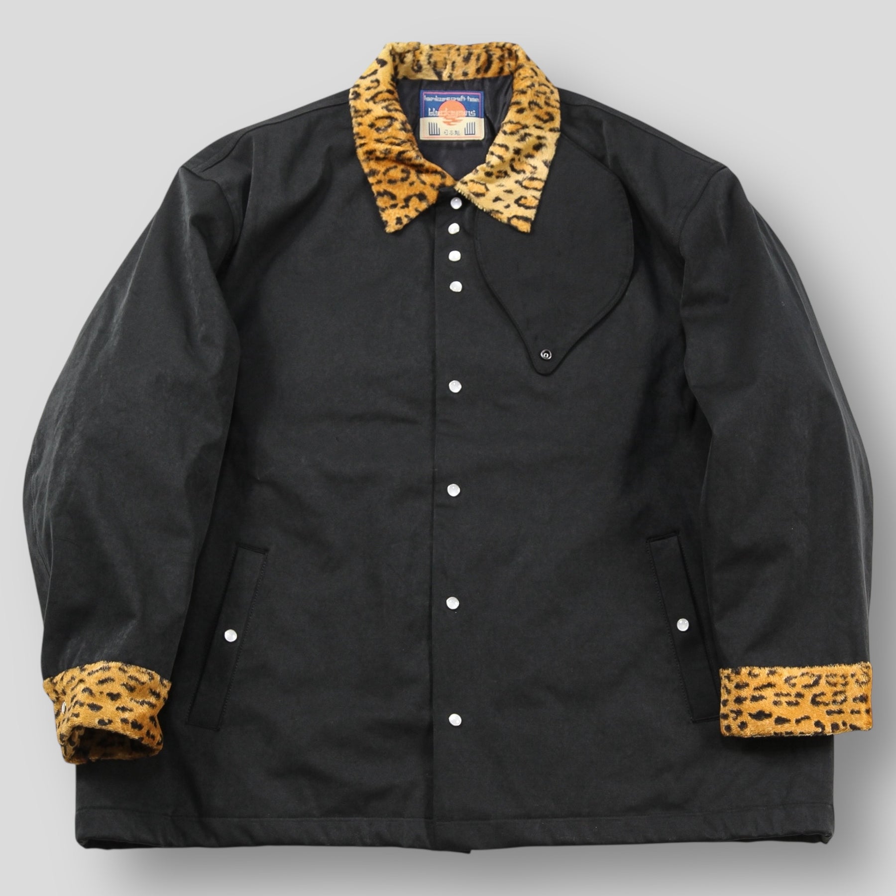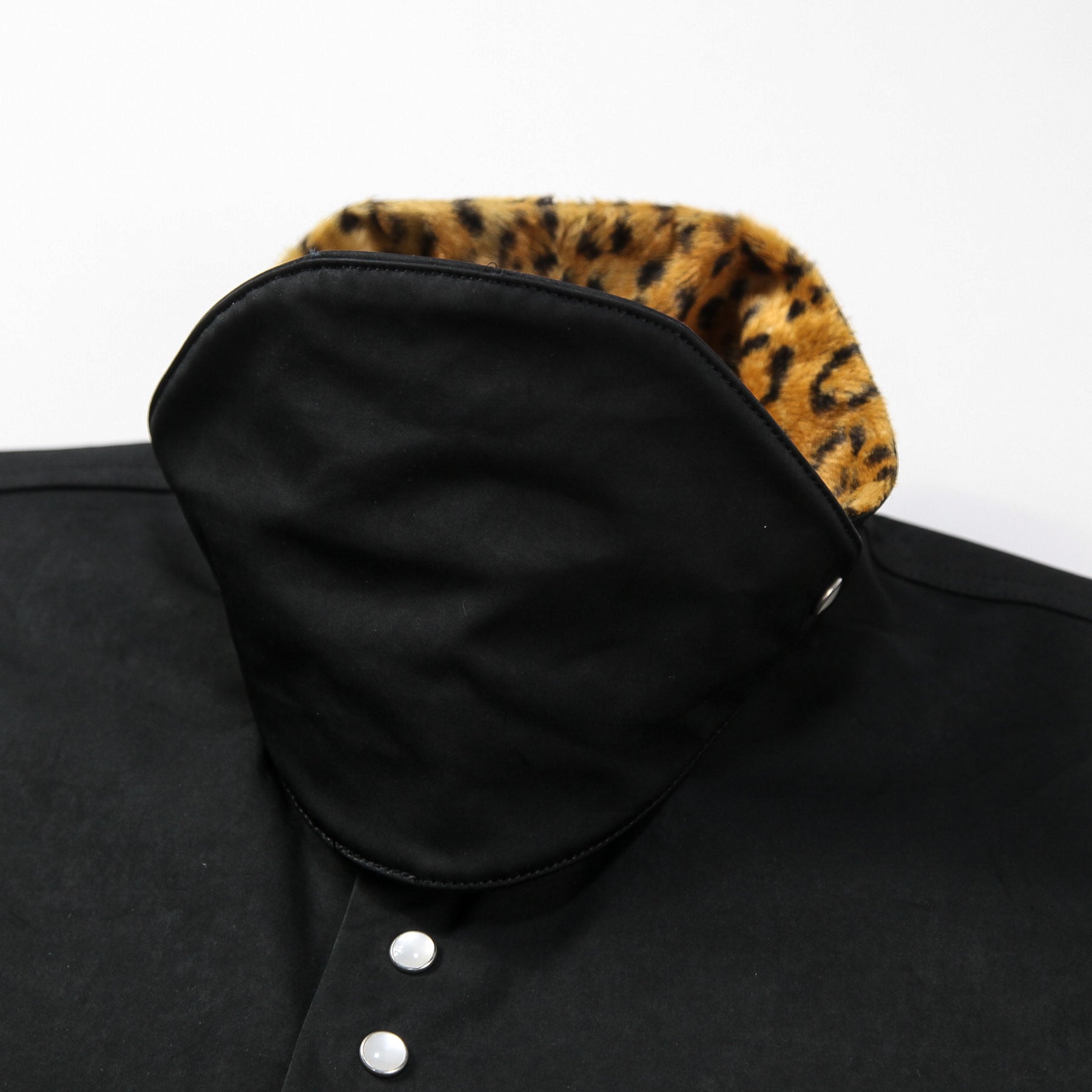衿と袖口はパイル地のレオパード柄で切り替えられており、滑りの良いキルティング裏地と中綿を入れた保温性の高い仕上がり。