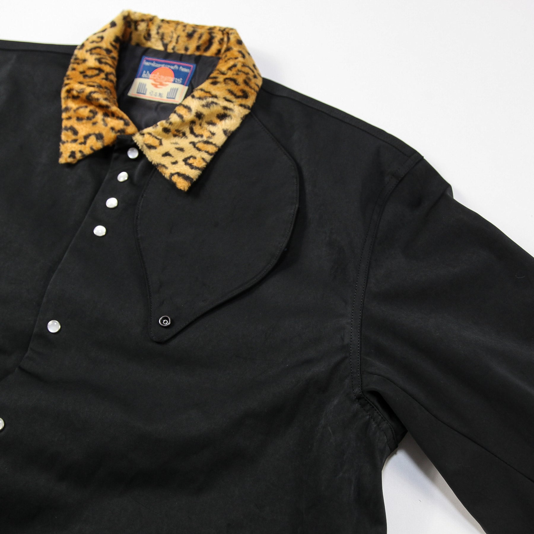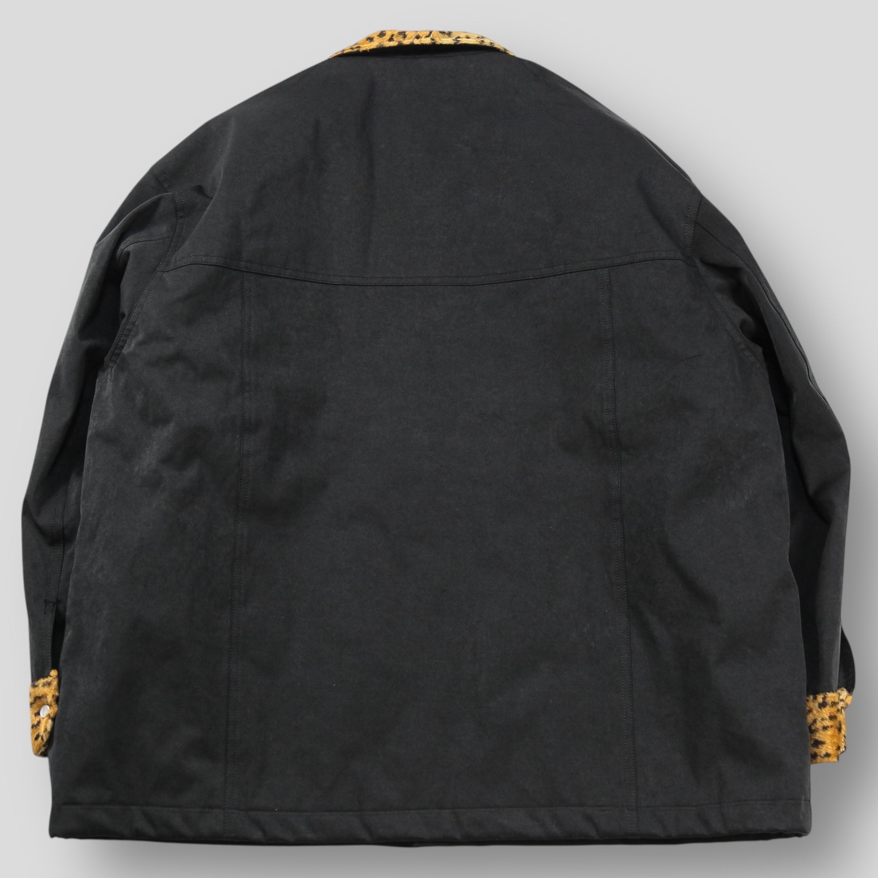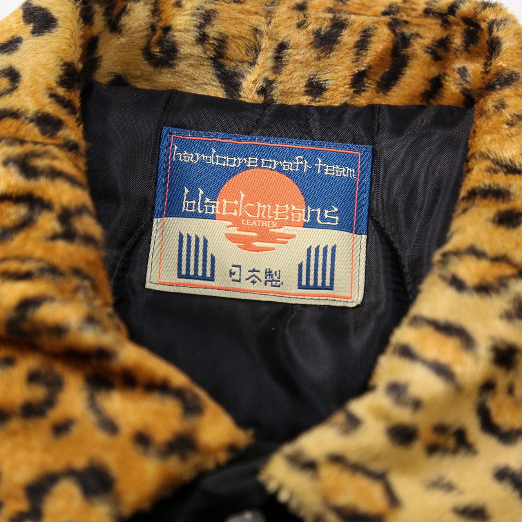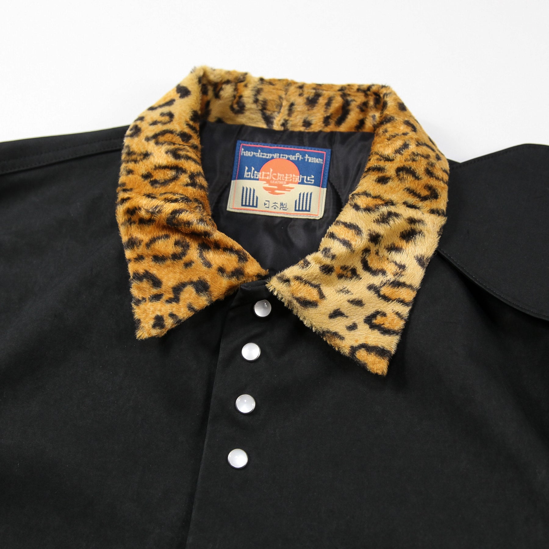 衿と袖口はパイル地のレオパード柄で切り替えられており、滑りの良いキルティング裏地と中綿を入れた保温性の高い仕上がり。