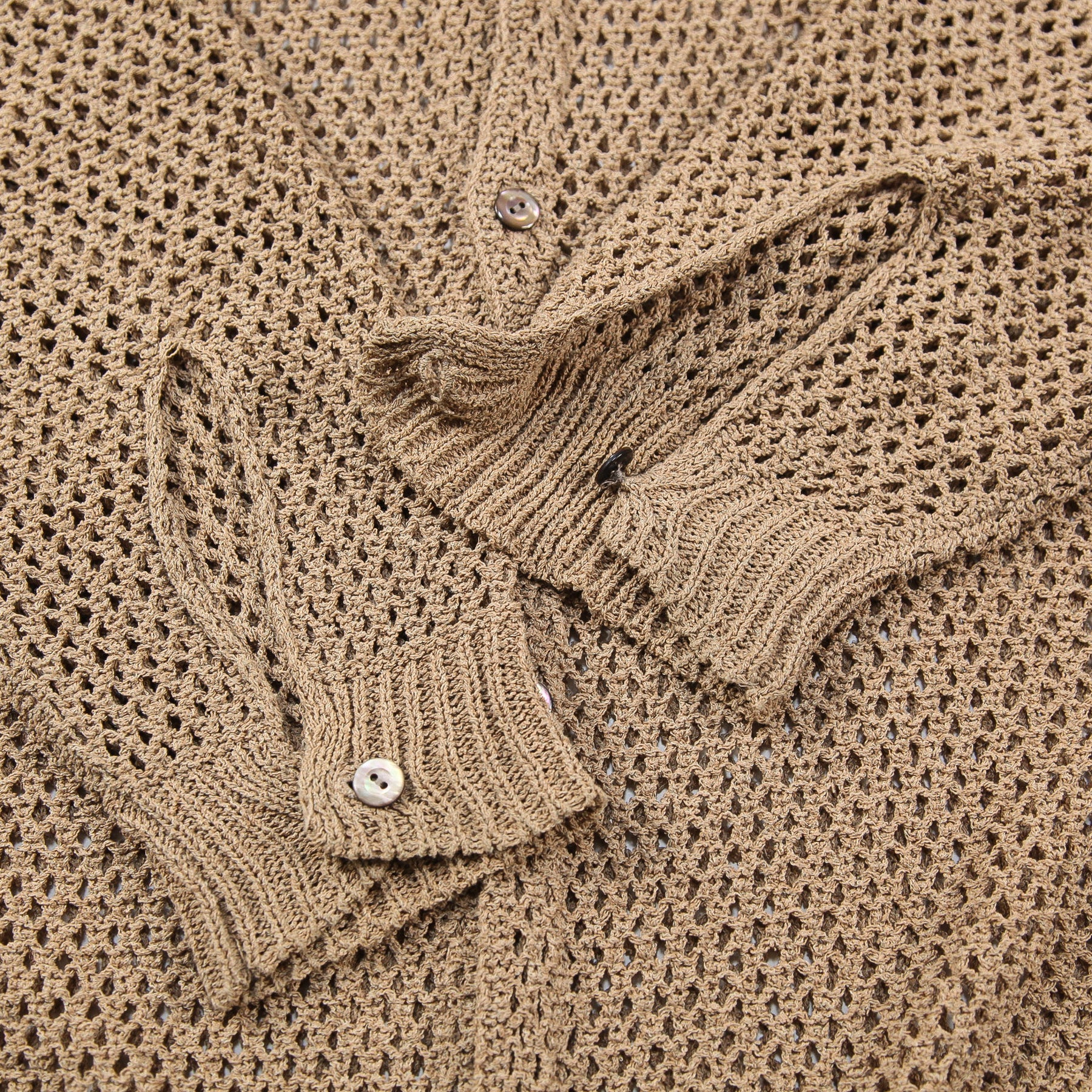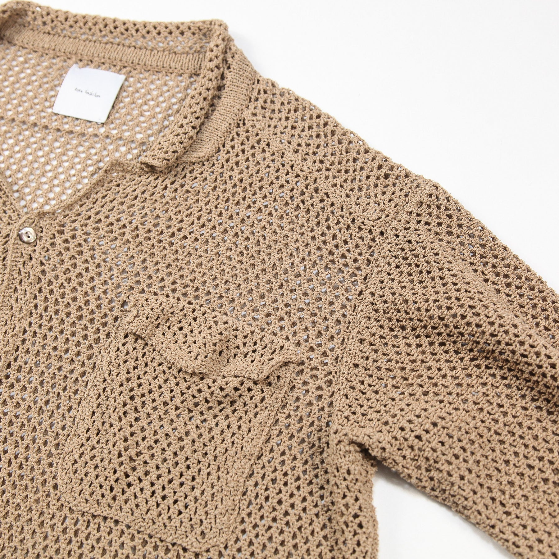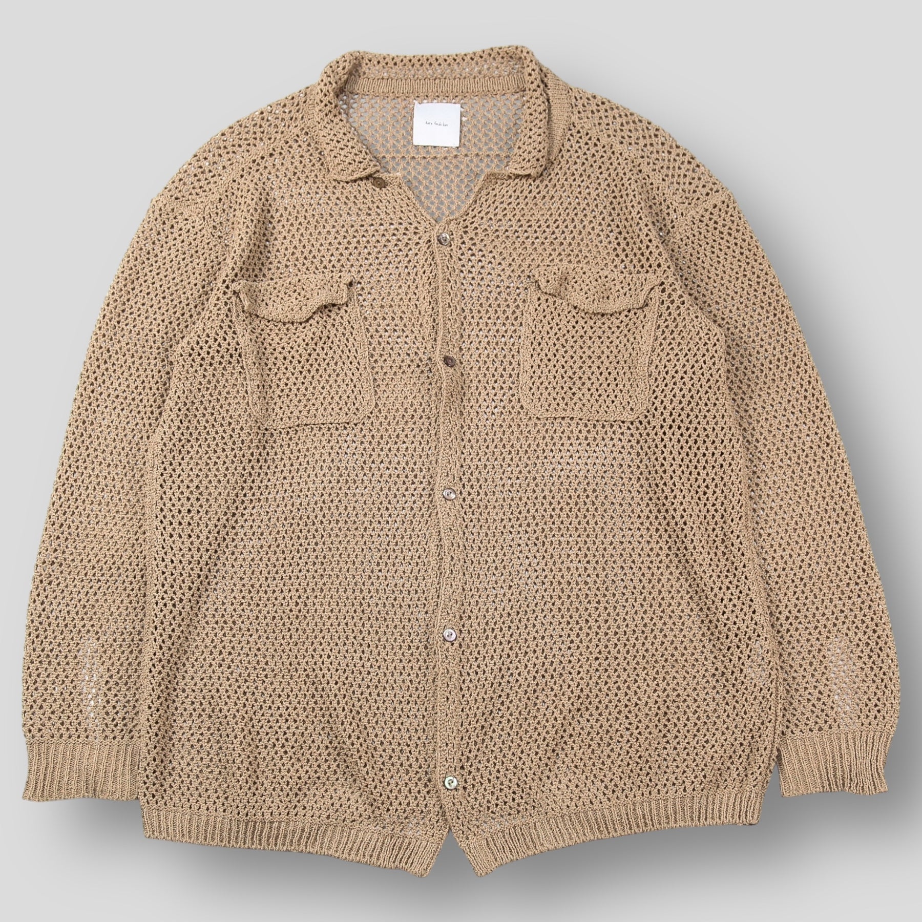 京都のTaiga Takahashiのお店で購入されたシャツの形をベースに、和紙とオーガニックコットン、リサイクルポリエステルの糸で編み立てられたニットシャツ。