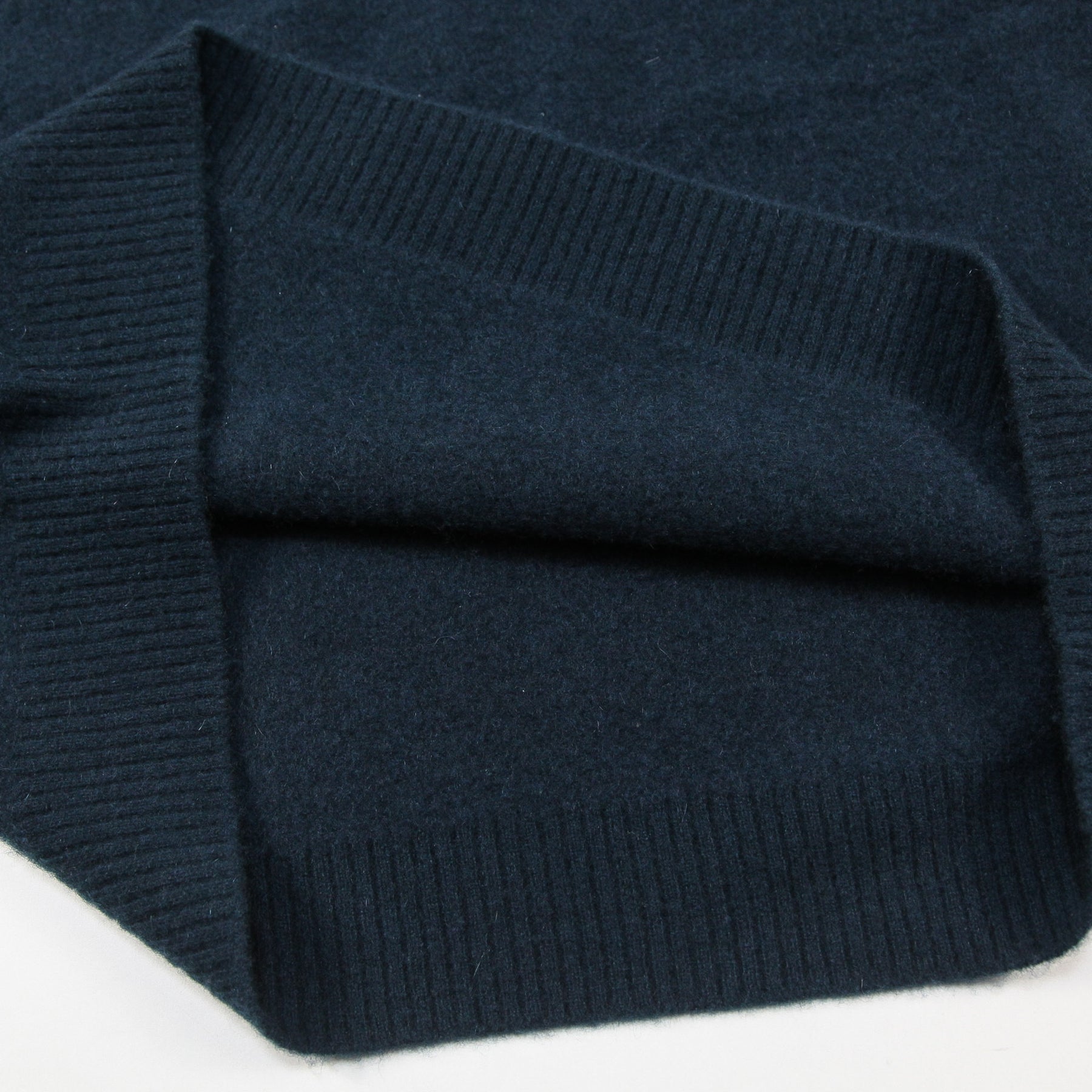 モンゴル産の最高級ピュアカシミアを使用し、約1.5倍程のサイズで編み立ててから職人一人一人の手作業によって縮絨させた密度の高いニット。