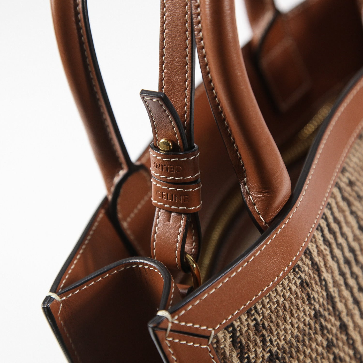 チェック柄のツイードテキスタイルをメインに使用し、「CELINE PARIS」のロゴを刺繍であしらったアイコニックな仕上がり。