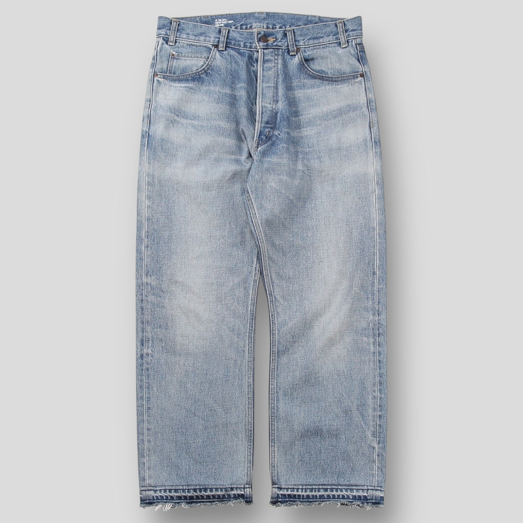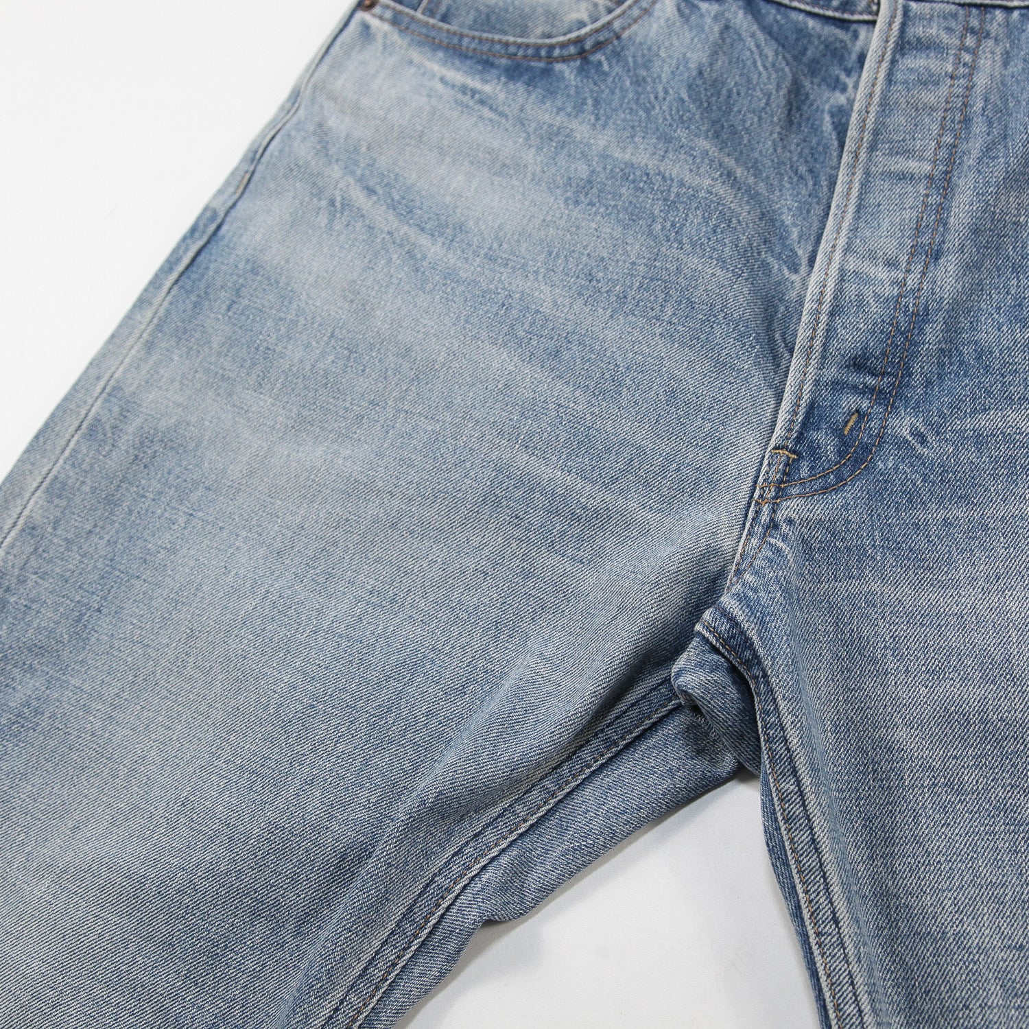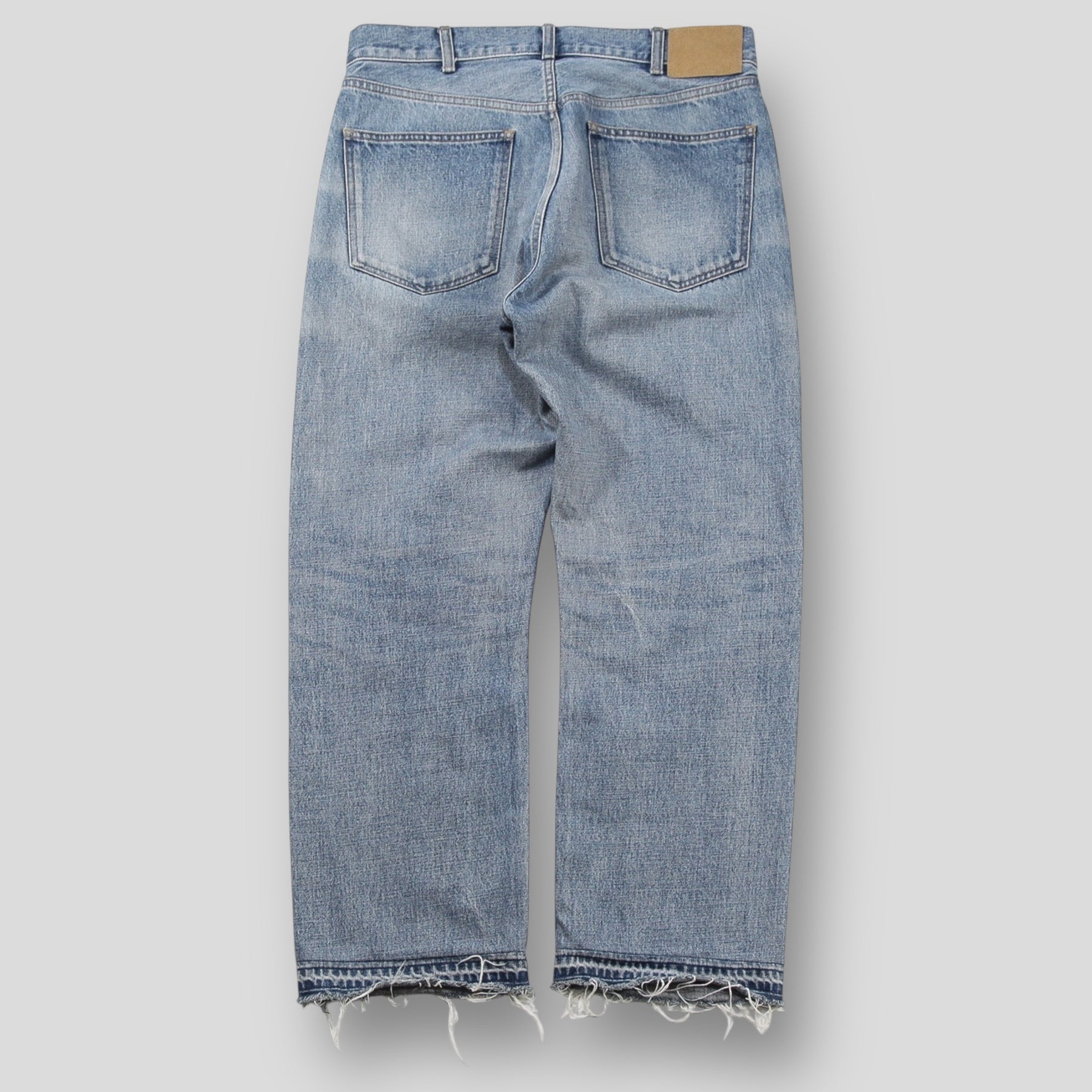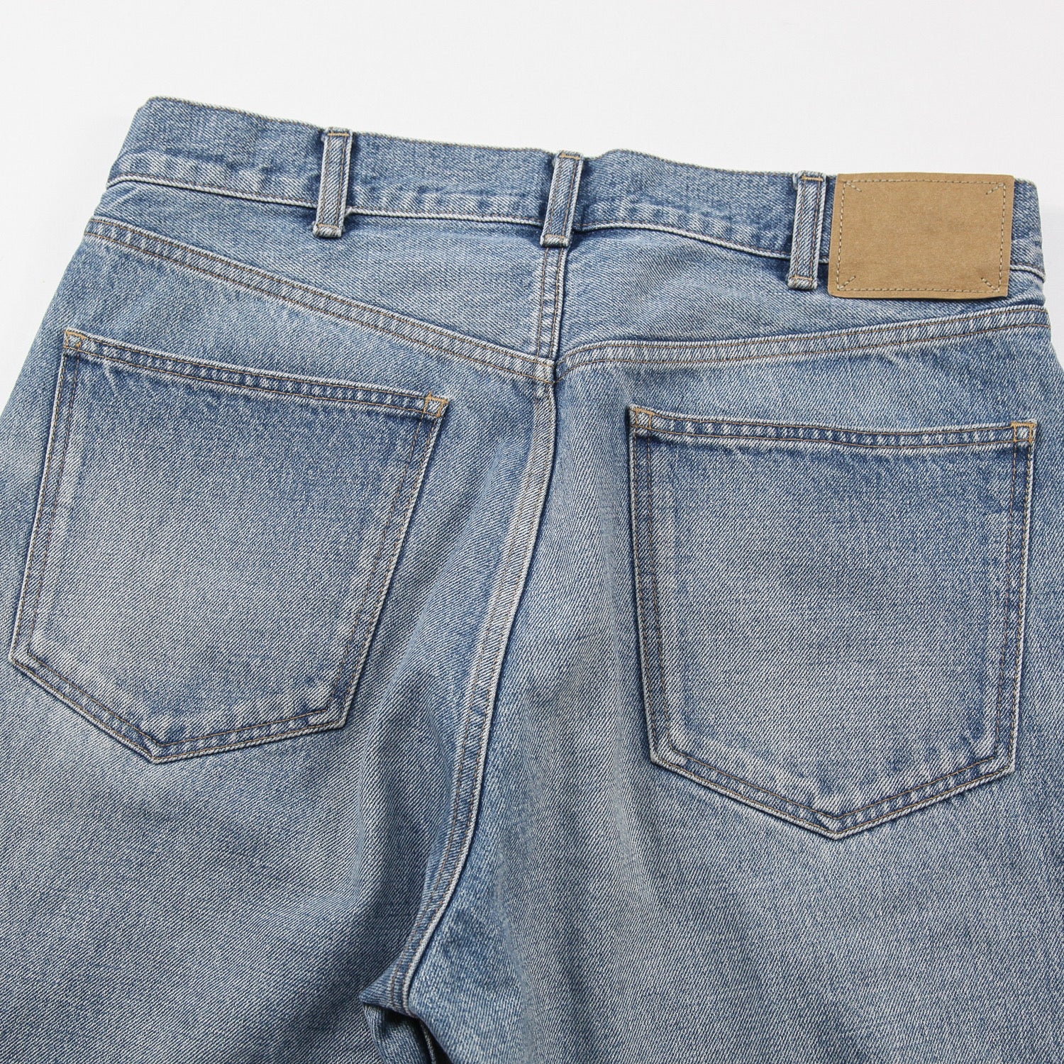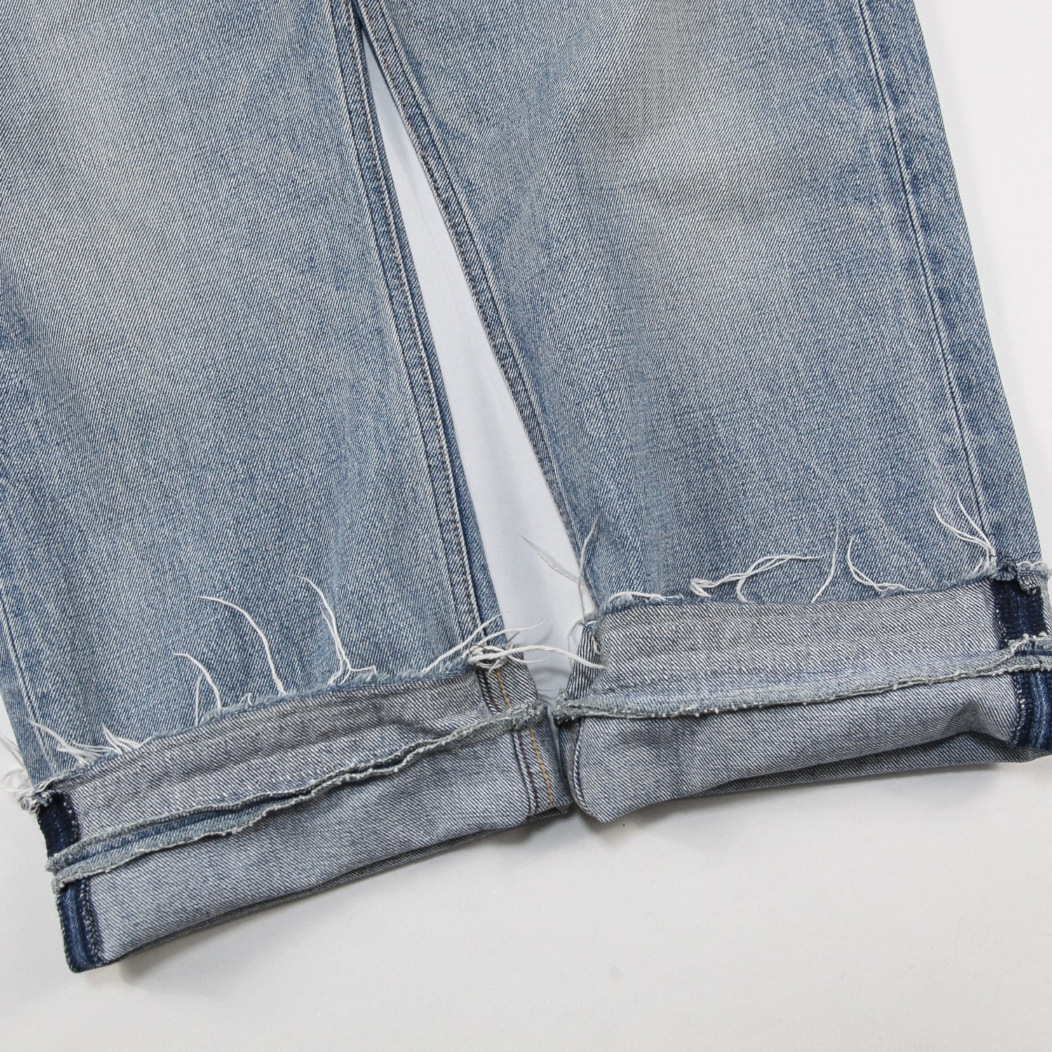 淡いブルーカラーを残したピズモウォッシュ仕上げで、裾のカットオフディテールが特徴的なデザイン。