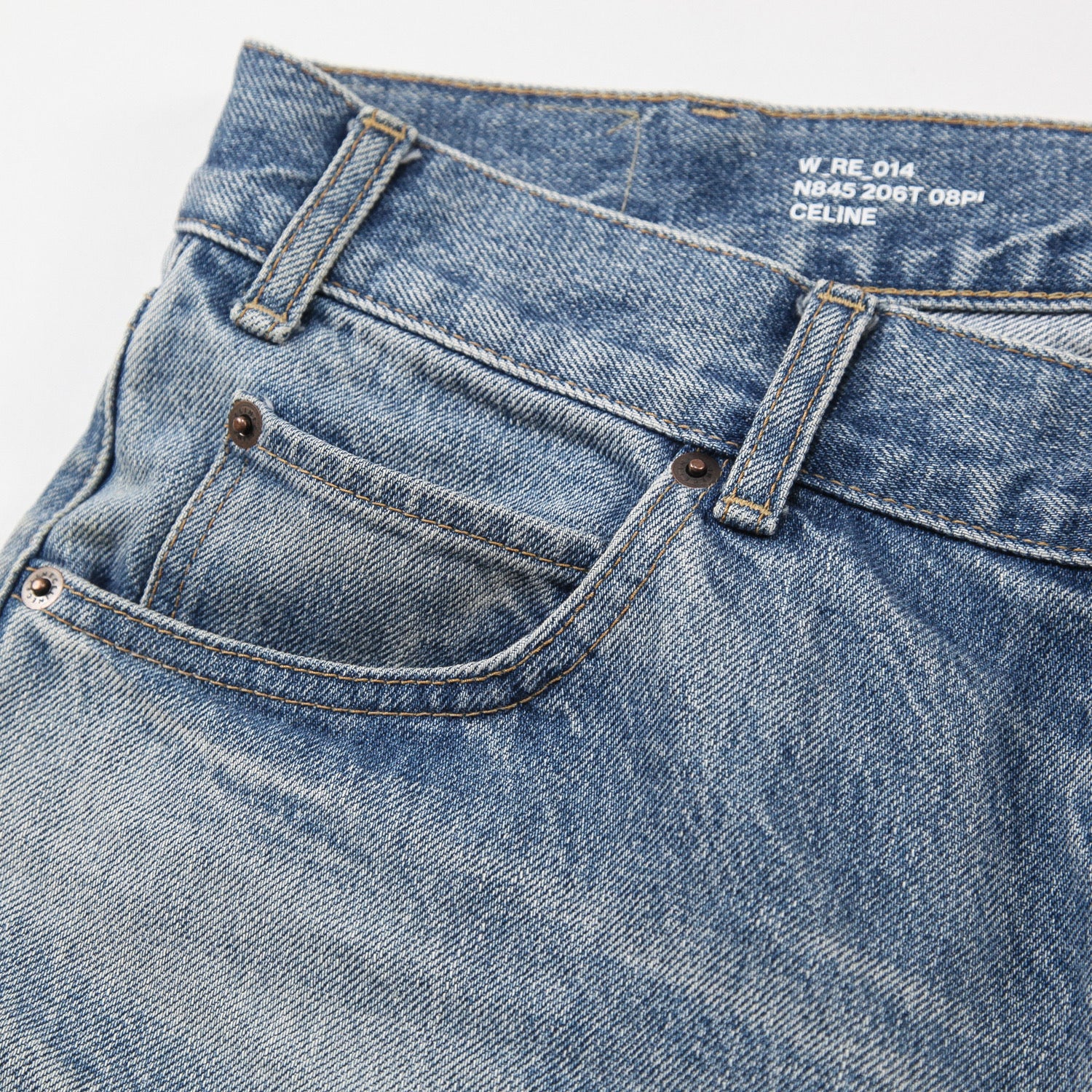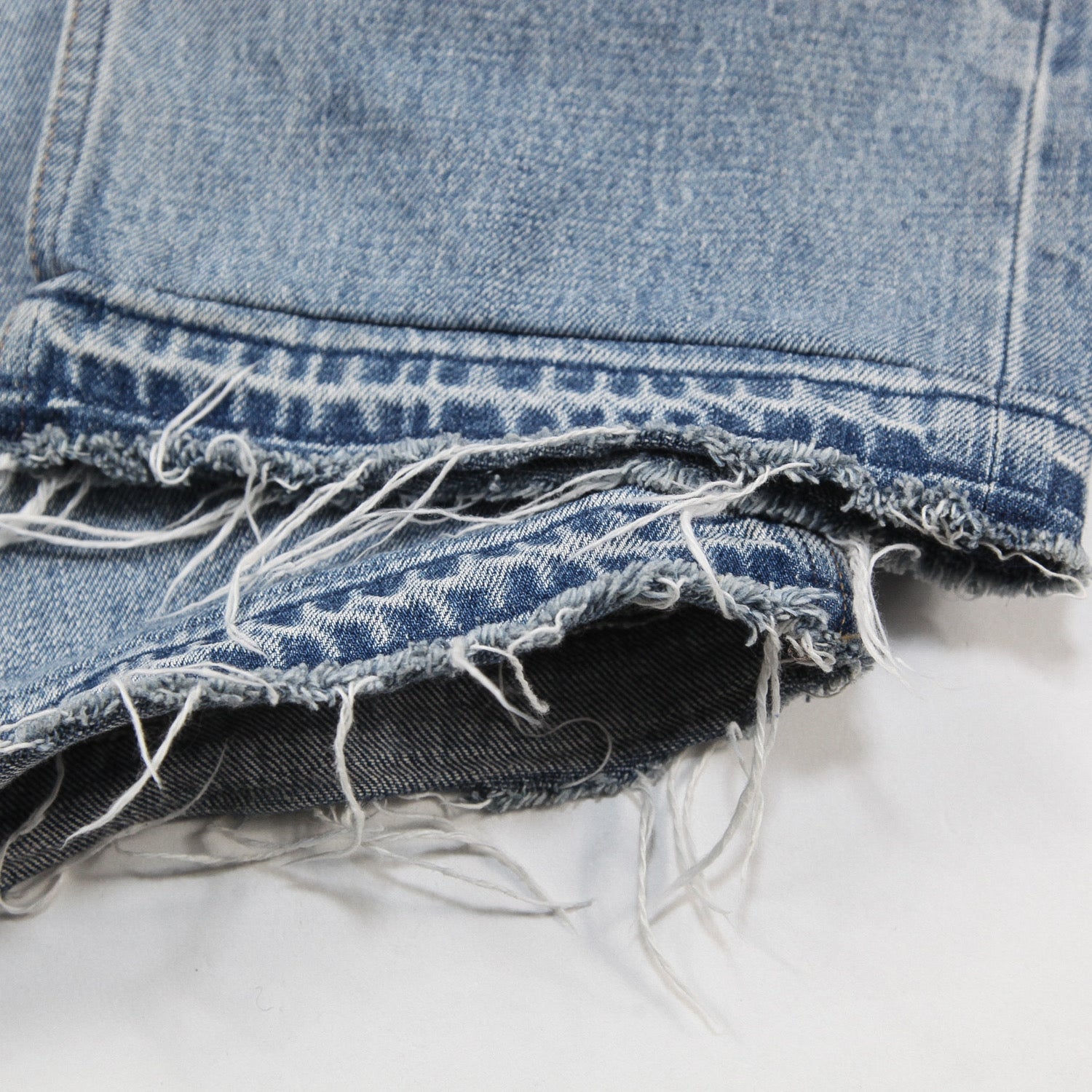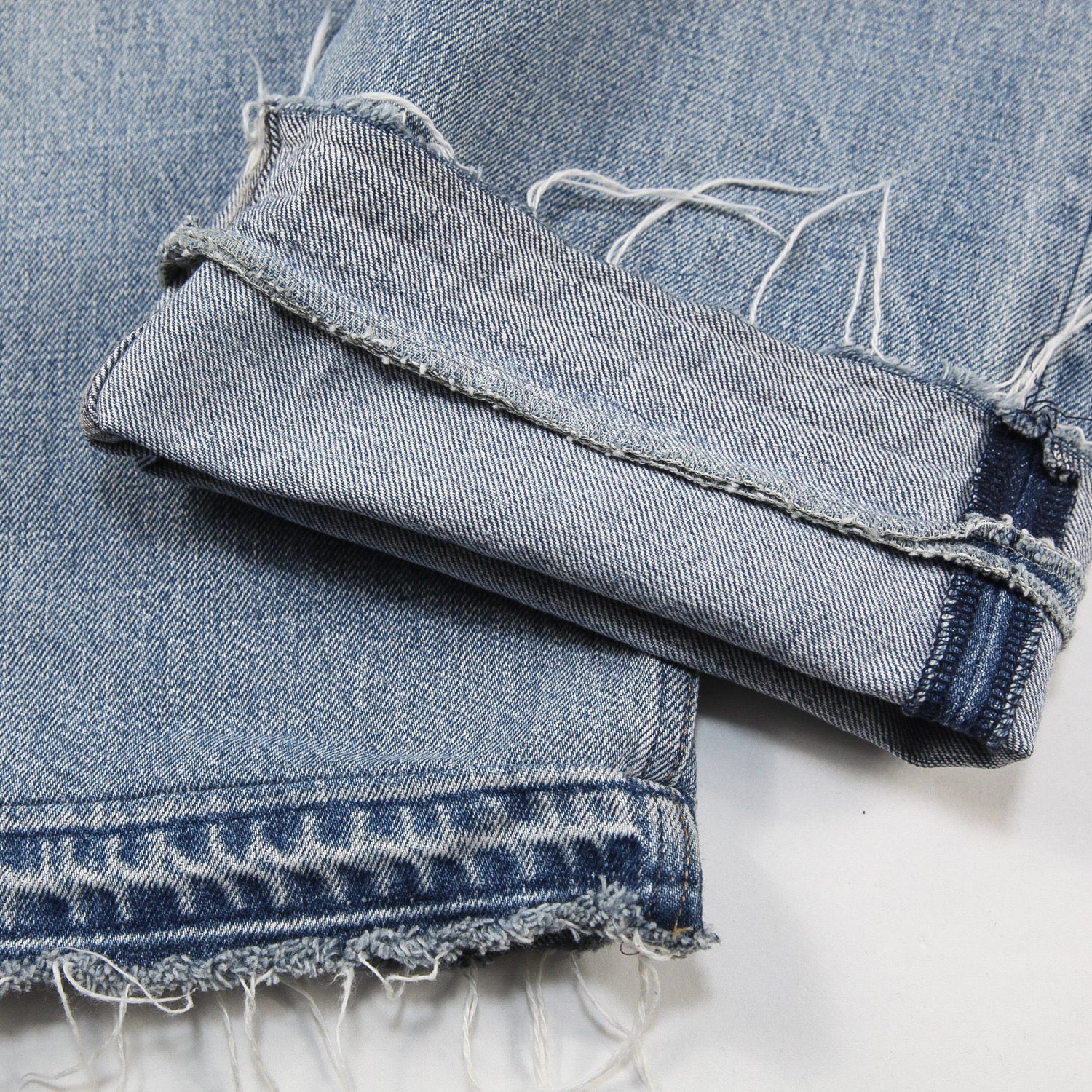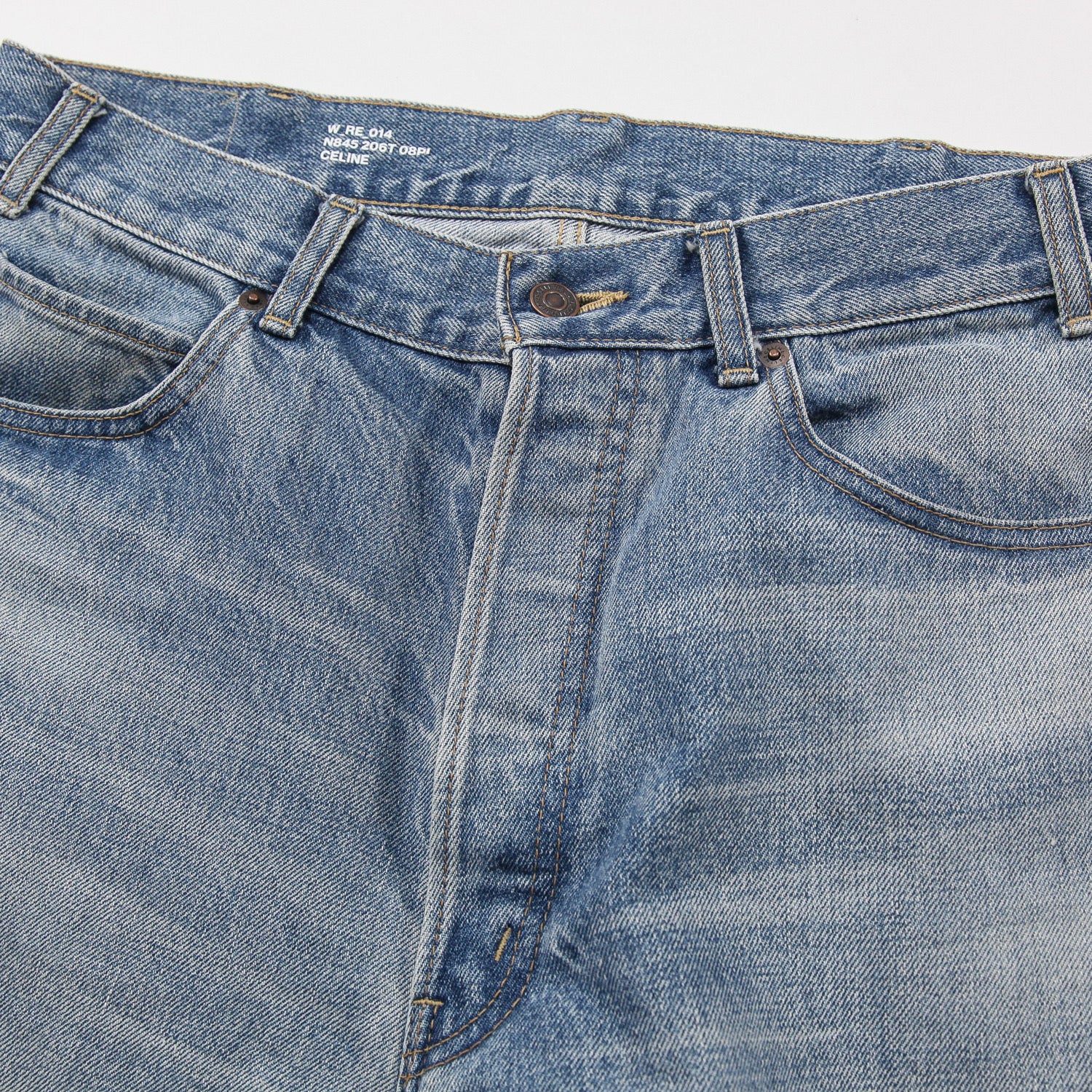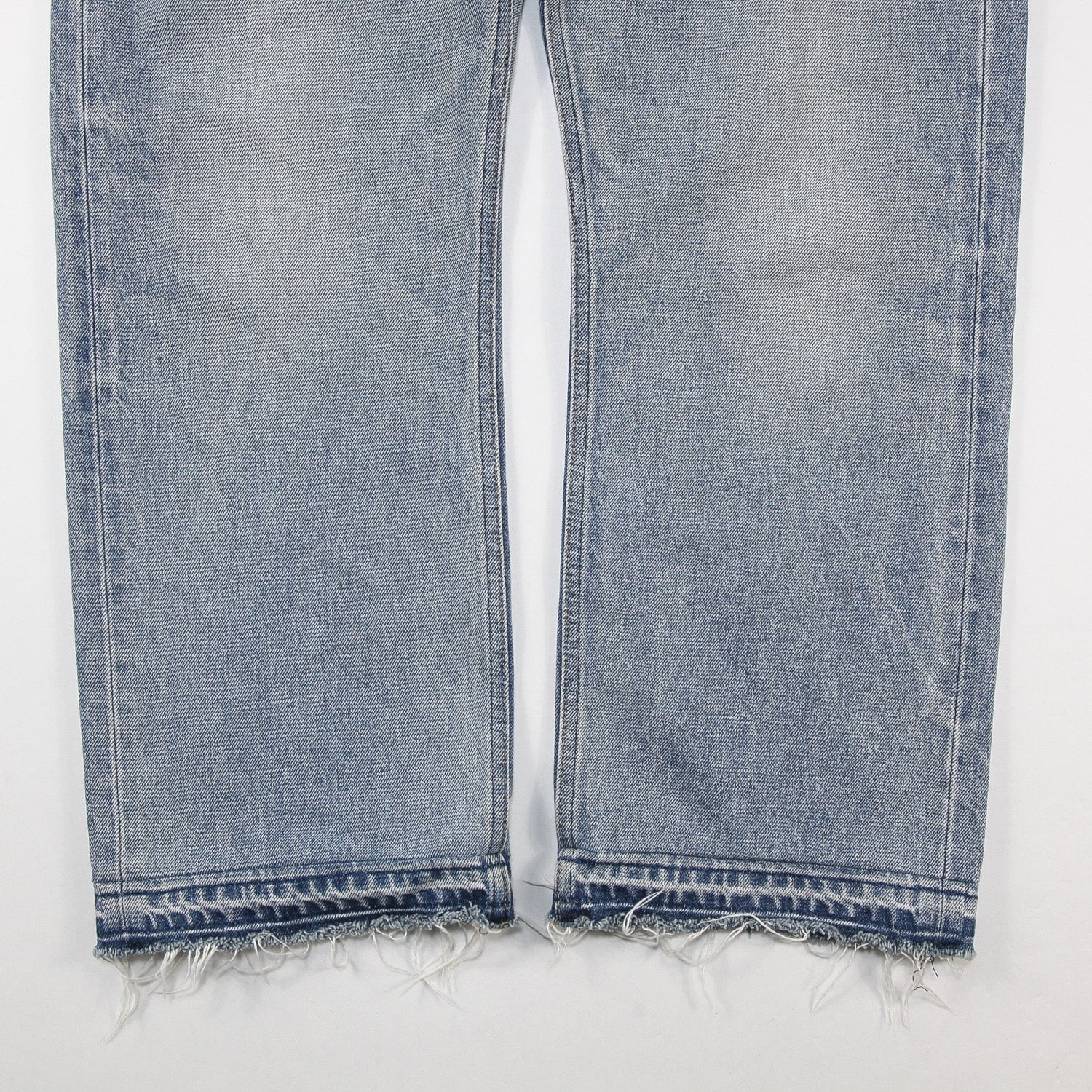 淡いブルーカラーを残したピズモウォッシュ仕上げで、裾のカットオフディテールが特徴的なデザイン。