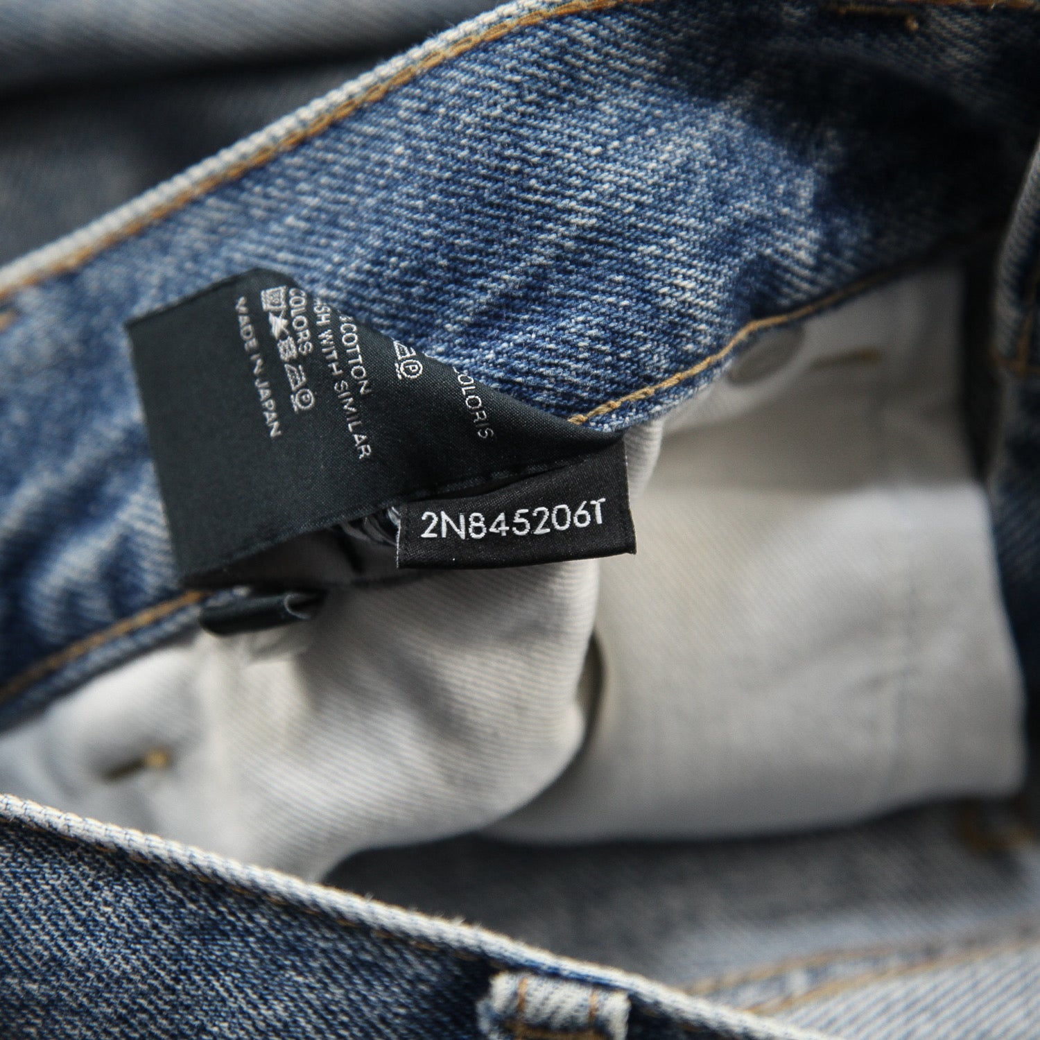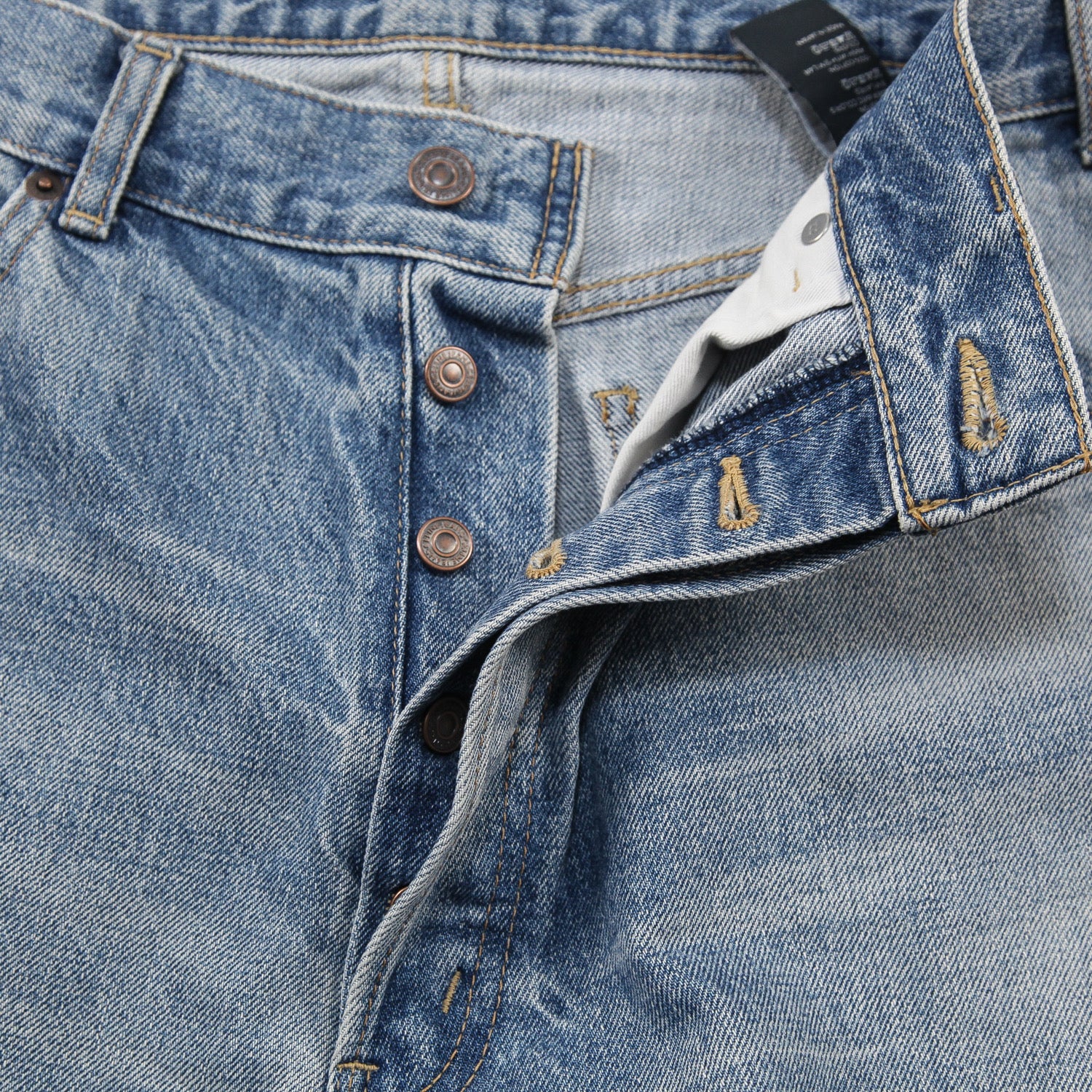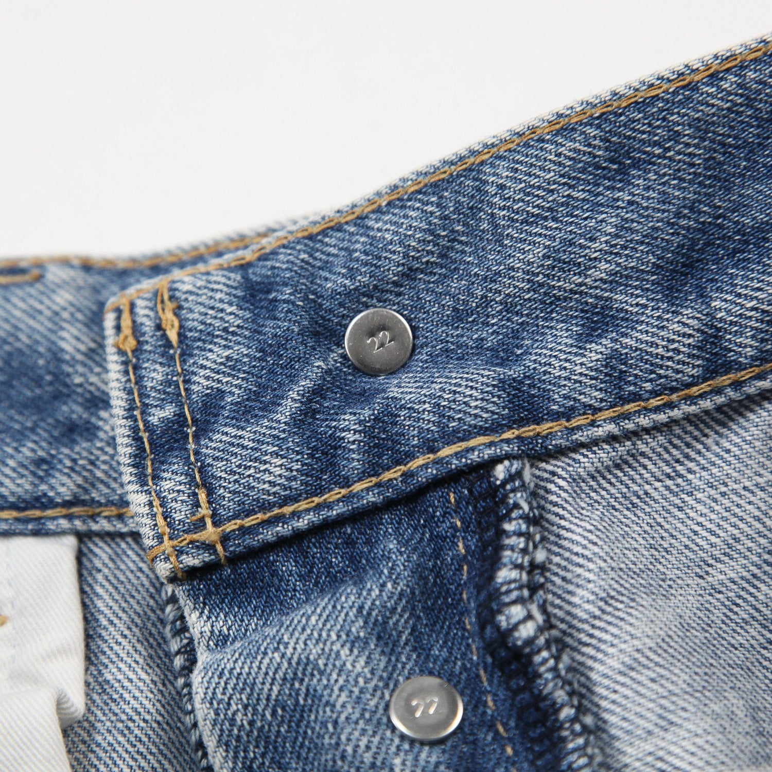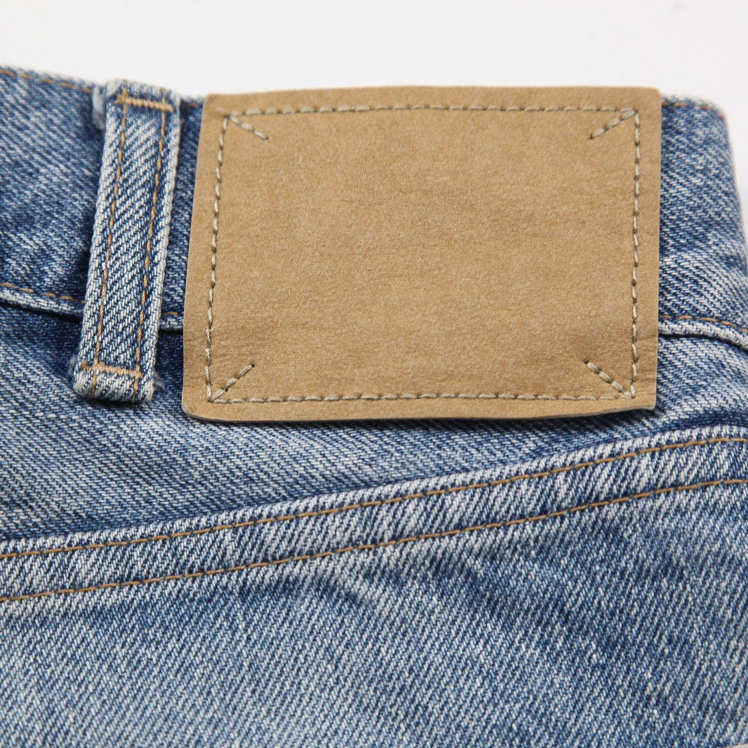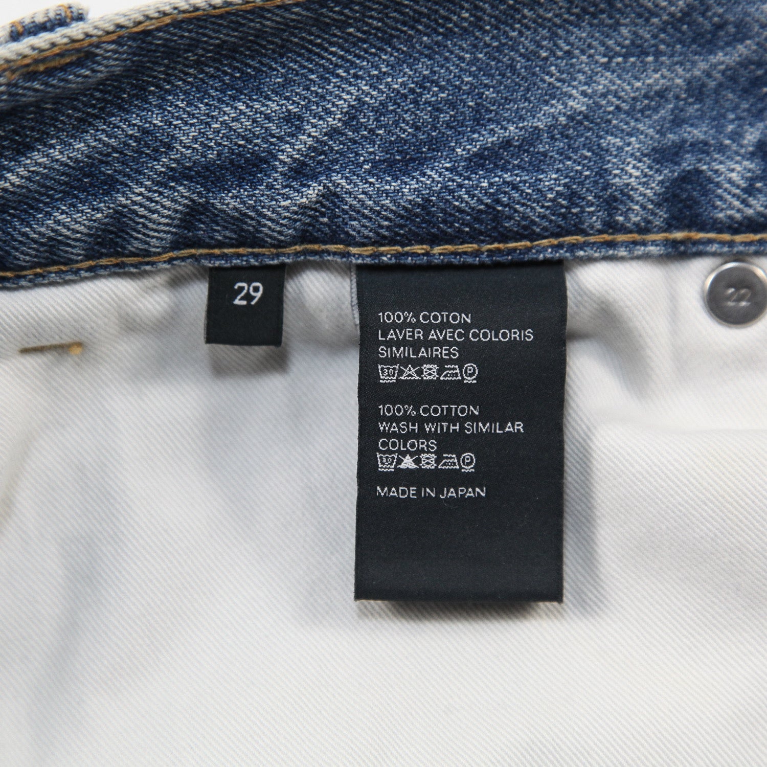淡いブルーカラーを残したピズモウォッシュ仕上げで、裾のカットオフディテールが特徴的なデザイン。