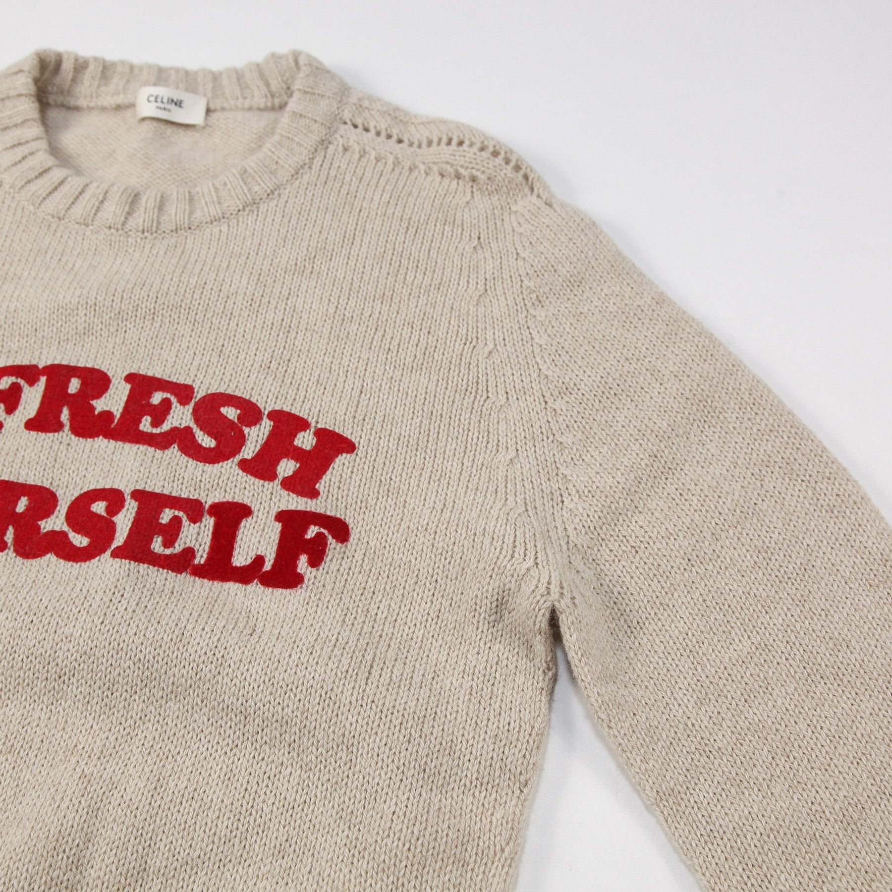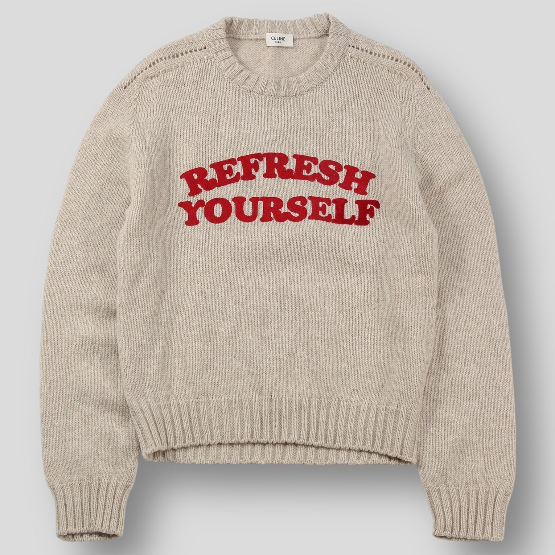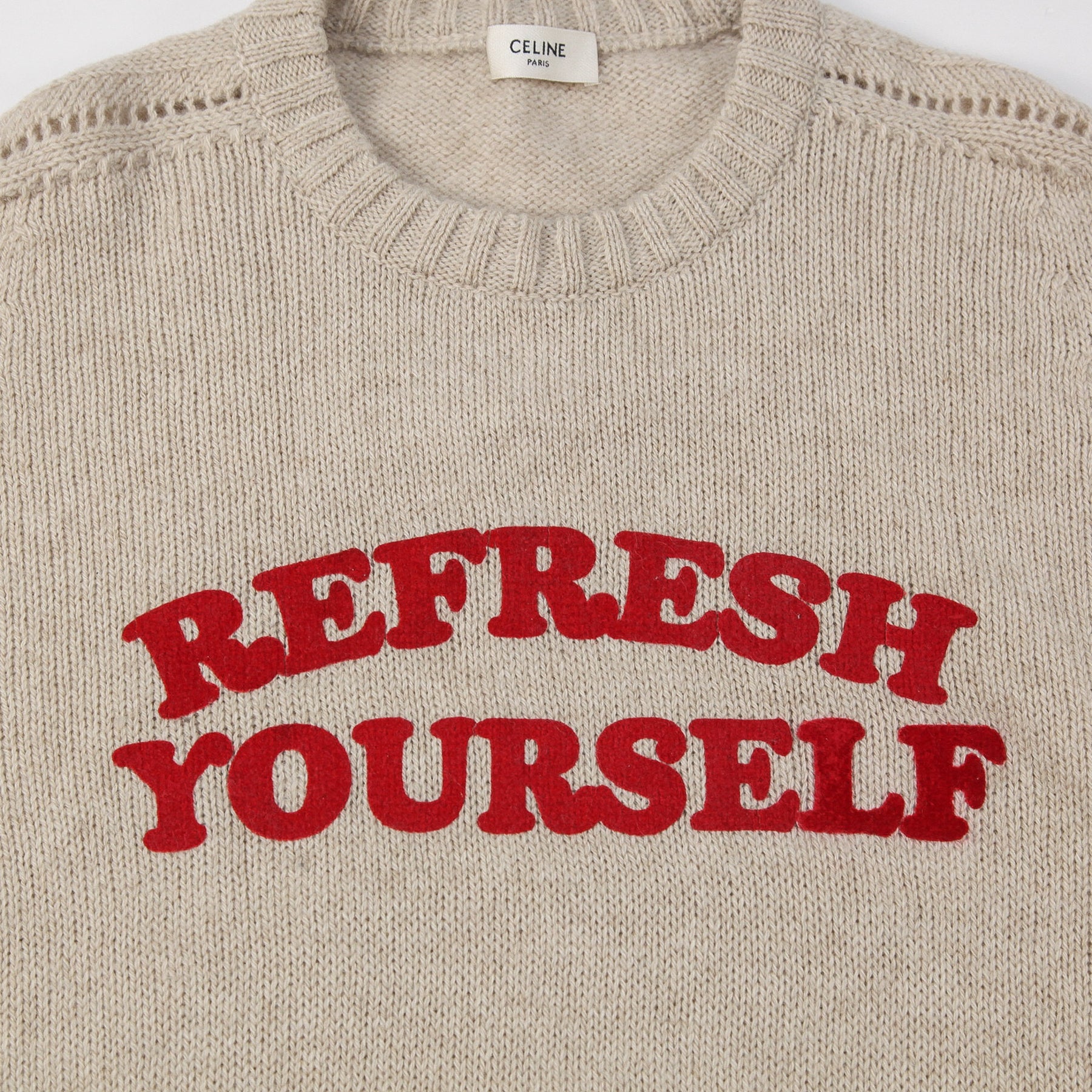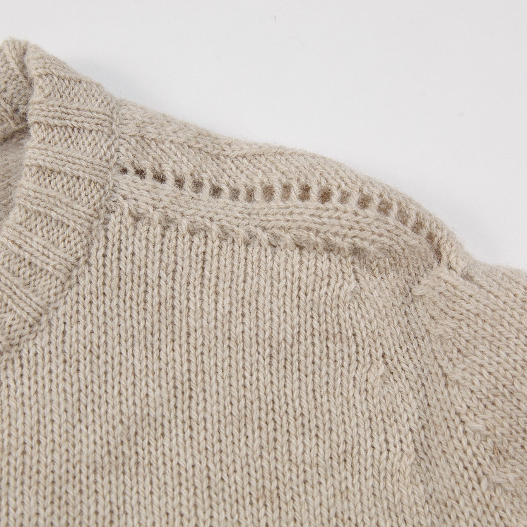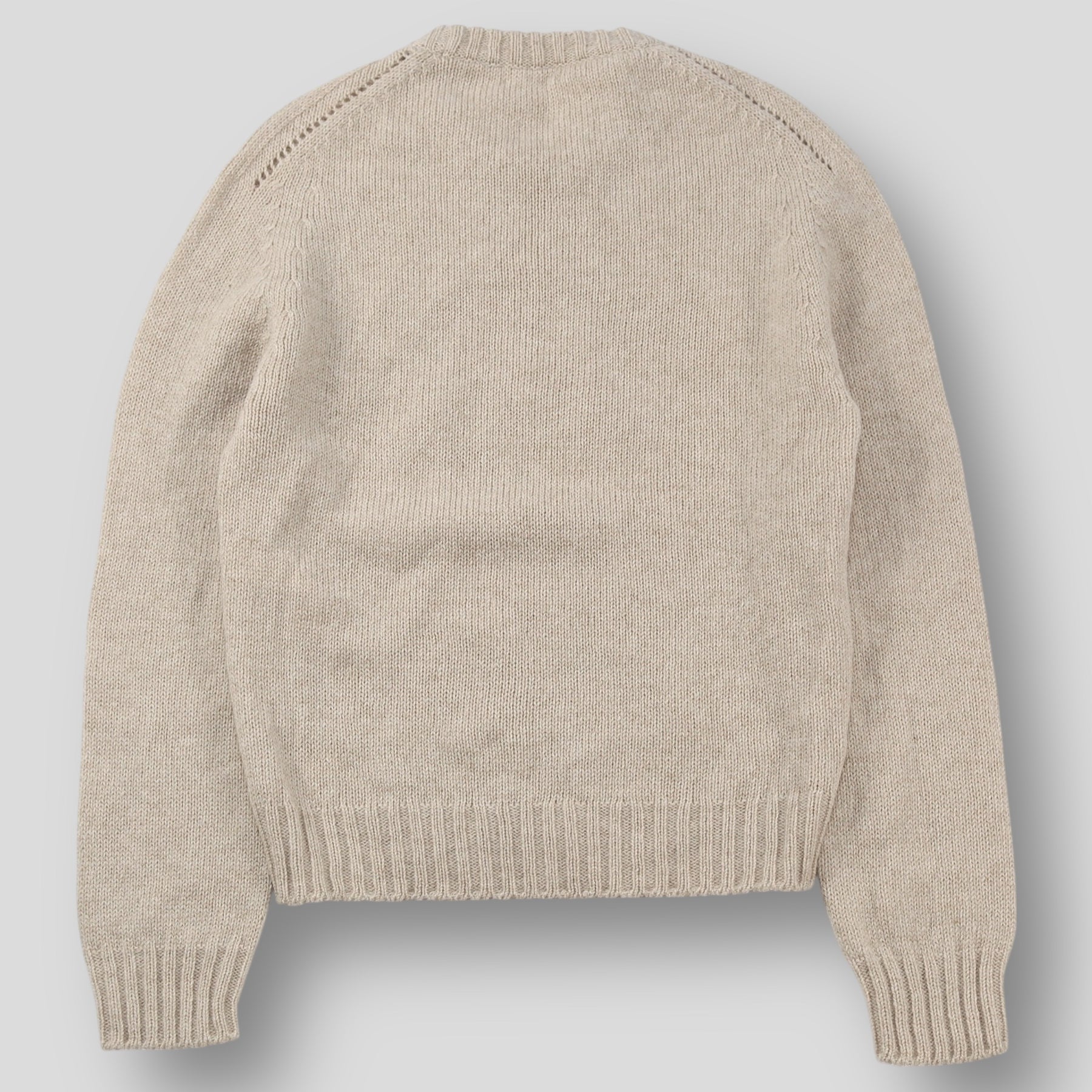 程よくゆとりのあるクラシックフィットを採用しており、肩の透かし編みディテールが特徴的な仕上がり。