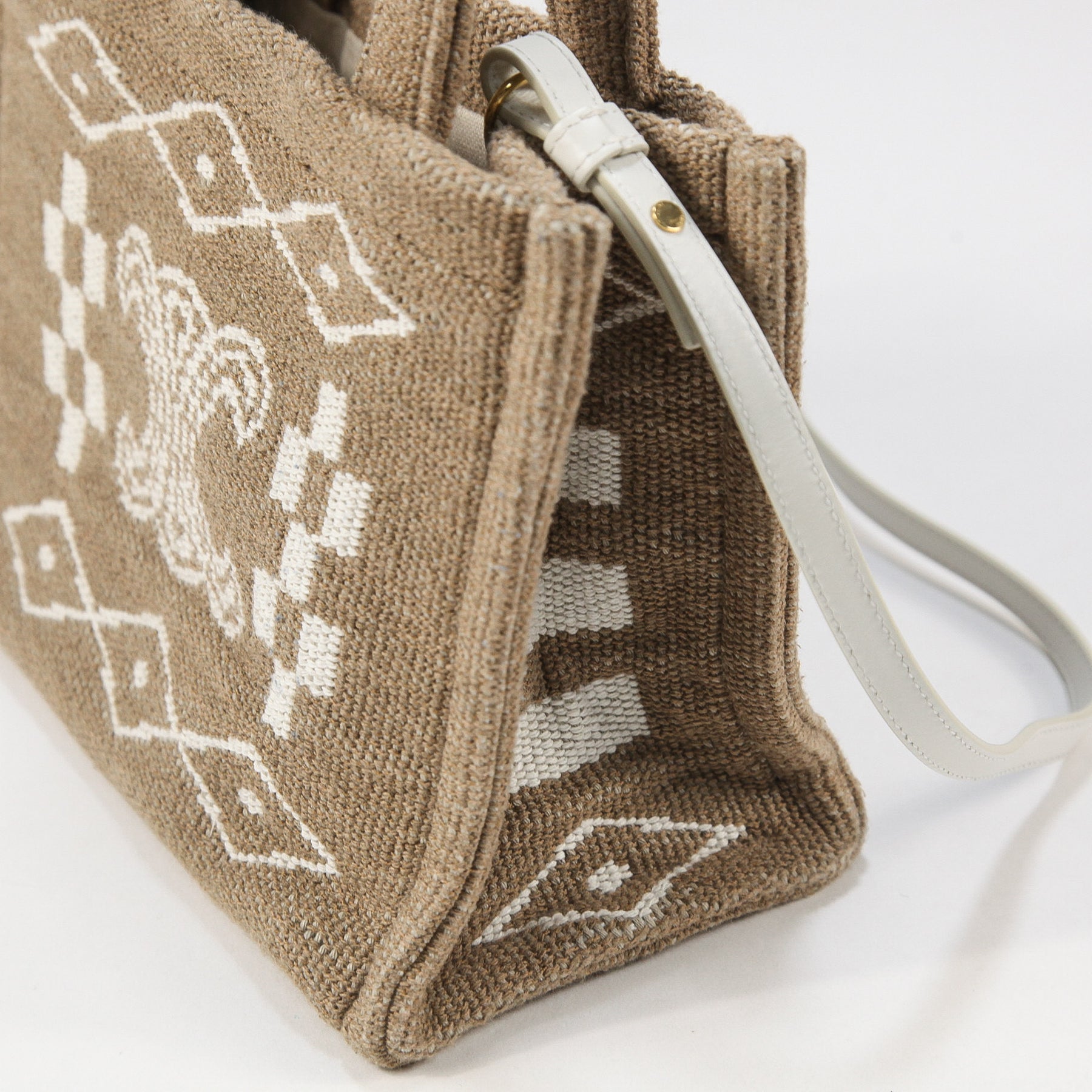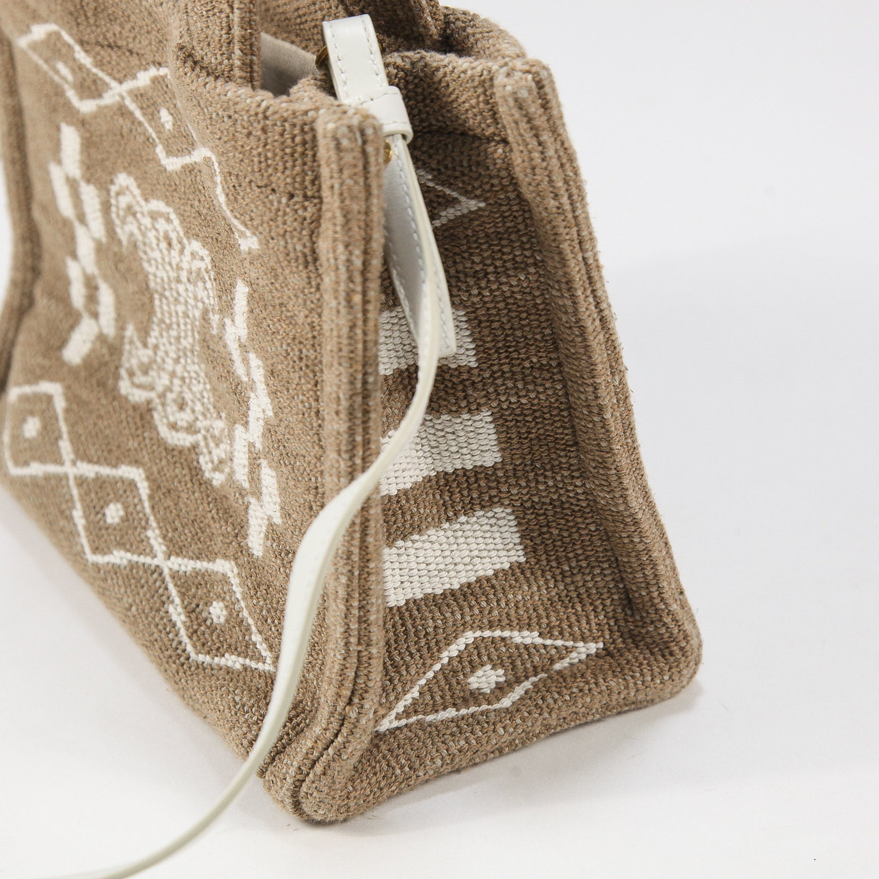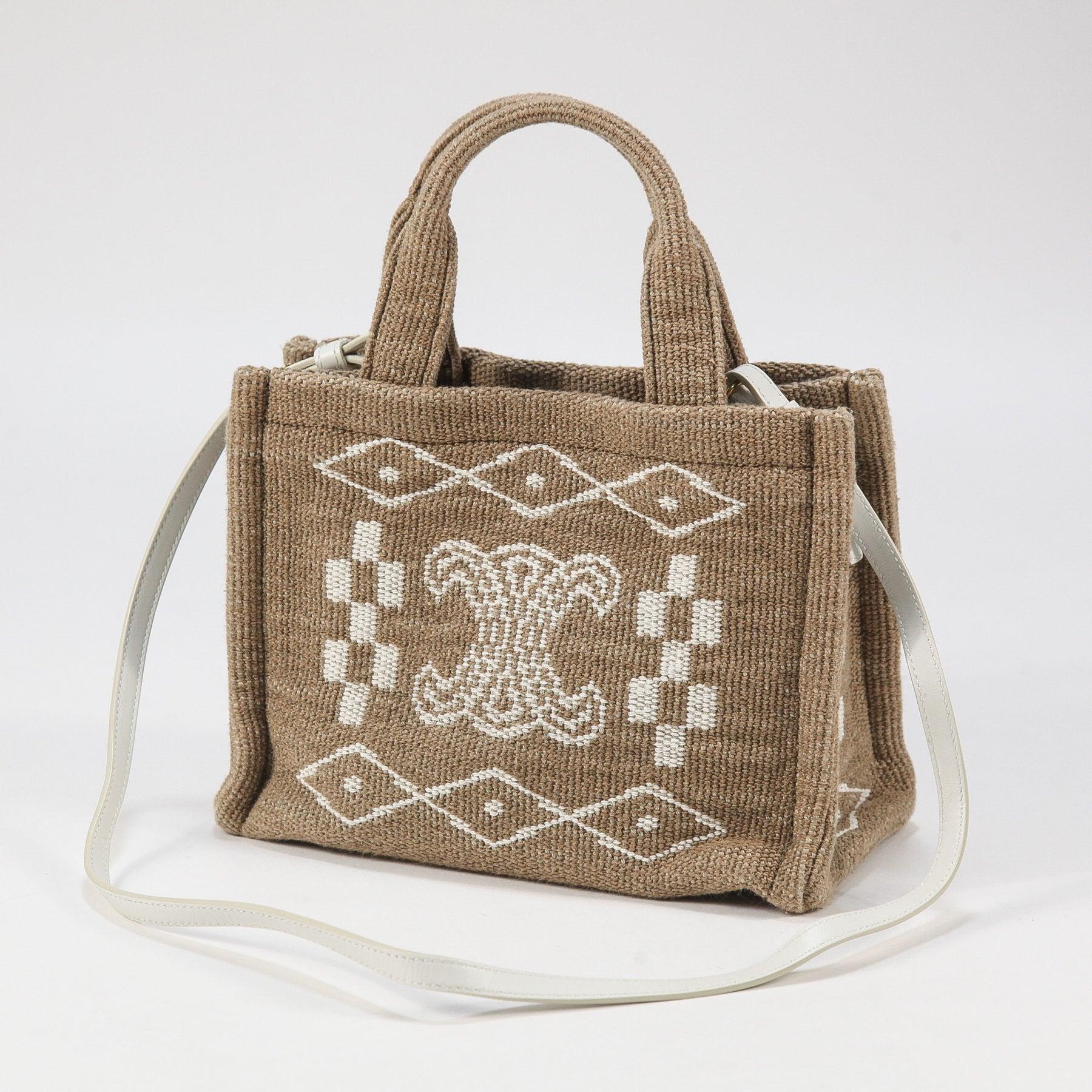 夏らしいボヘミアンな雰囲気を感じさせるテキスタイル(布地)素材で作られており、ブランドを象徴する「トリオンフ」のロゴが中央に大きく刺繍されたアイコニックなデザイン。