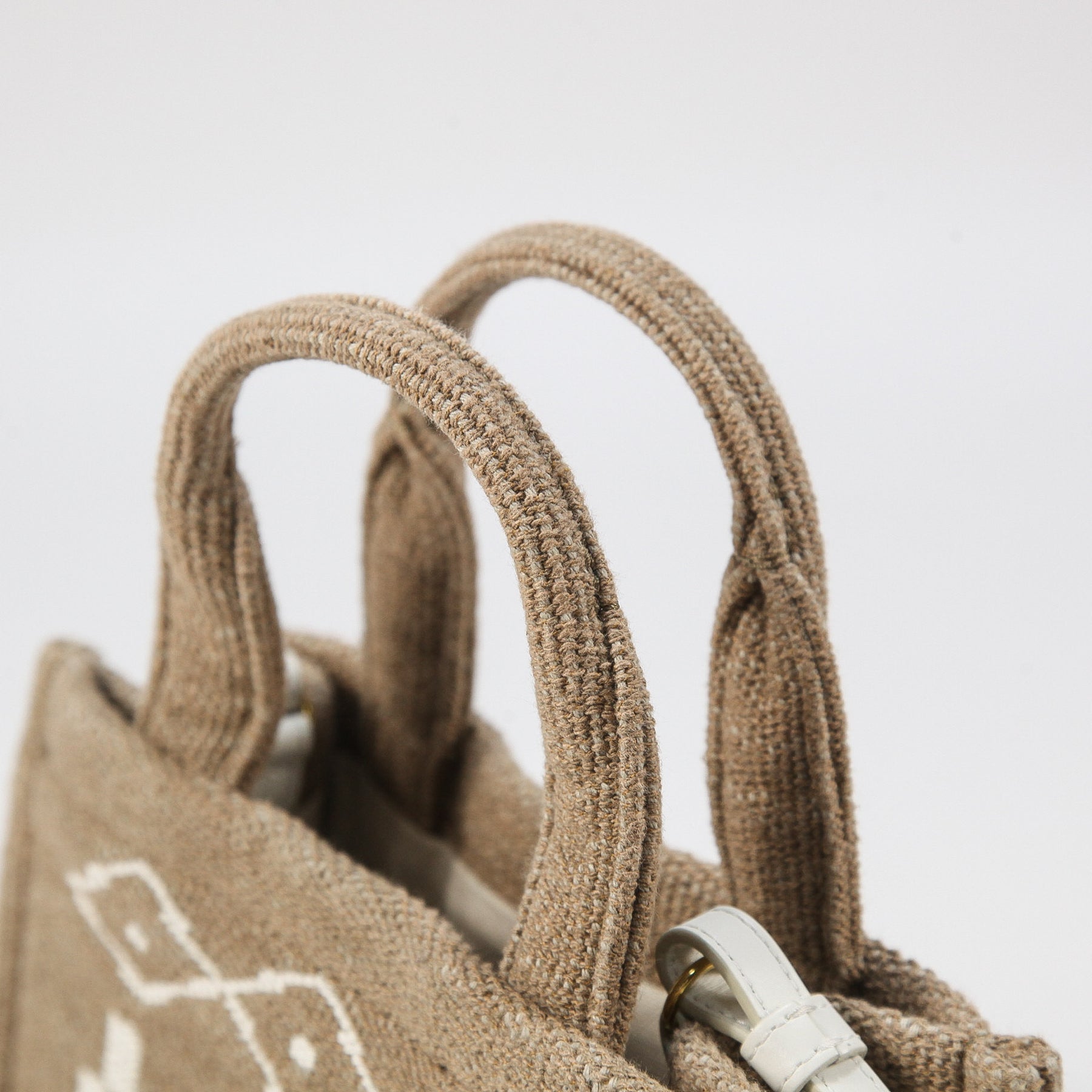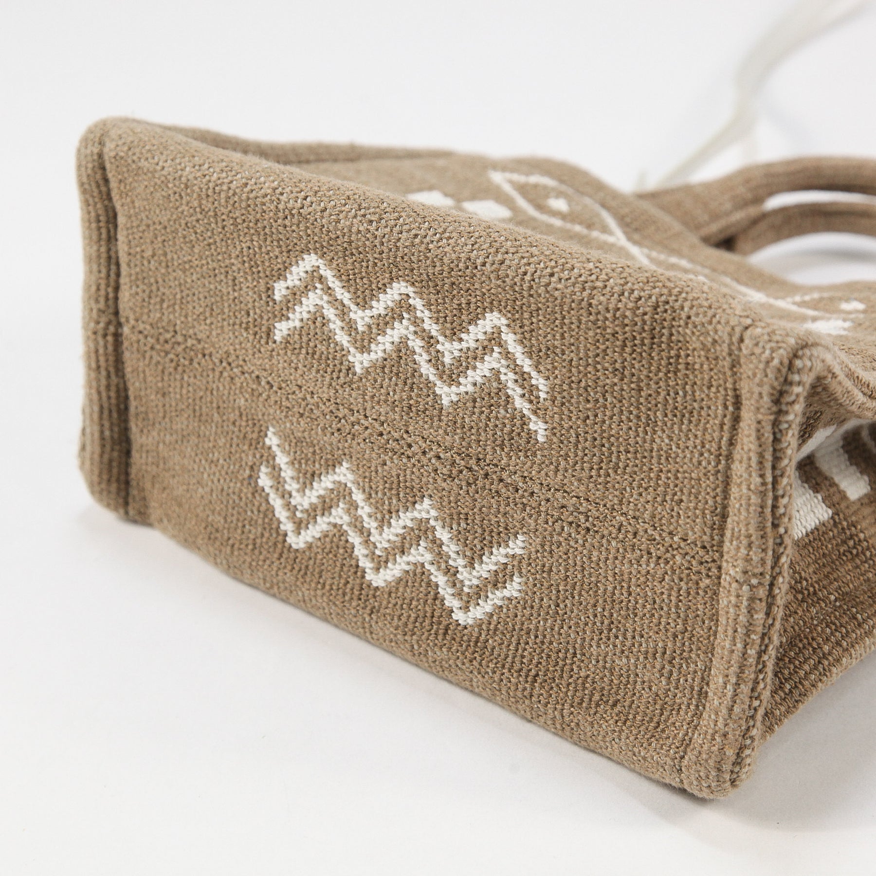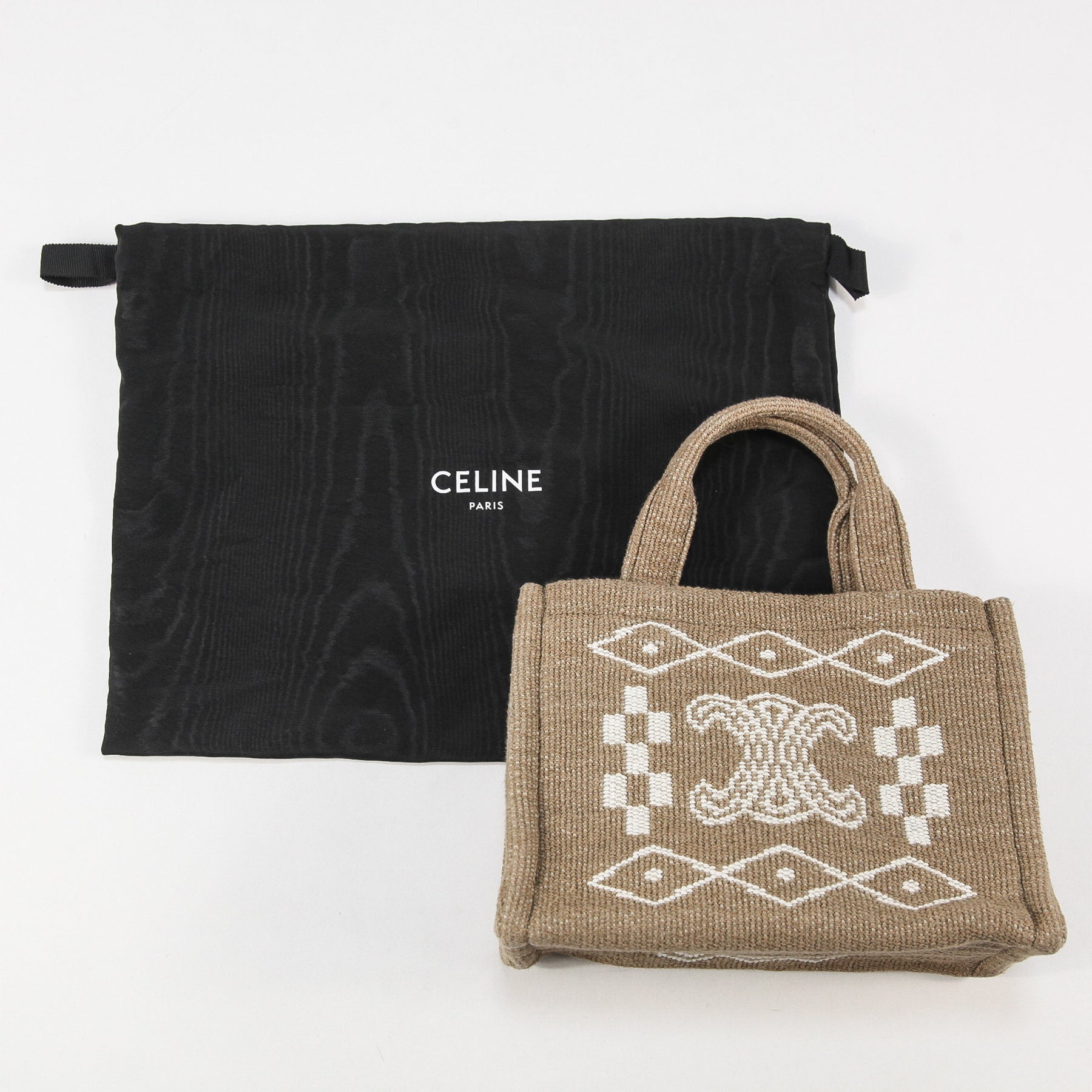 夏らしいボヘミアンな雰囲気を感じさせるテキスタイル(布地)素材で作られており、ブランドを象徴する「トリオンフ」のロゴが中央に大きく刺繍されたアイコニックなデザイン。