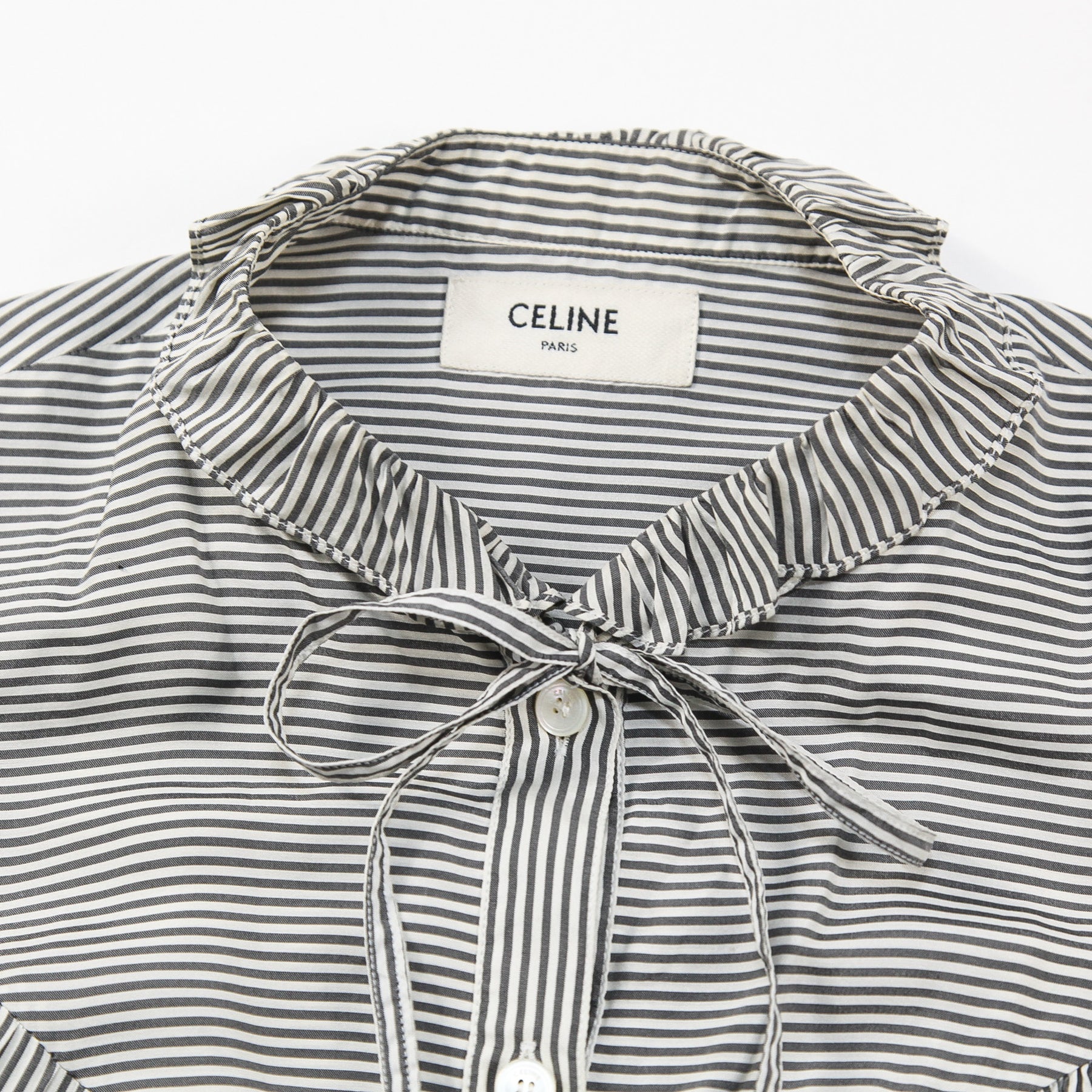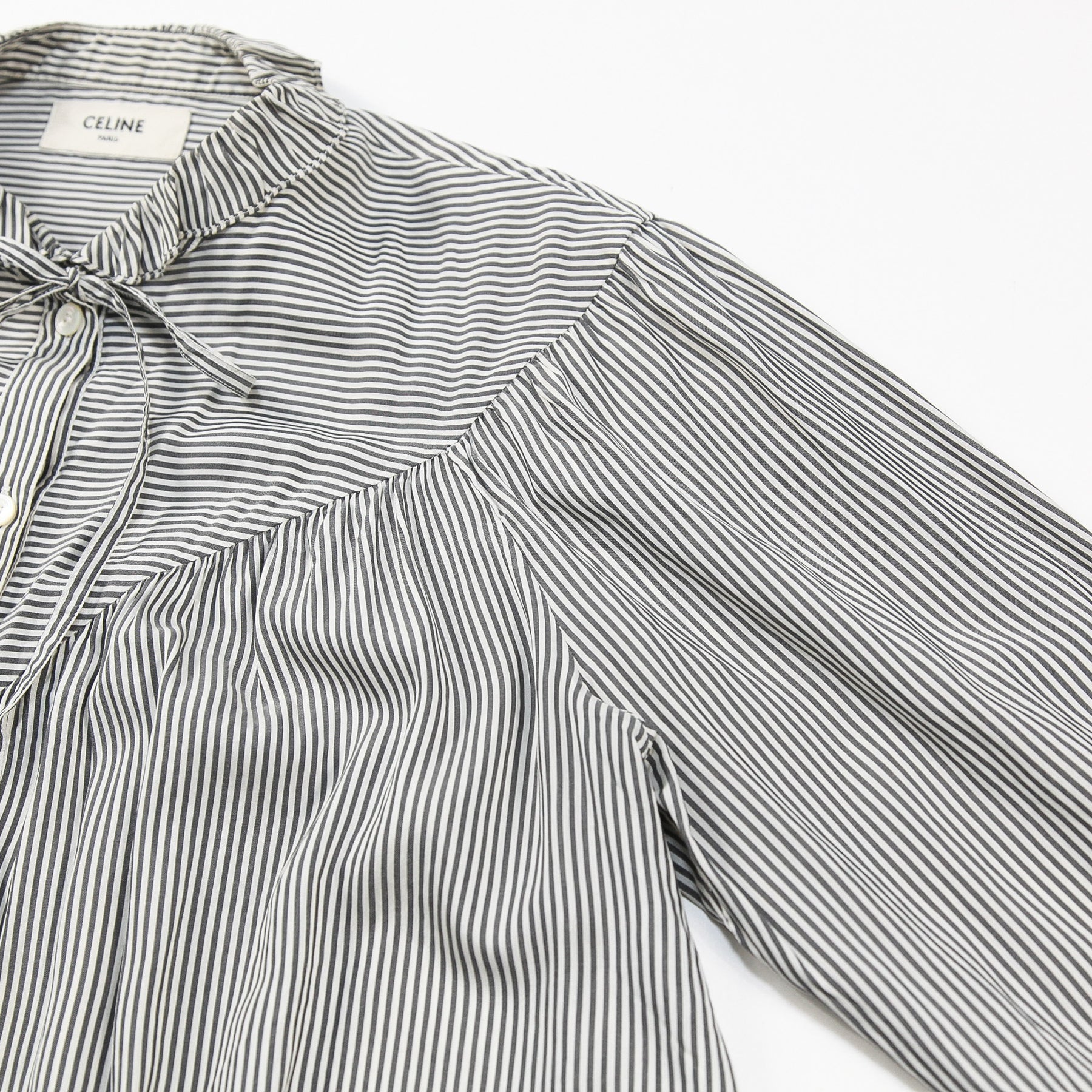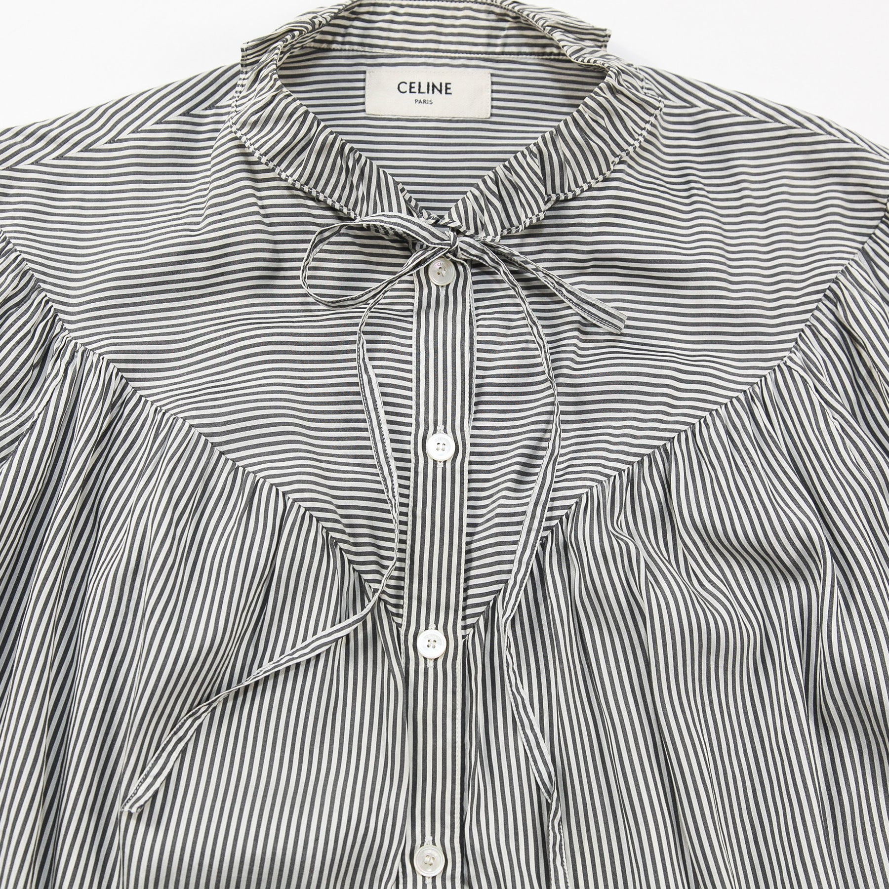 首周りや袖口にはフリル、胸元や背面にはギャザーやタックをそれぞれ配したフェミニンなデザインで、襟元に付けられたネクタイリボンは様々な形に結んでアレンジが可能。
