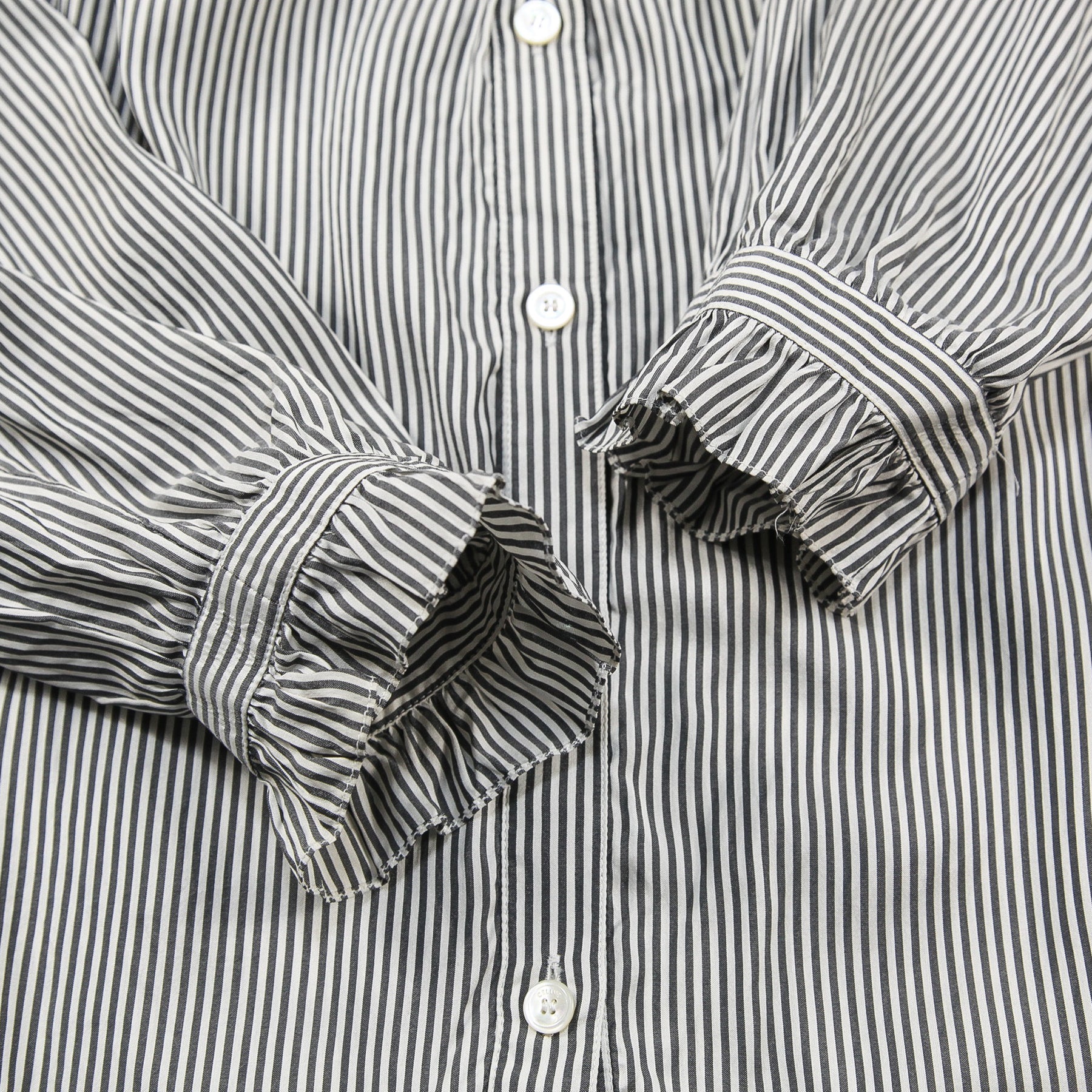 商品名:フリルVネックブラウス ストライプ / シルクポプリン
