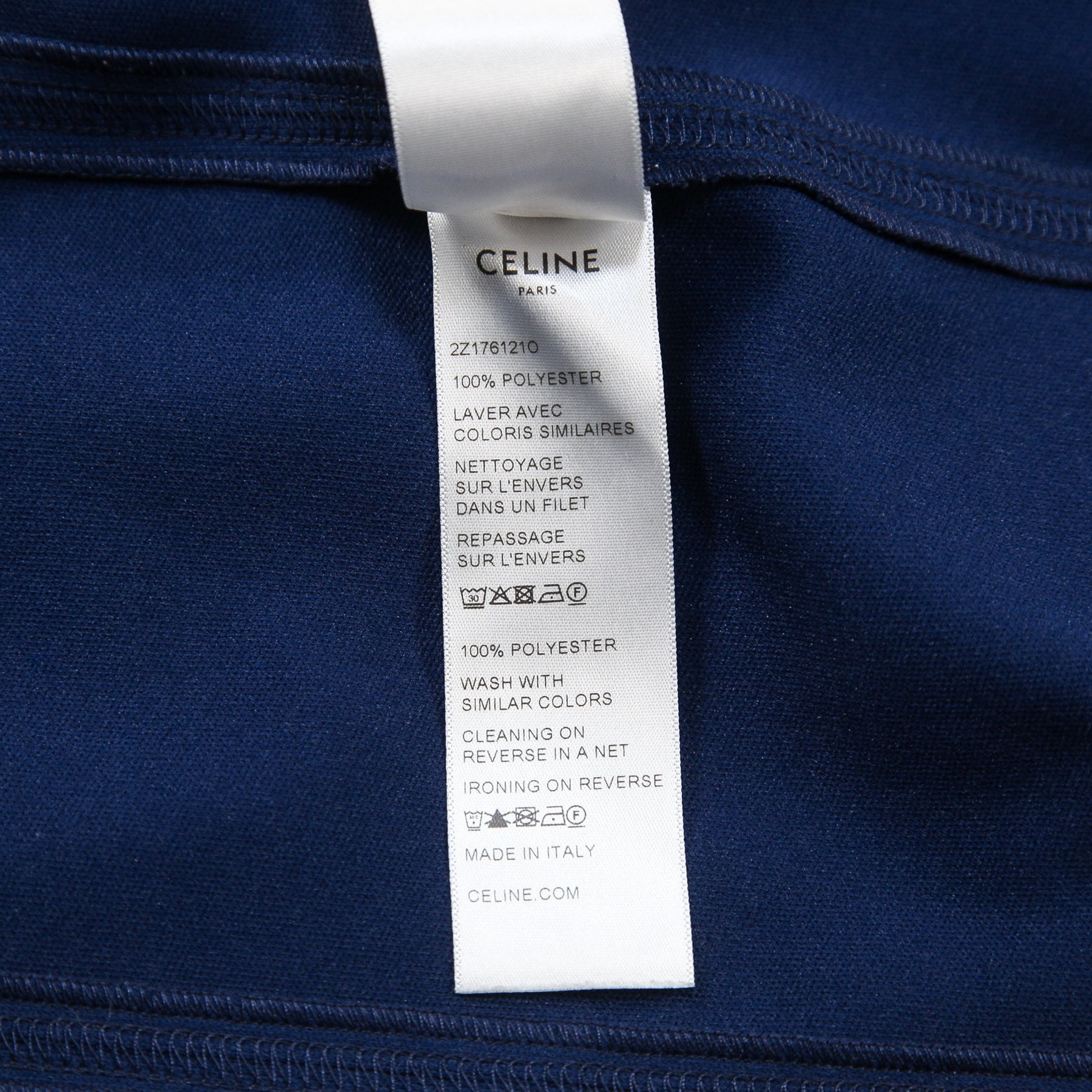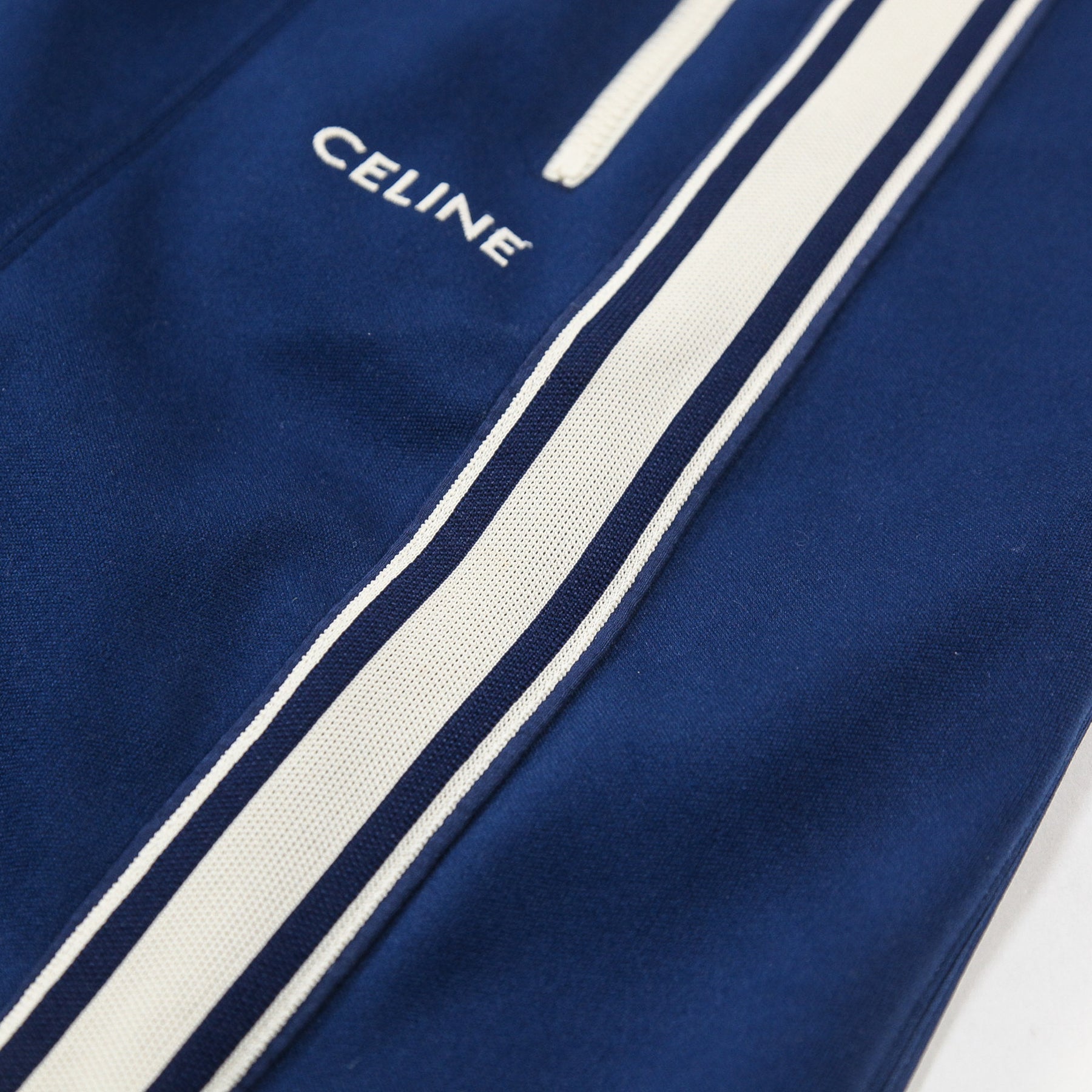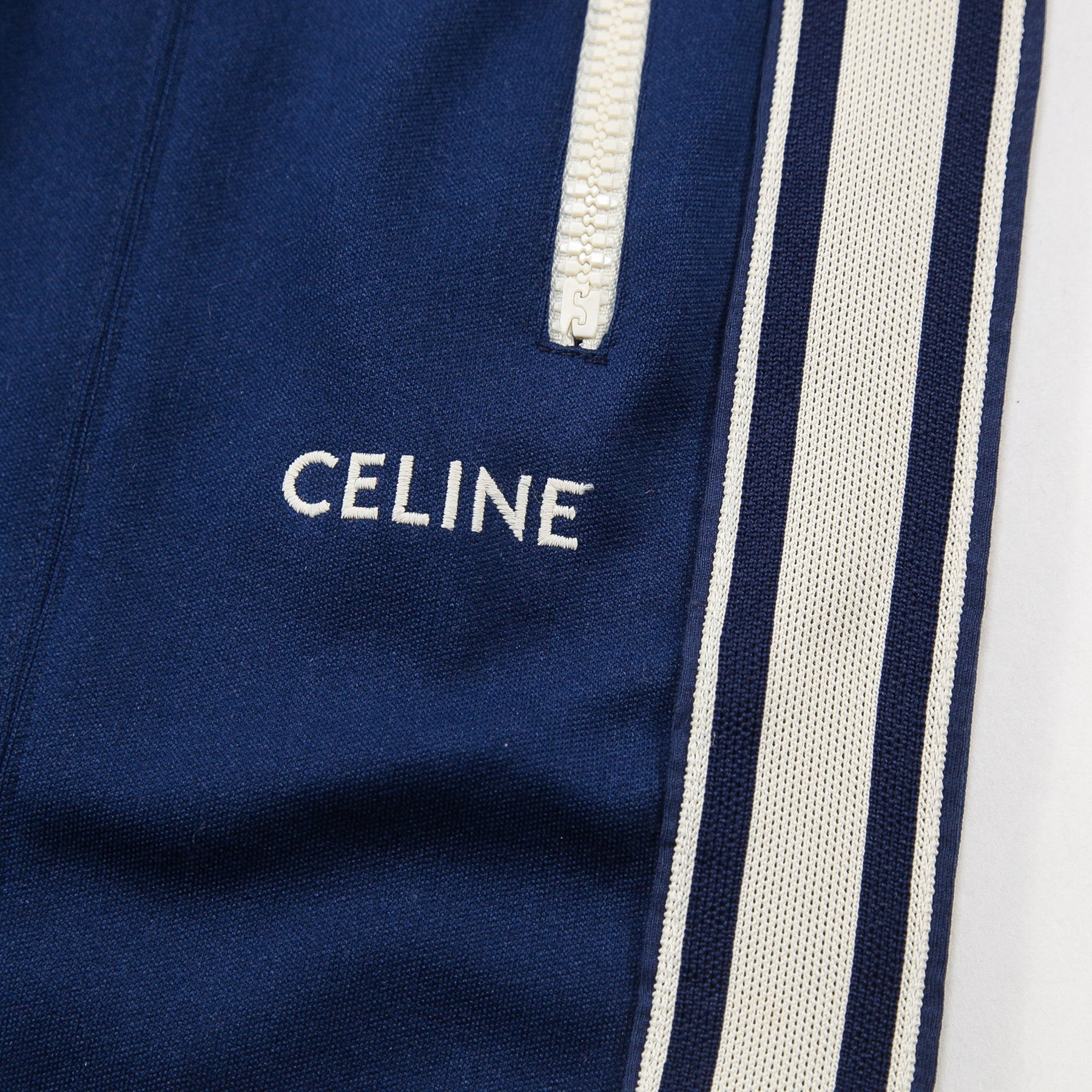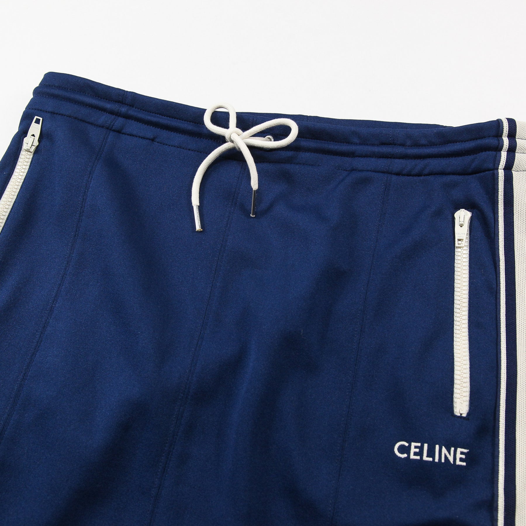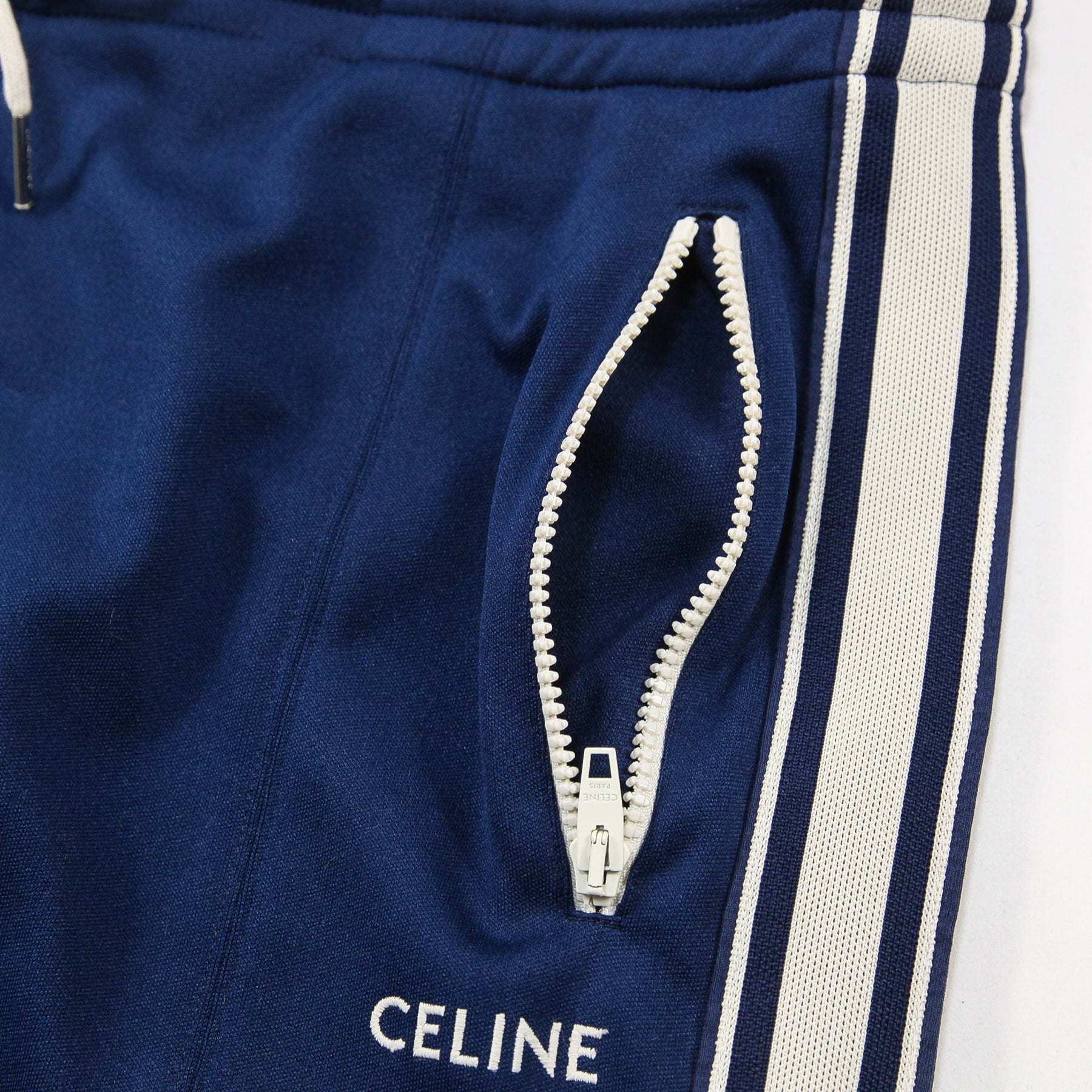 ストンと落ちるストレートシルエットのクラシックフィットでを採用しており、左太もものCELINEロゴの刺繍がアクセントになっています。