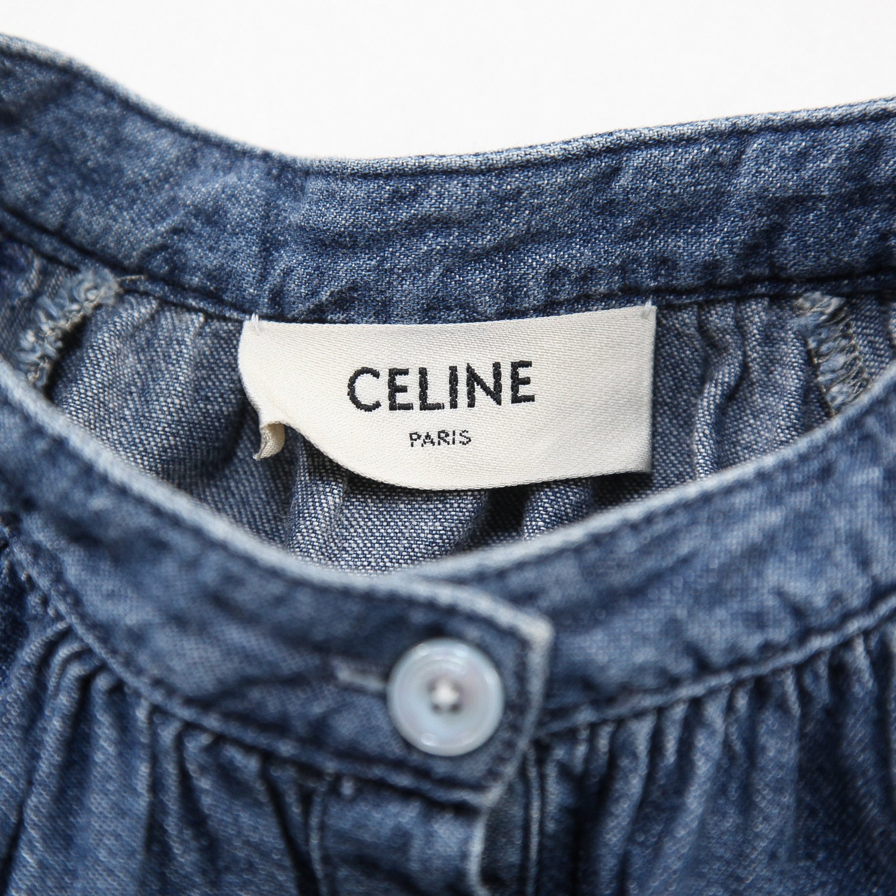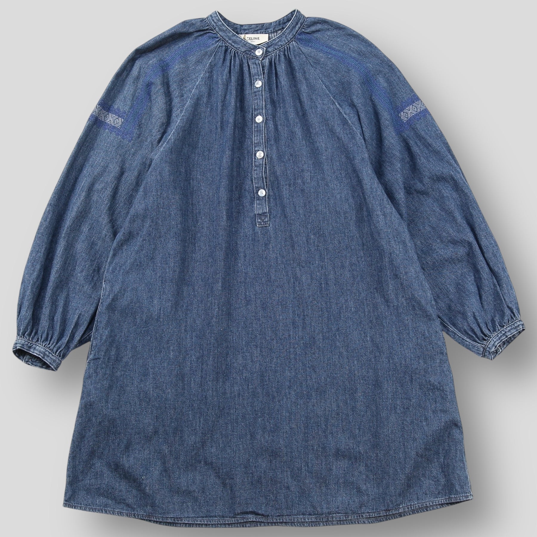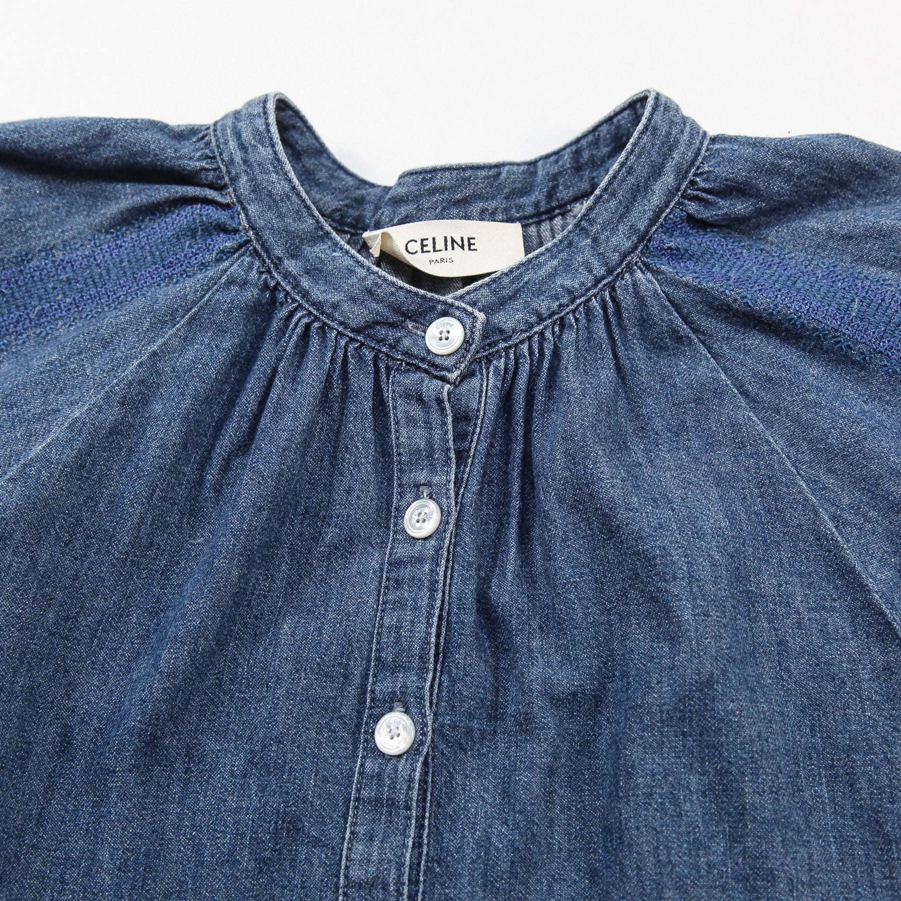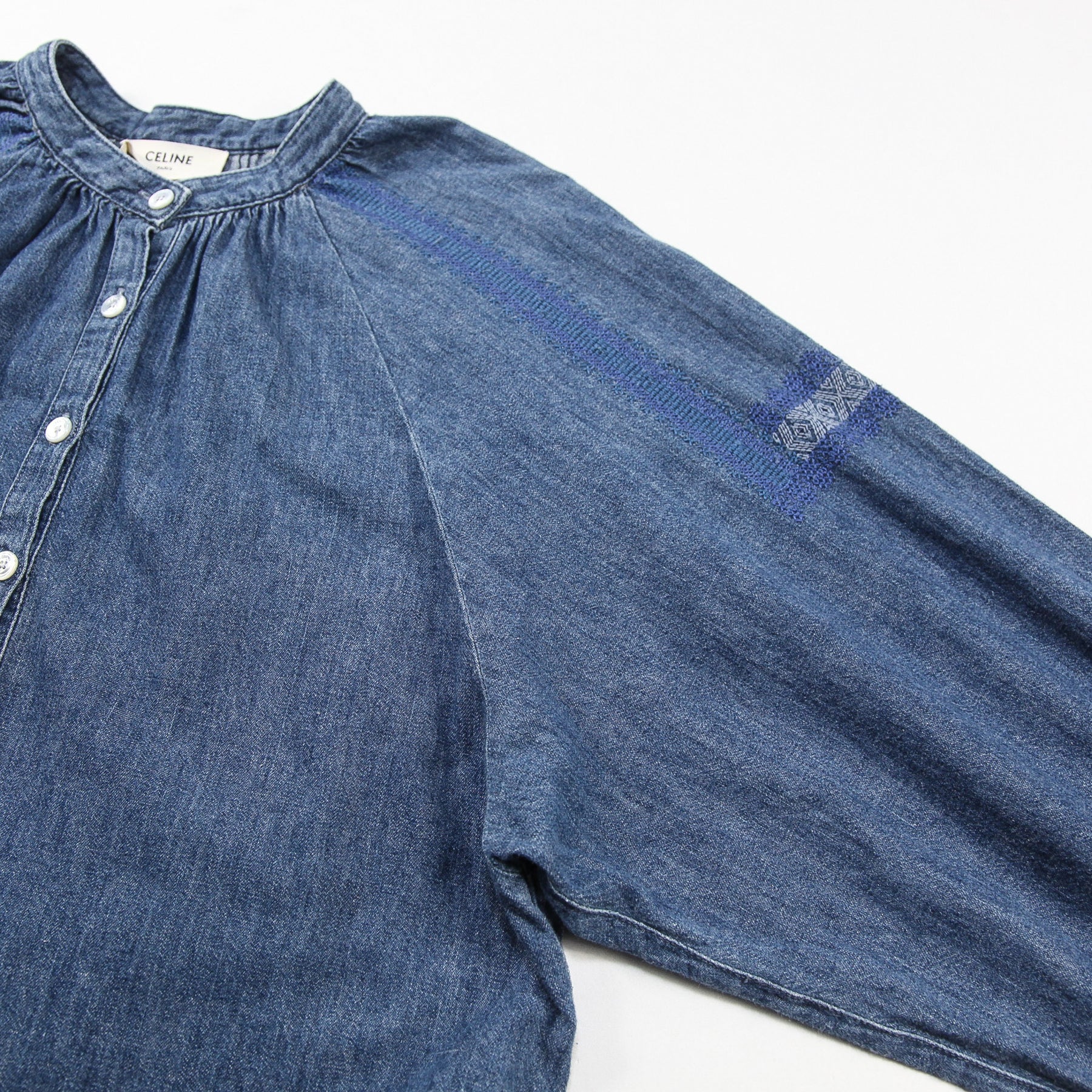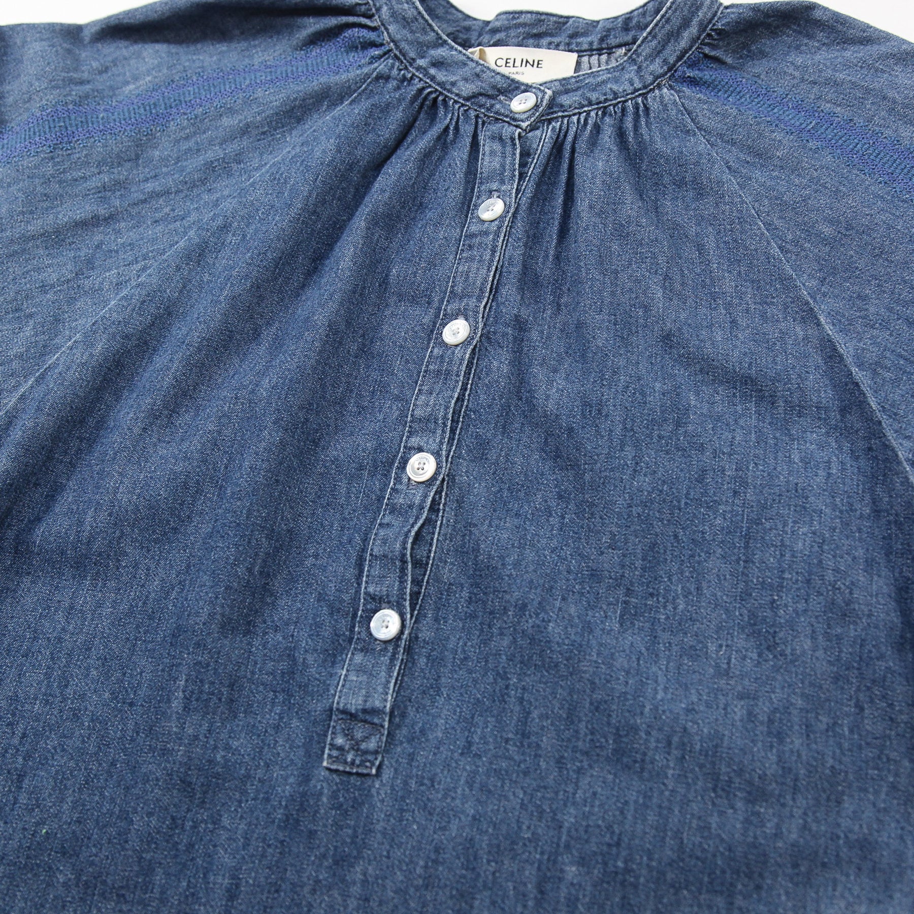 フロントと袖口にはCELINE PARISの刻印入りマザーオブパールボタンを配しており、軽く膨らんだラグランスリーブでボリューム感を出しています。