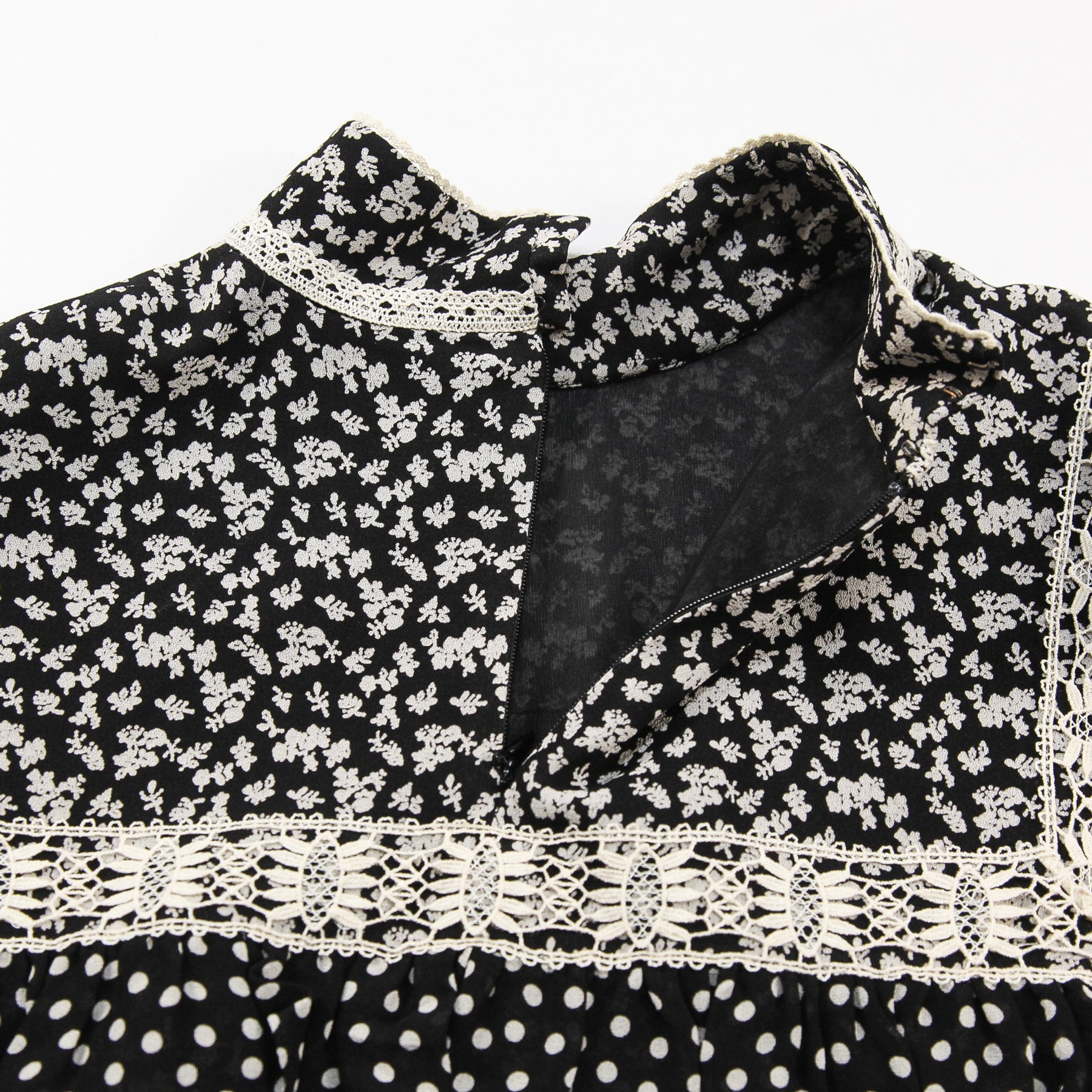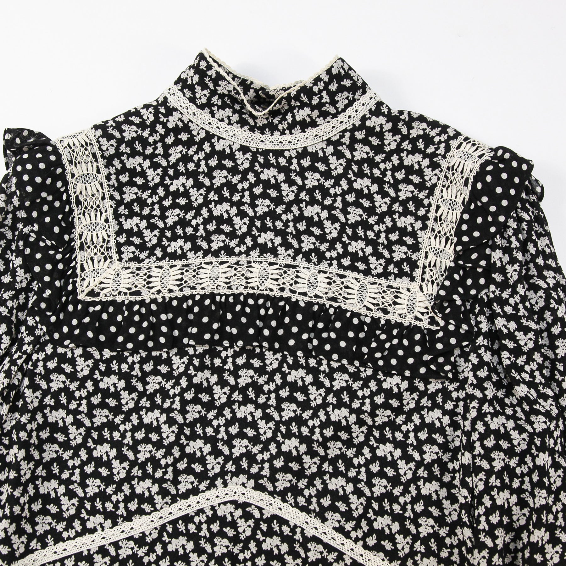 首元に綺麗に沿うハイネックデザインで、ドット柄のフリルが付いたフロントパネルと袖口がアクセントになっています。