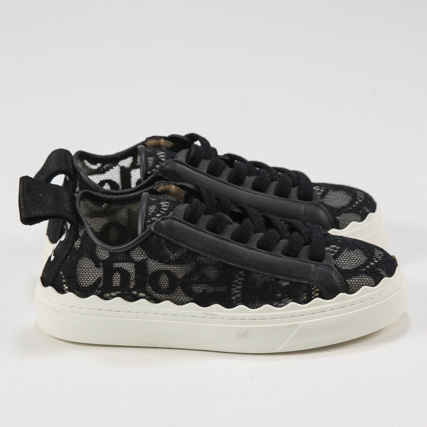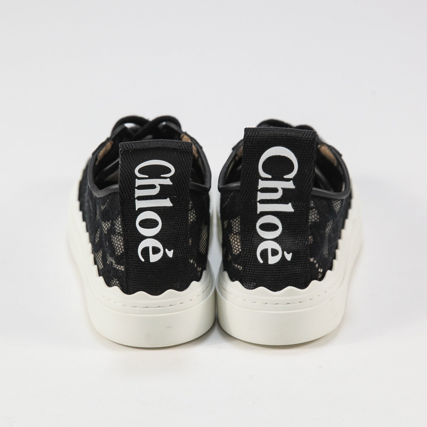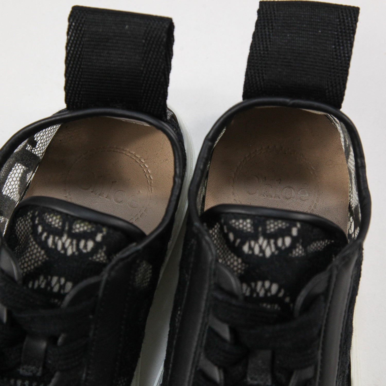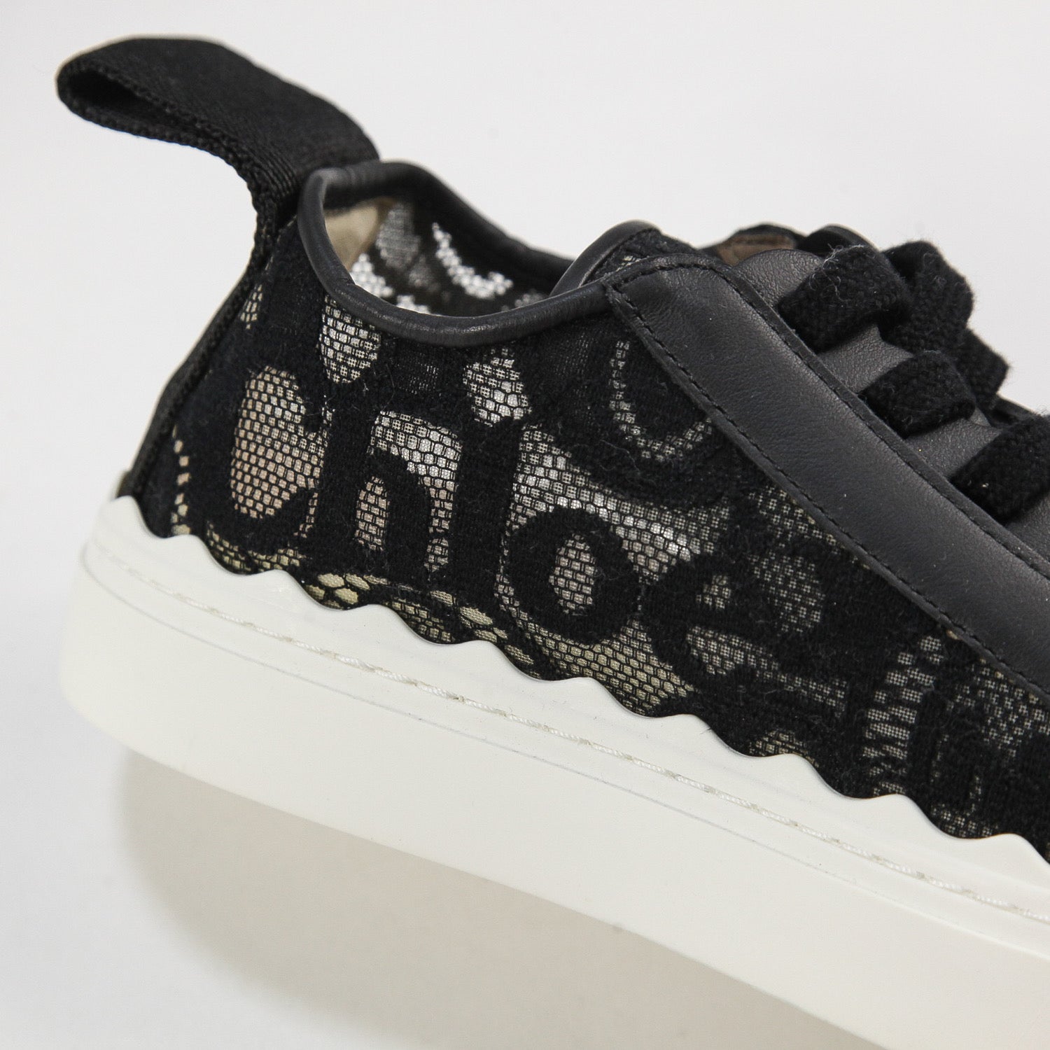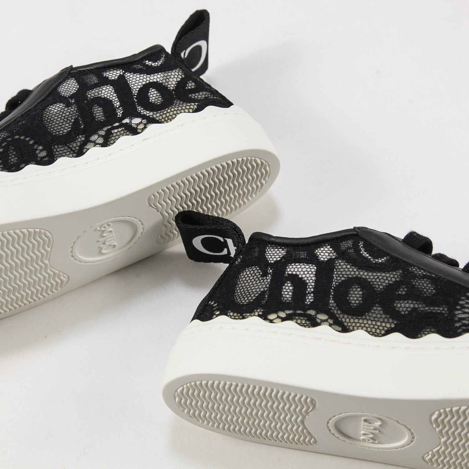 同系色のレース、ホワイトのしなやかなラバーソール、クロエのロゴがあしらわれたバックのナイロンループがスポーティーな魅力を高めています。