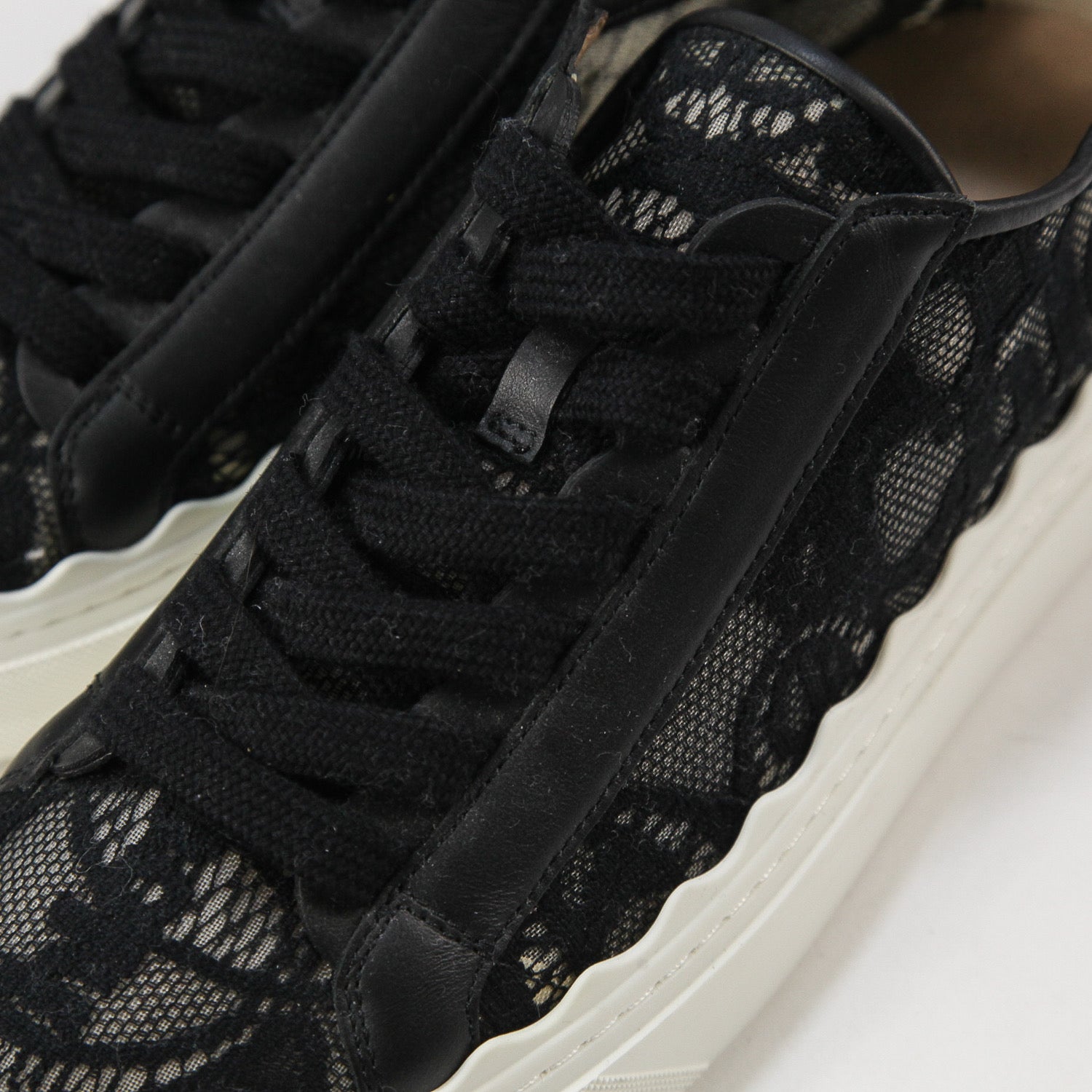 フェミニンなレース素材を大胆に取り入れた、Chloeのレースアップスニーカー。