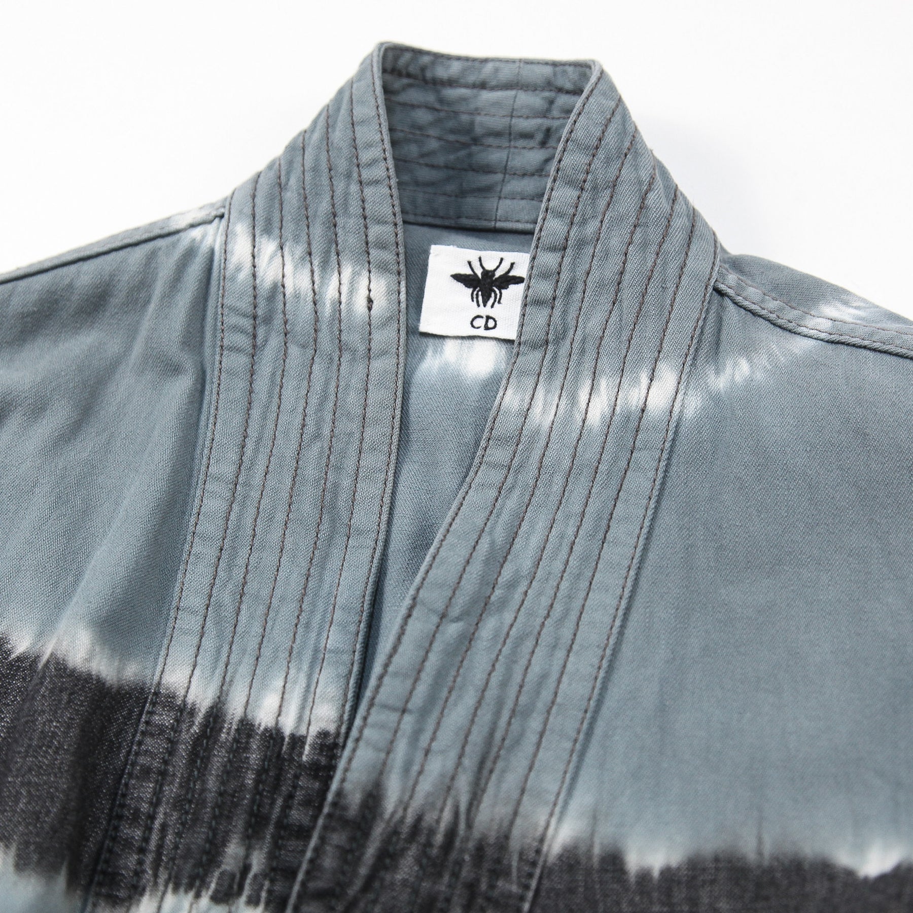 ストレートなカッティングで仕上げられた作務衣のようなノーカラーデザインで、右パッチポケット上部にはアイコンでもあるBeeを刺繍。