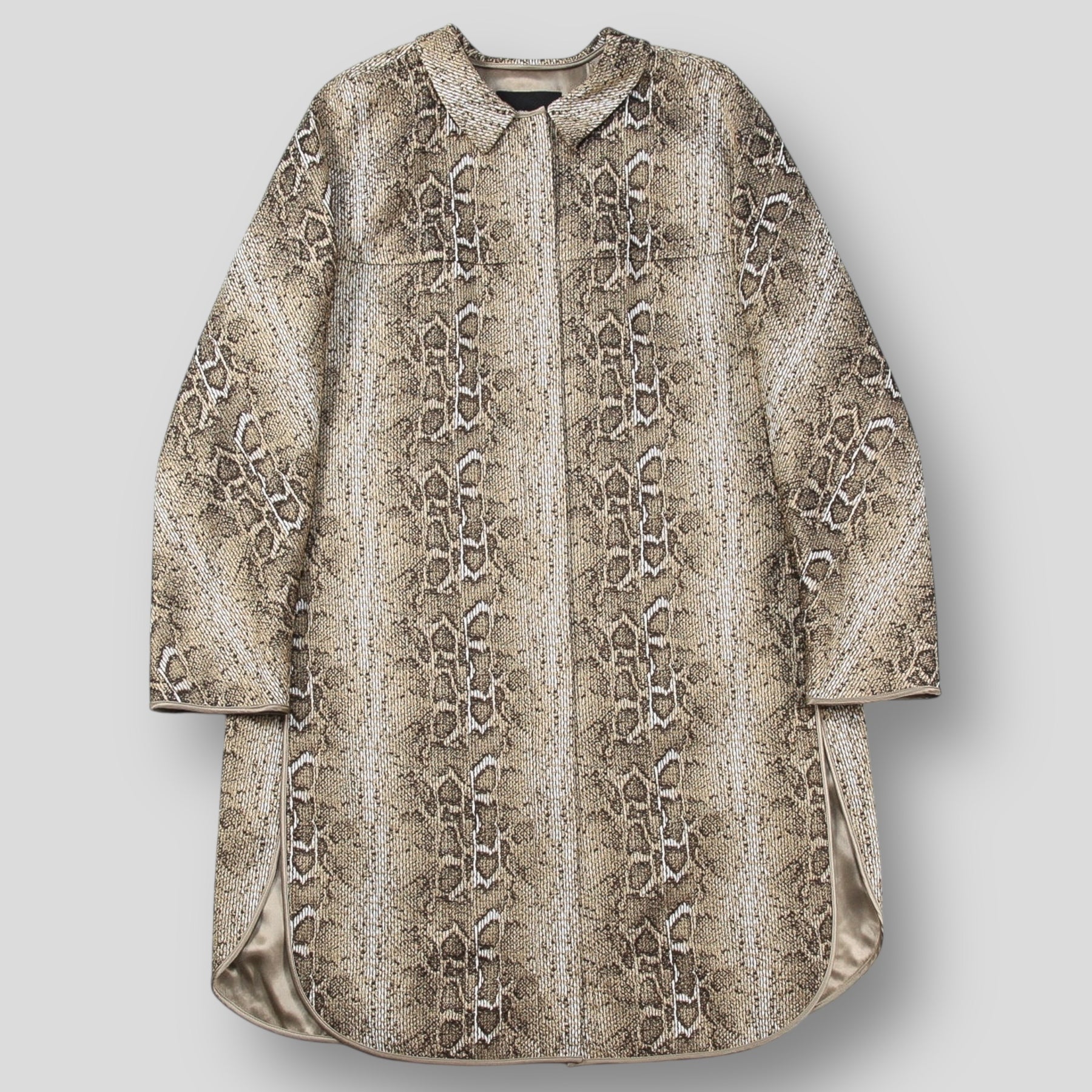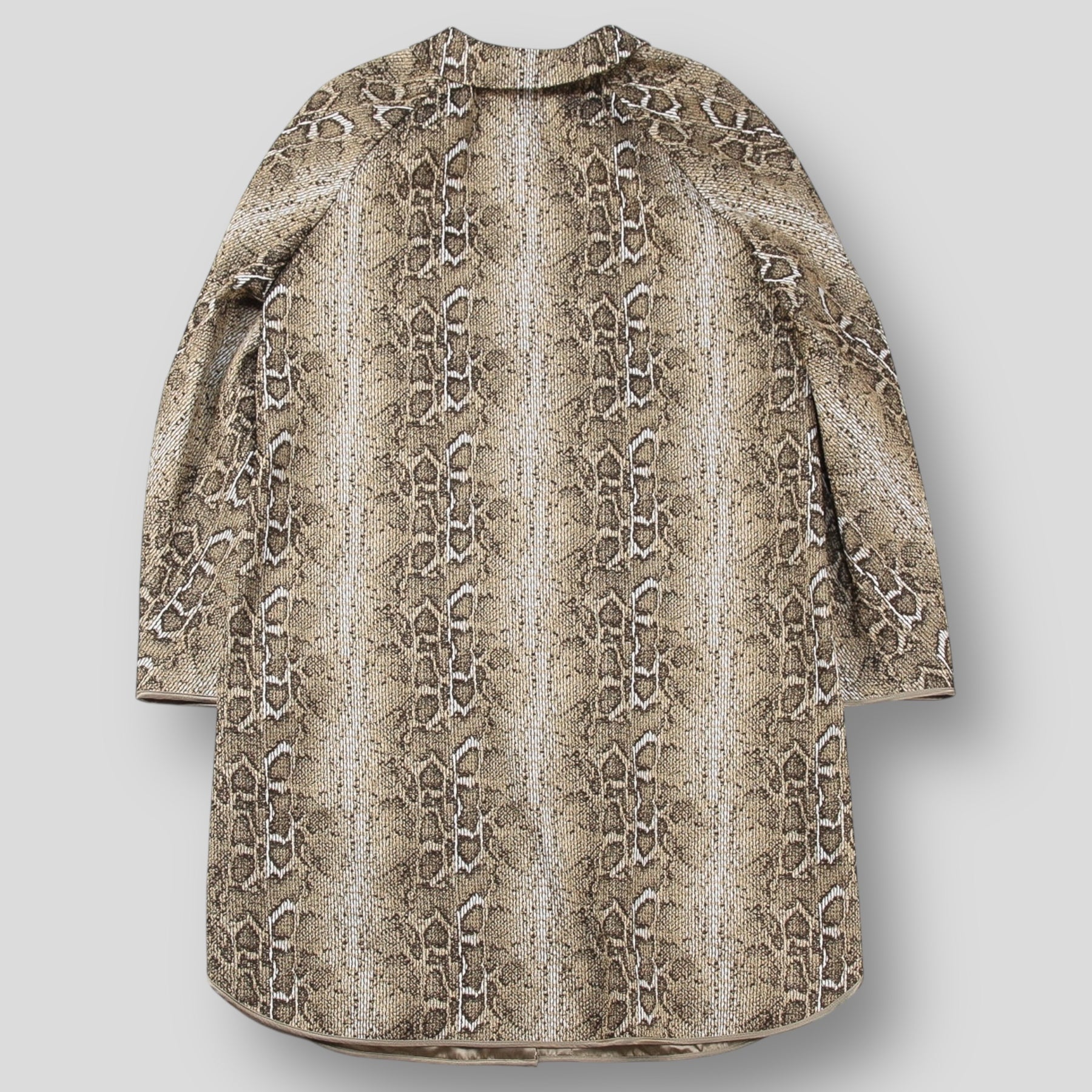 ポリエステル/ヴィスコース/コットン混紡の軽快な素材を使用し、ジャカード織りでパイソン柄を表現したステンカラーコート。