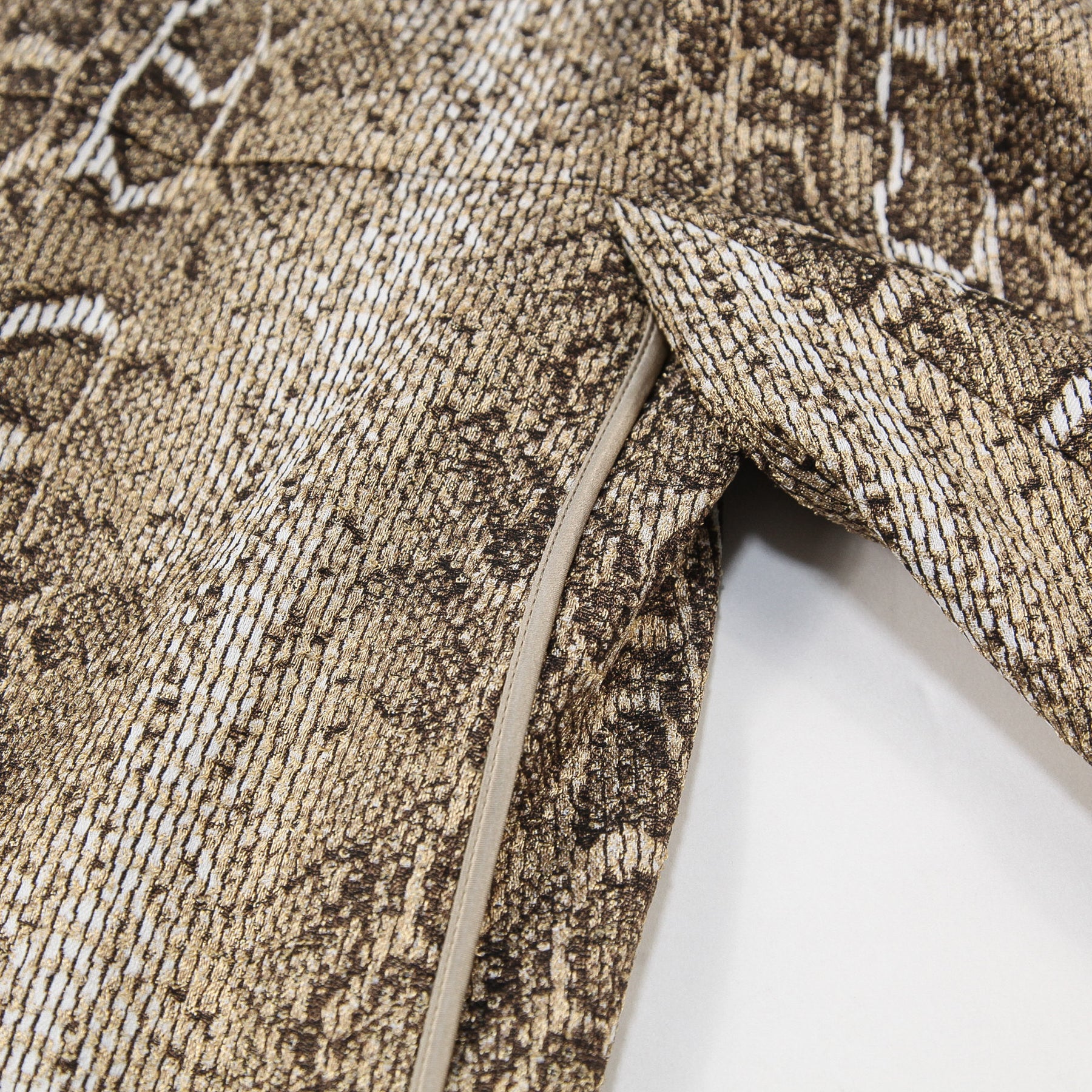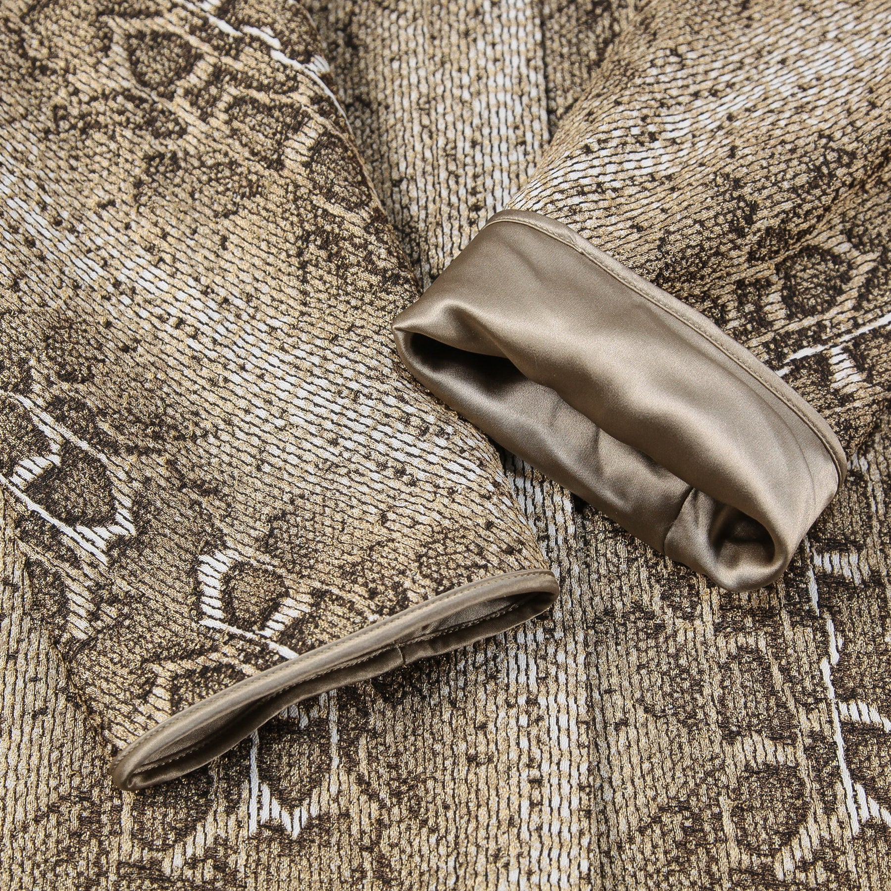 袖口やサイドのパイピング、裏地には上質なシルク素材を使用しており、ボディのゴールドカラーと相まってラグジュアリーな雰囲気を醸し出す一品です。