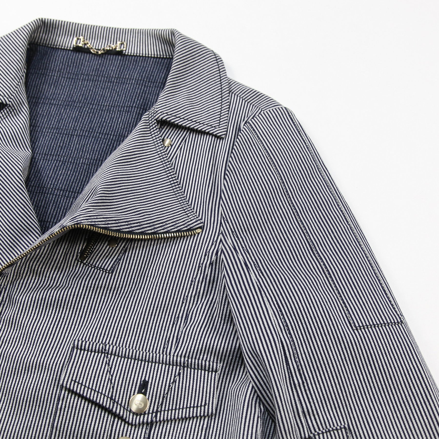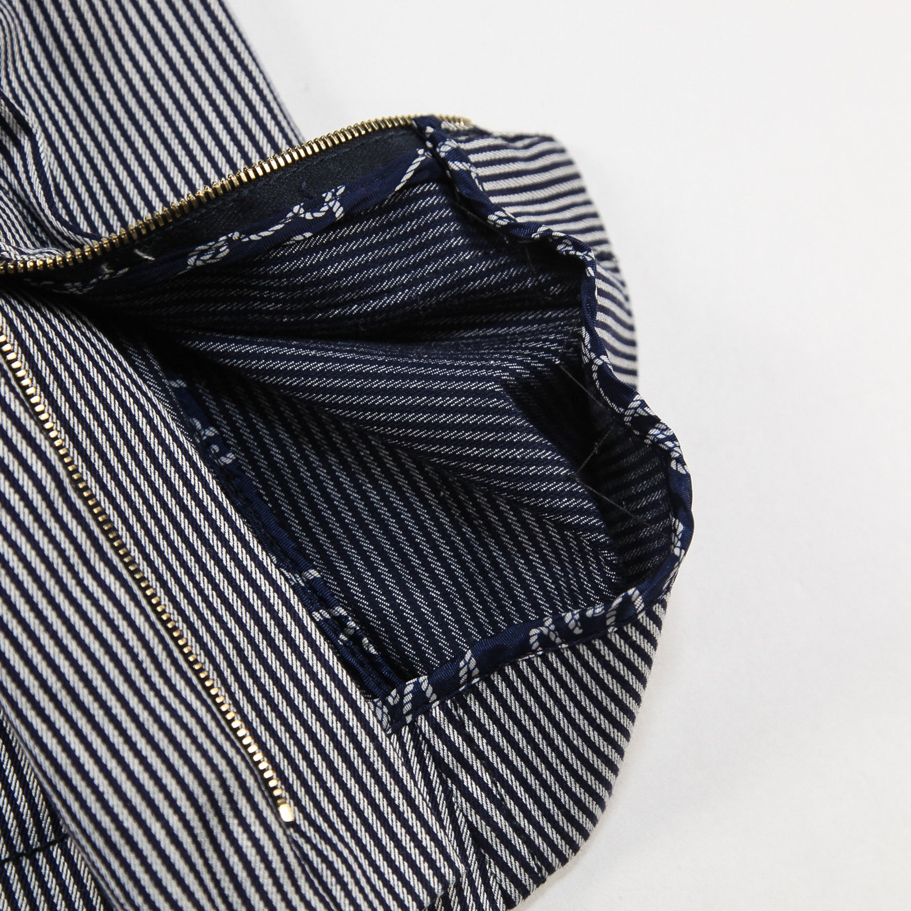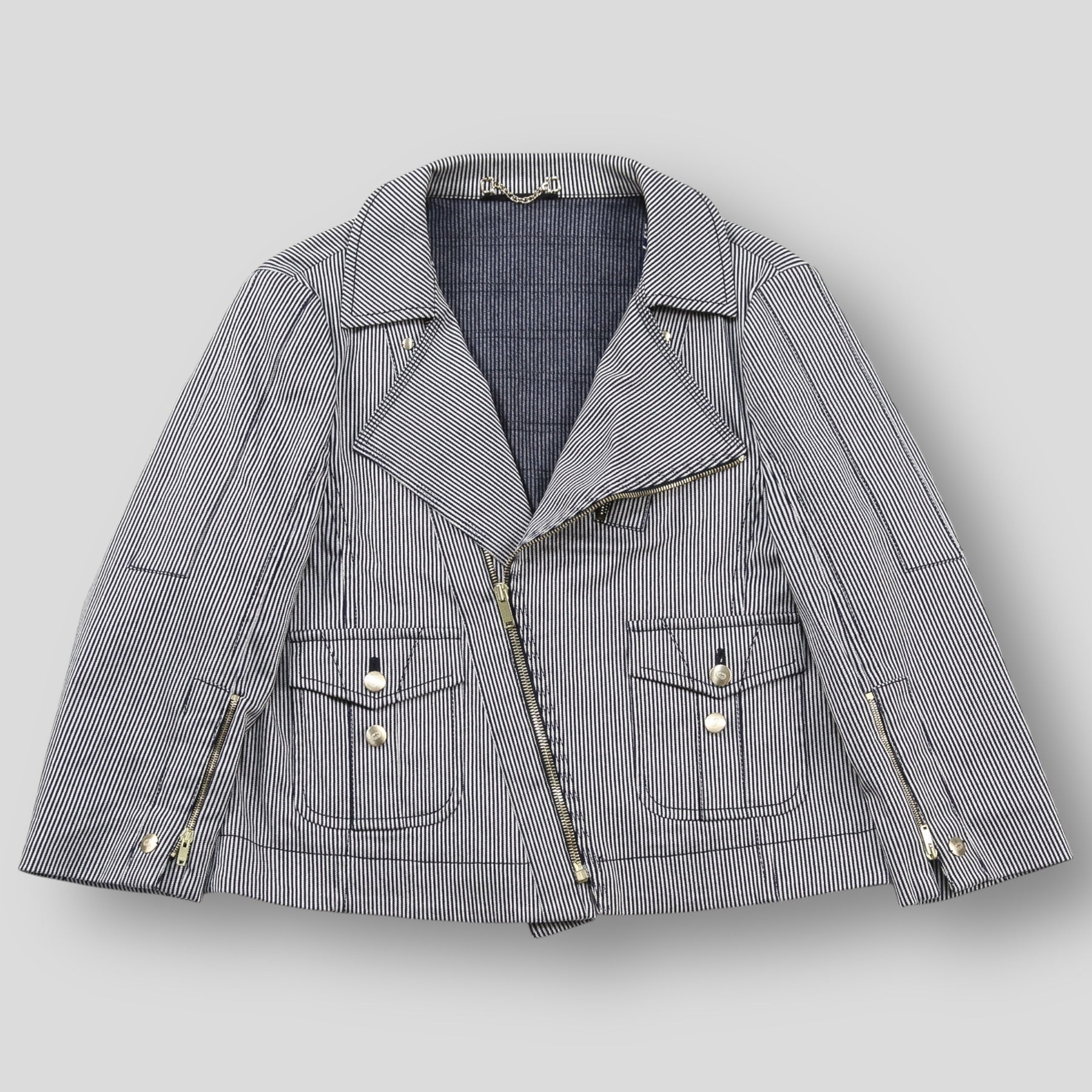 ネイビー×グレーの落ち着いた配色のストライプ柄を採用しており、ゴールドジップやボタン、パーツが高級感を漂わせる仕上がり。