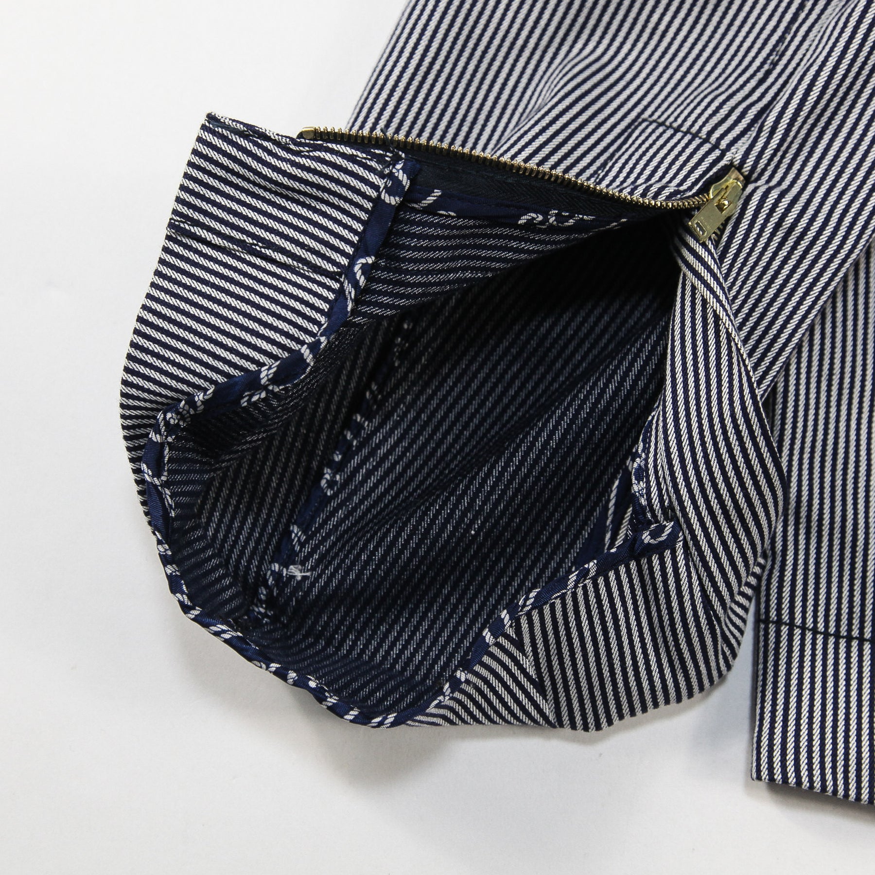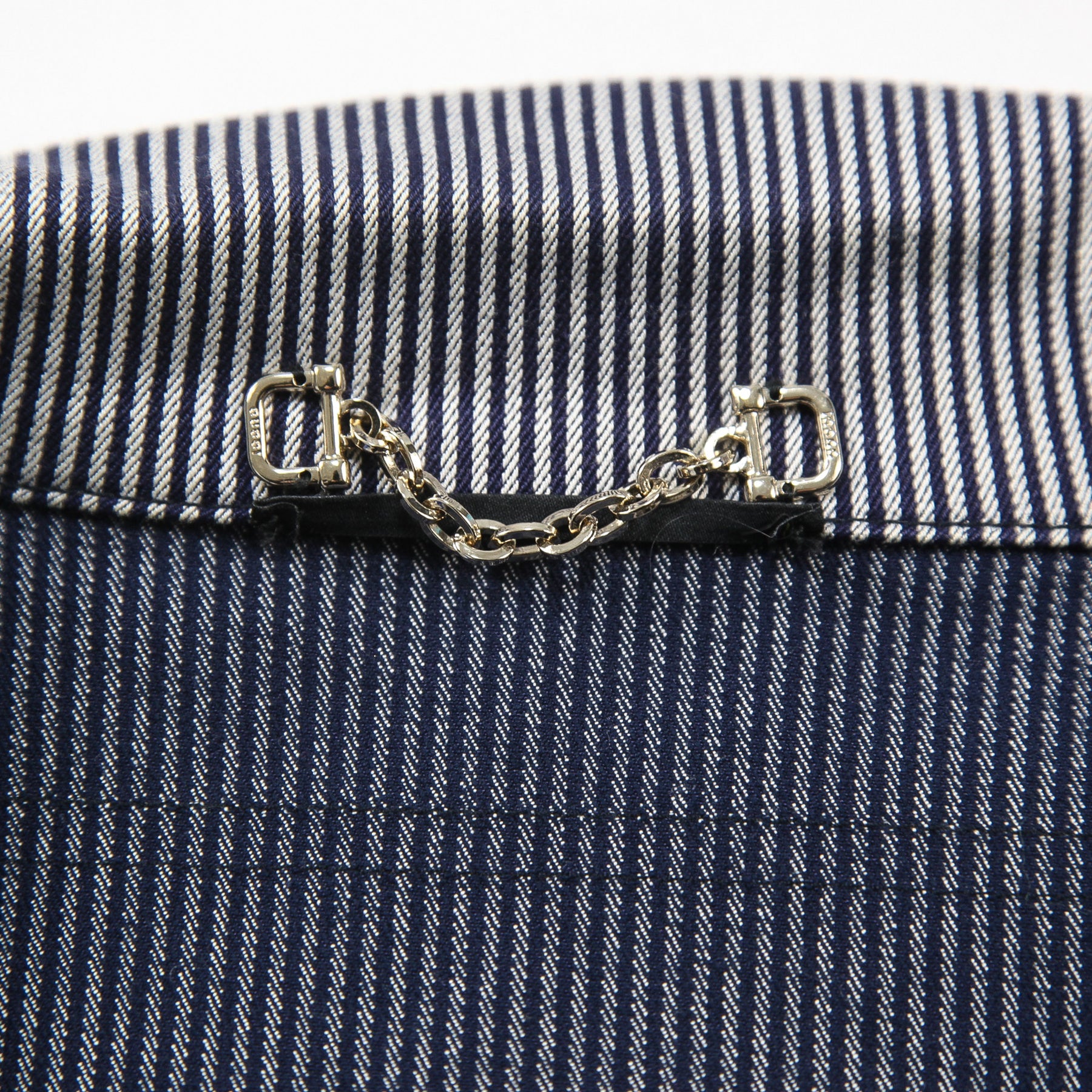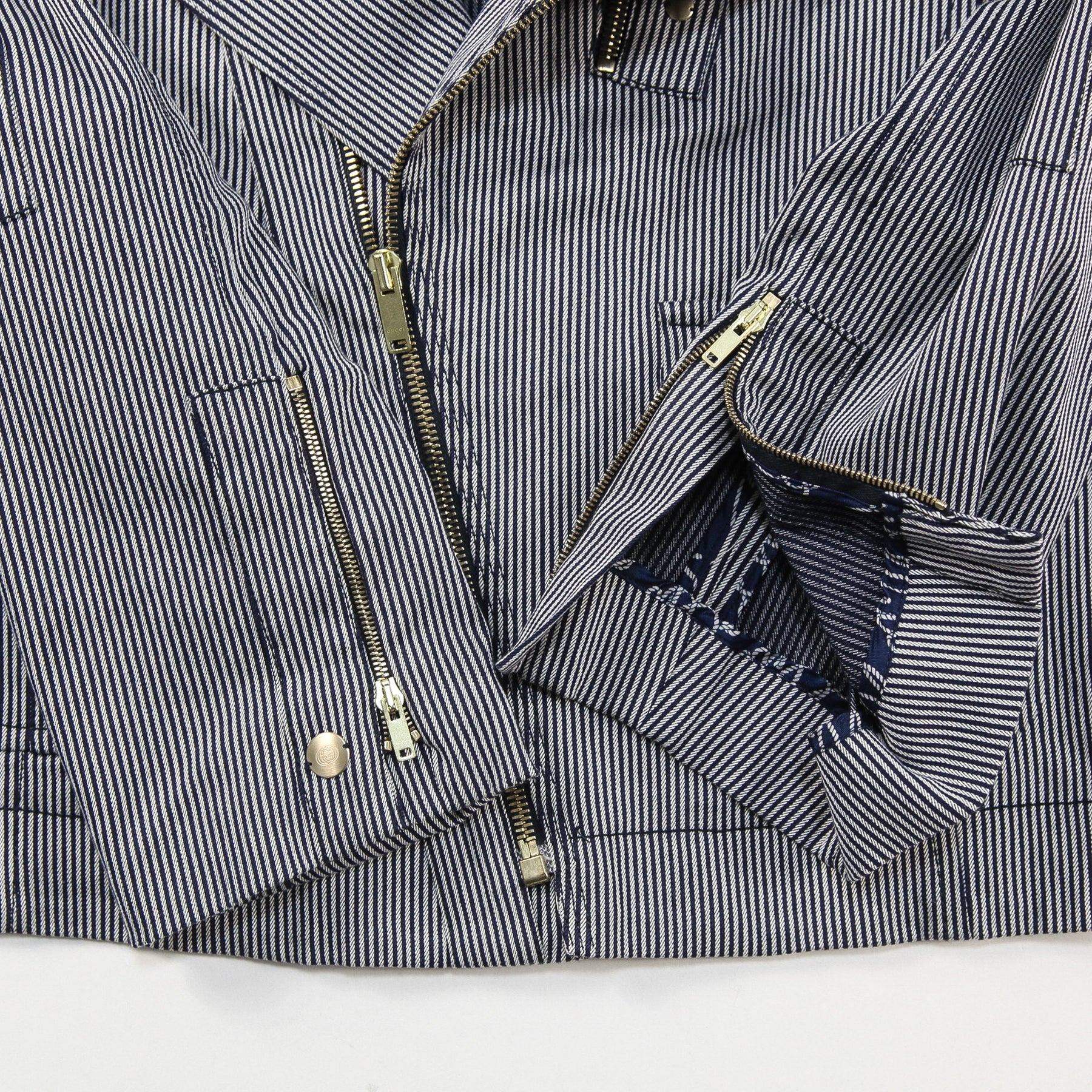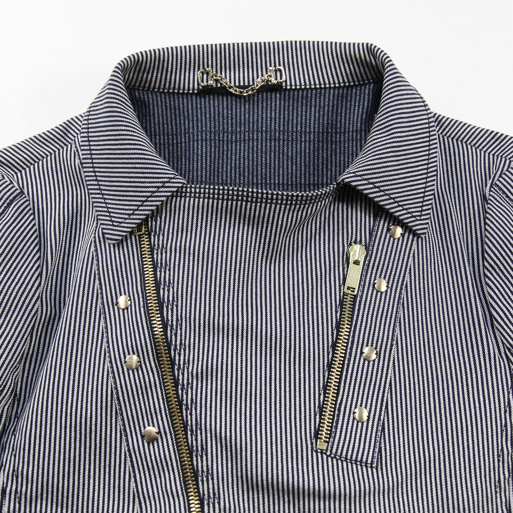 ネイビー×グレーの落ち着いた配色のストライプ柄を採用しており、ゴールドジップやボタン、パーツが高級感を漂わせる仕上がり。