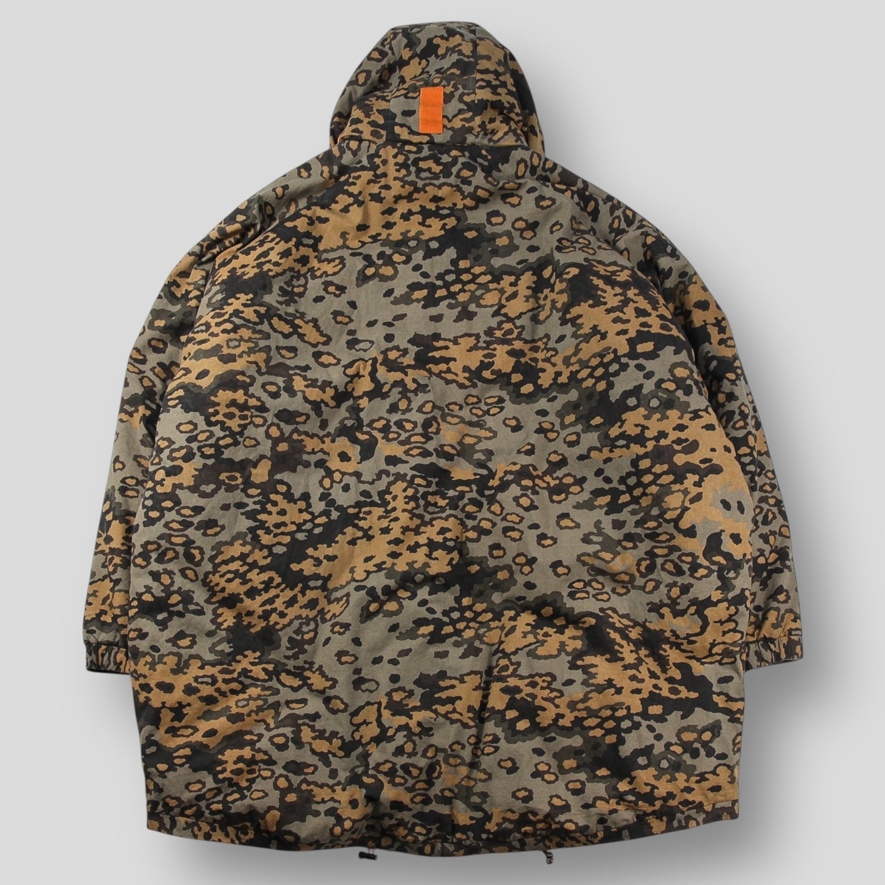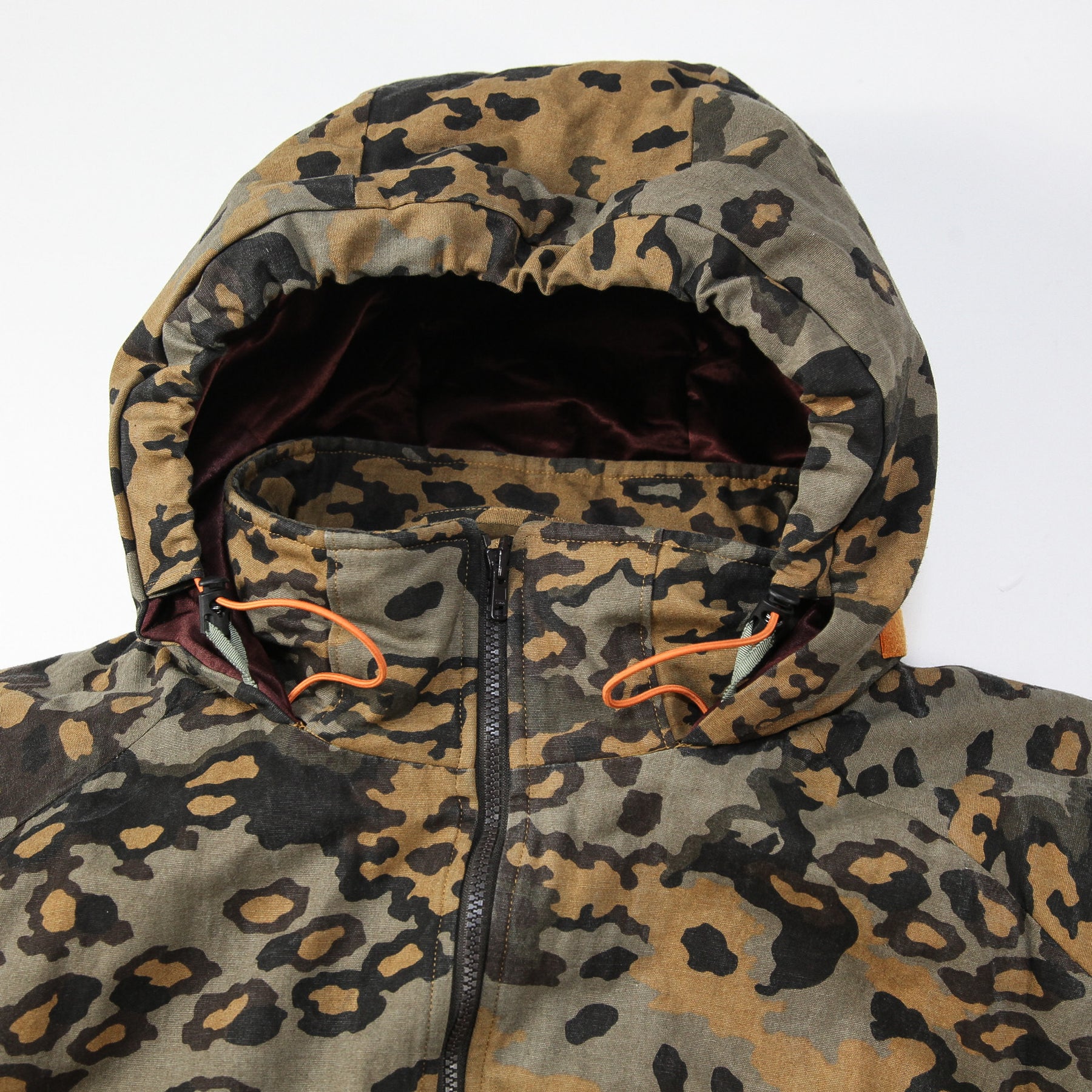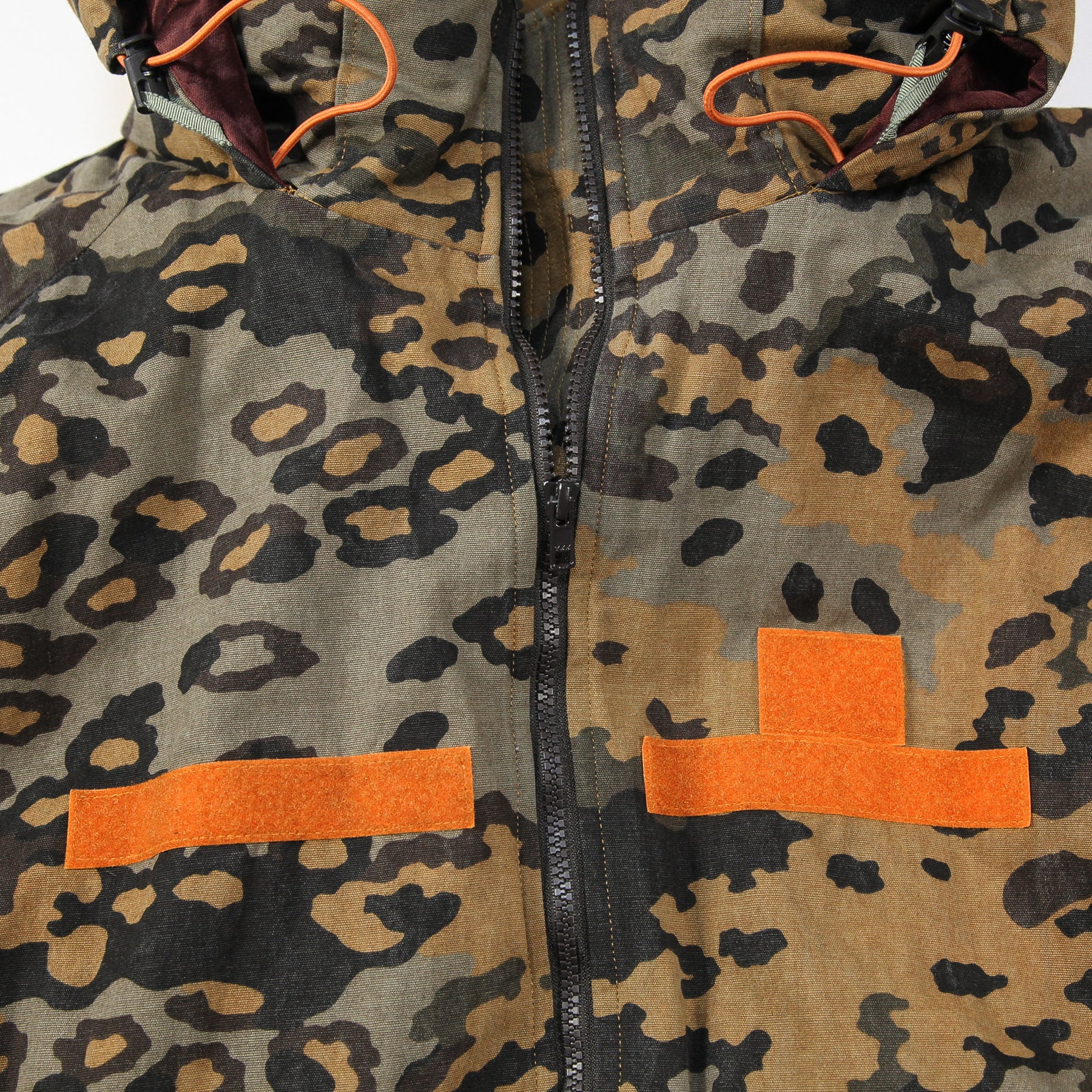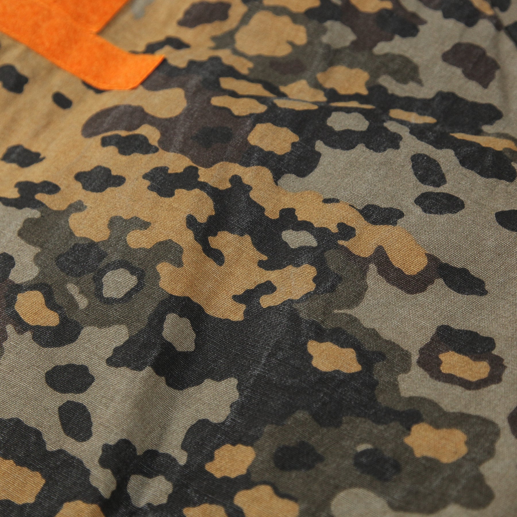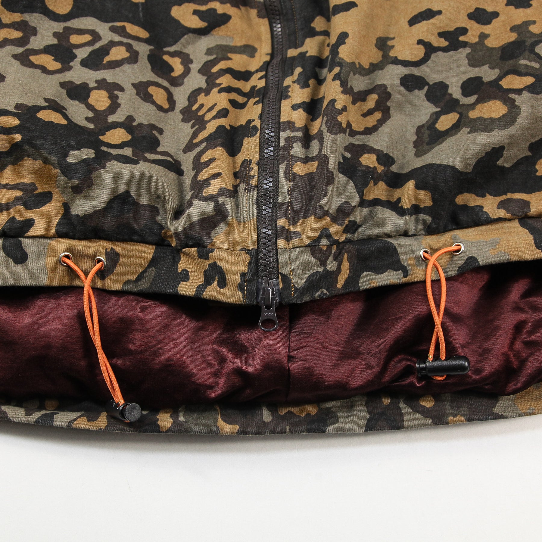 独特な迷彩柄のコットン生地をメインに、裏地には光沢のある滑りの良い生地を使用。袖や身幅のたるみ、ボリュームが生み出す特徴的なシルエットが圧倒的な存在感を放つ1着。