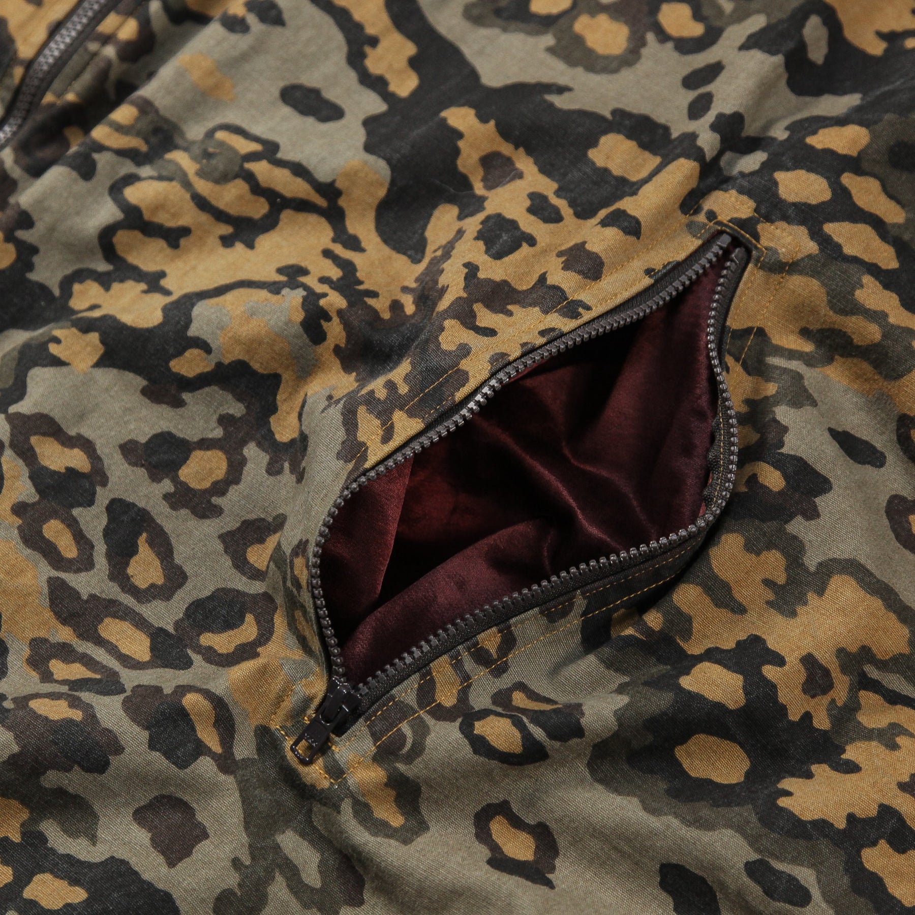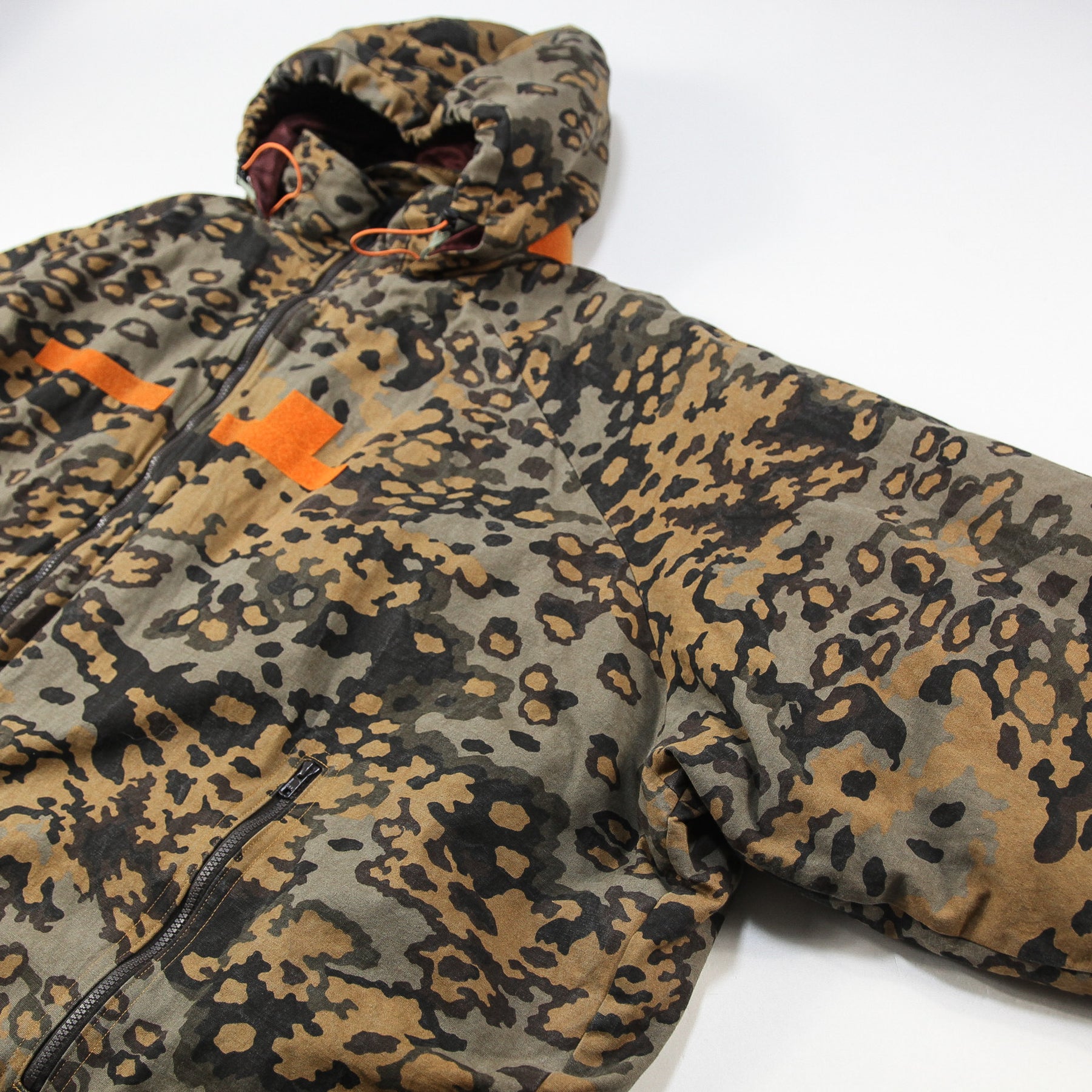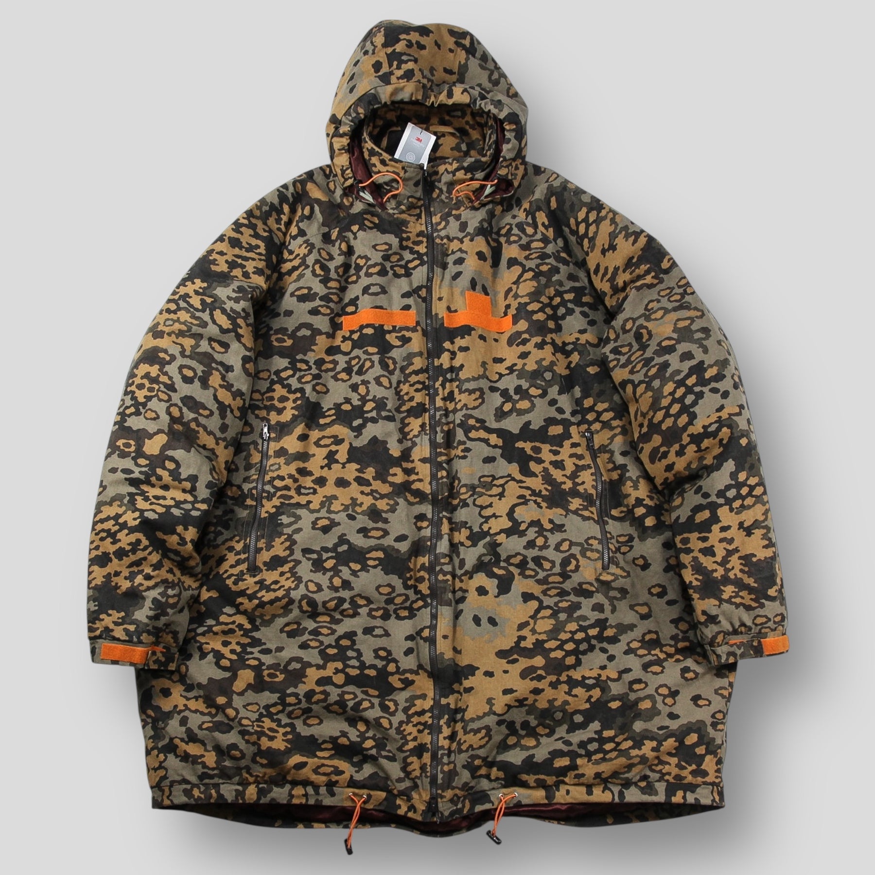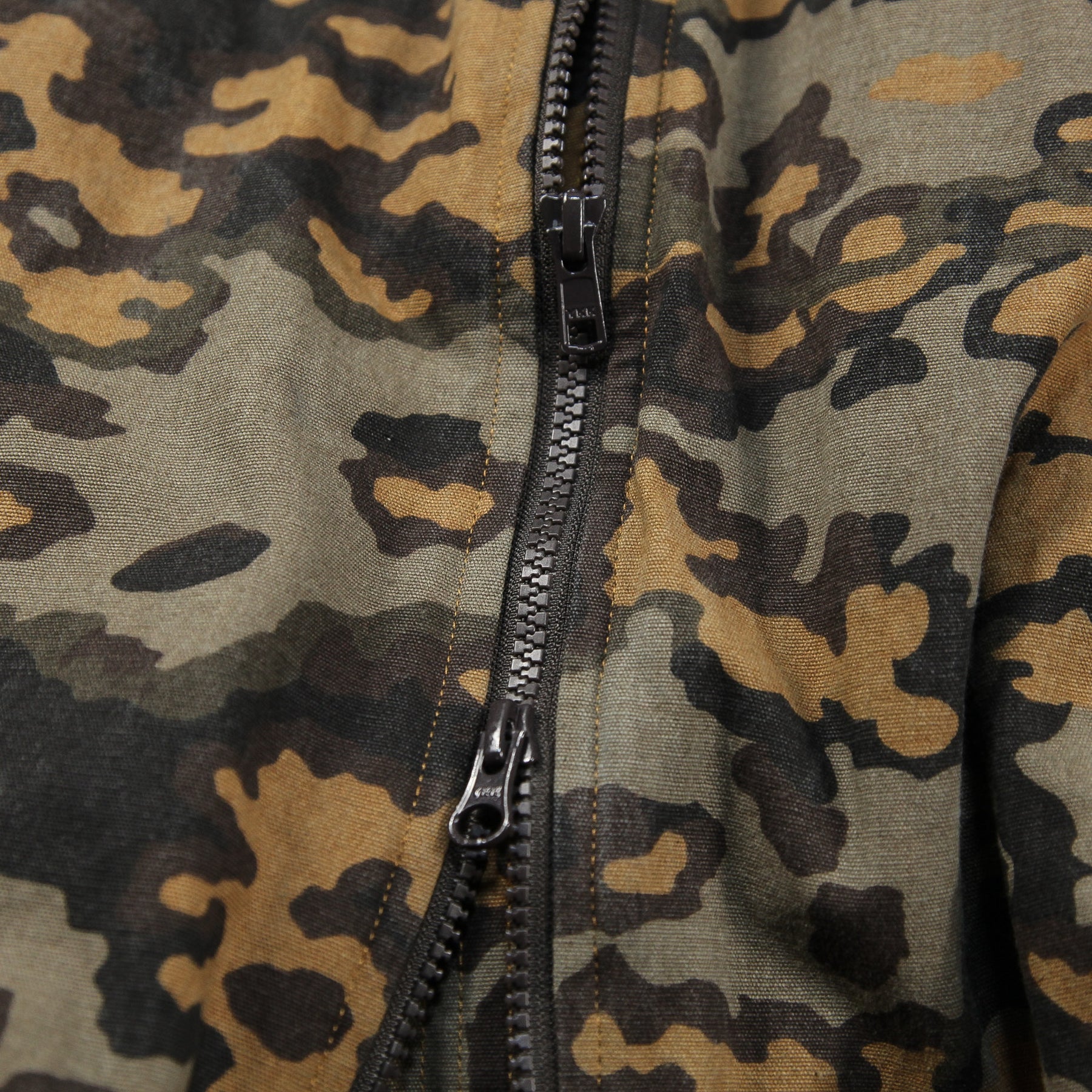 独特な迷彩柄のコットン生地をメインに、裏地には光沢のある滑りの良い生地を使用。袖や身幅のたるみ、ボリュームが生み出す特徴的なシルエットが圧倒的な存在感を放つ1着。