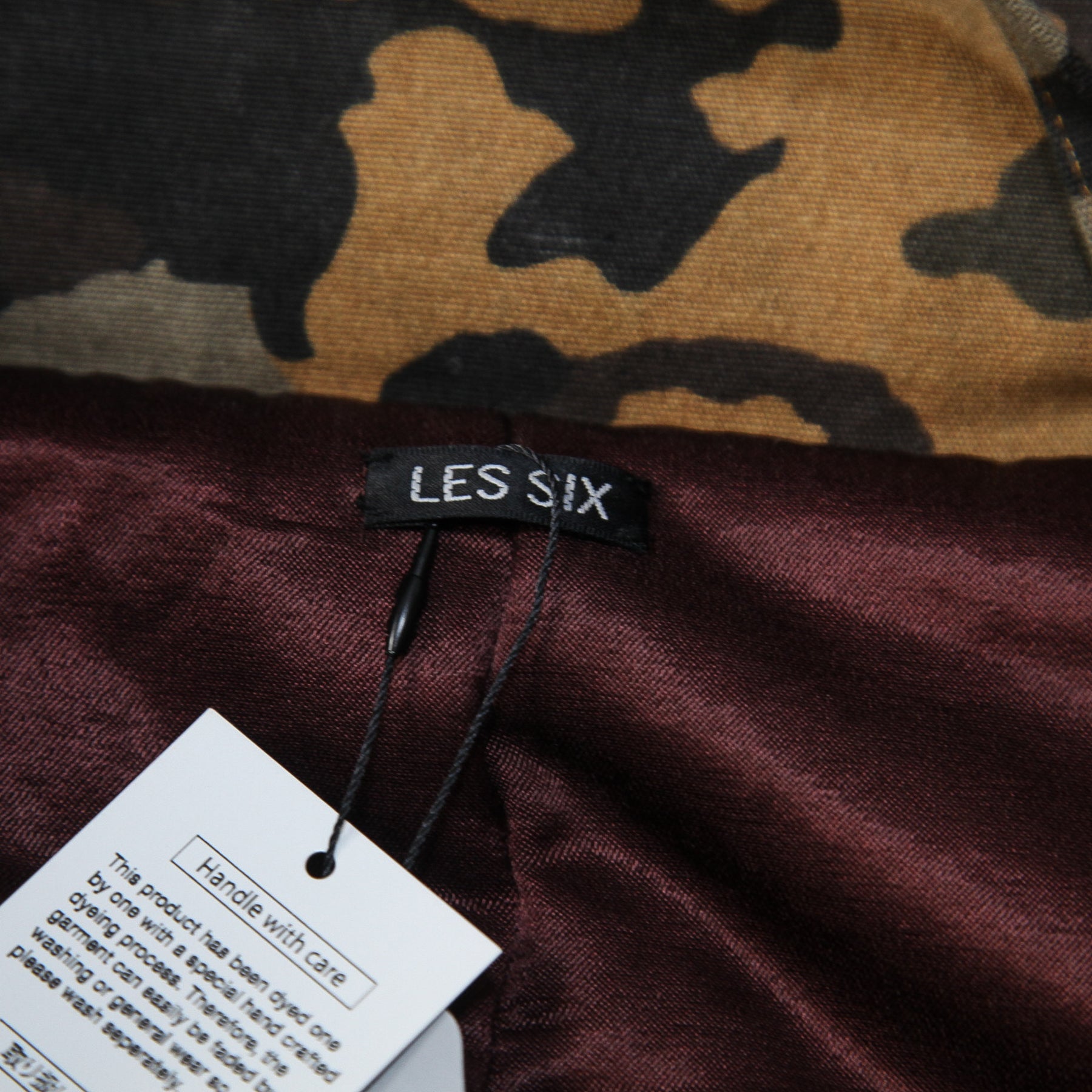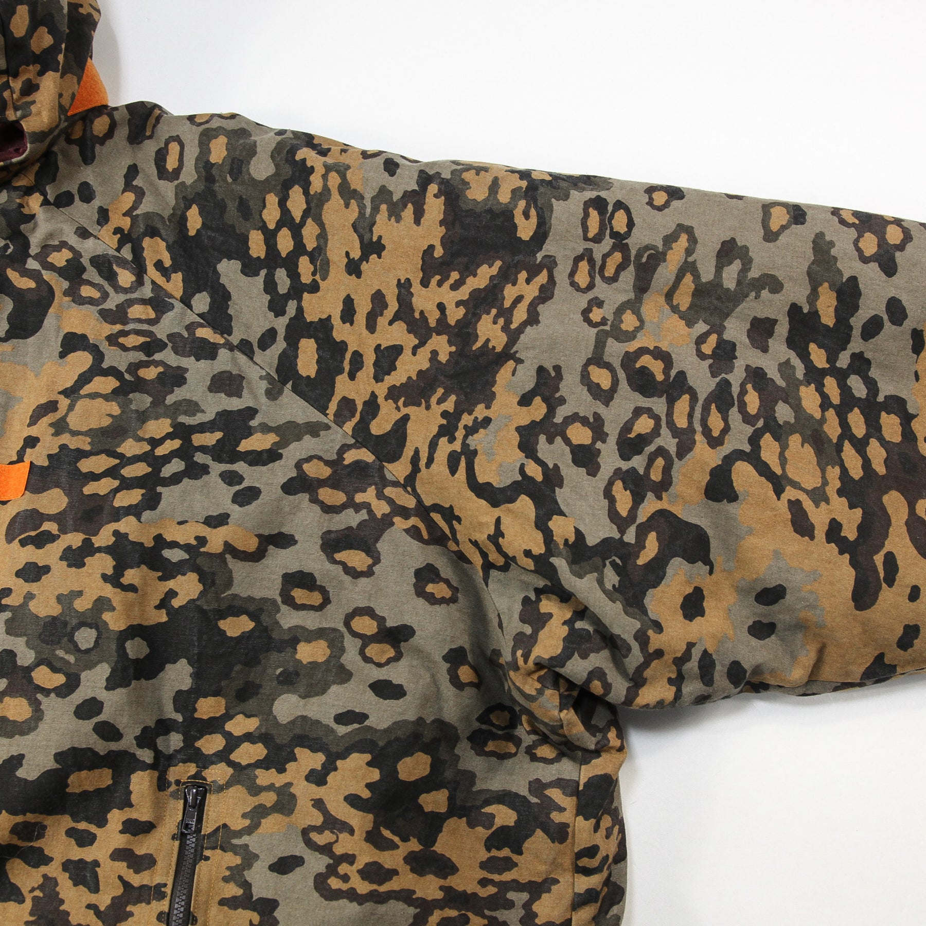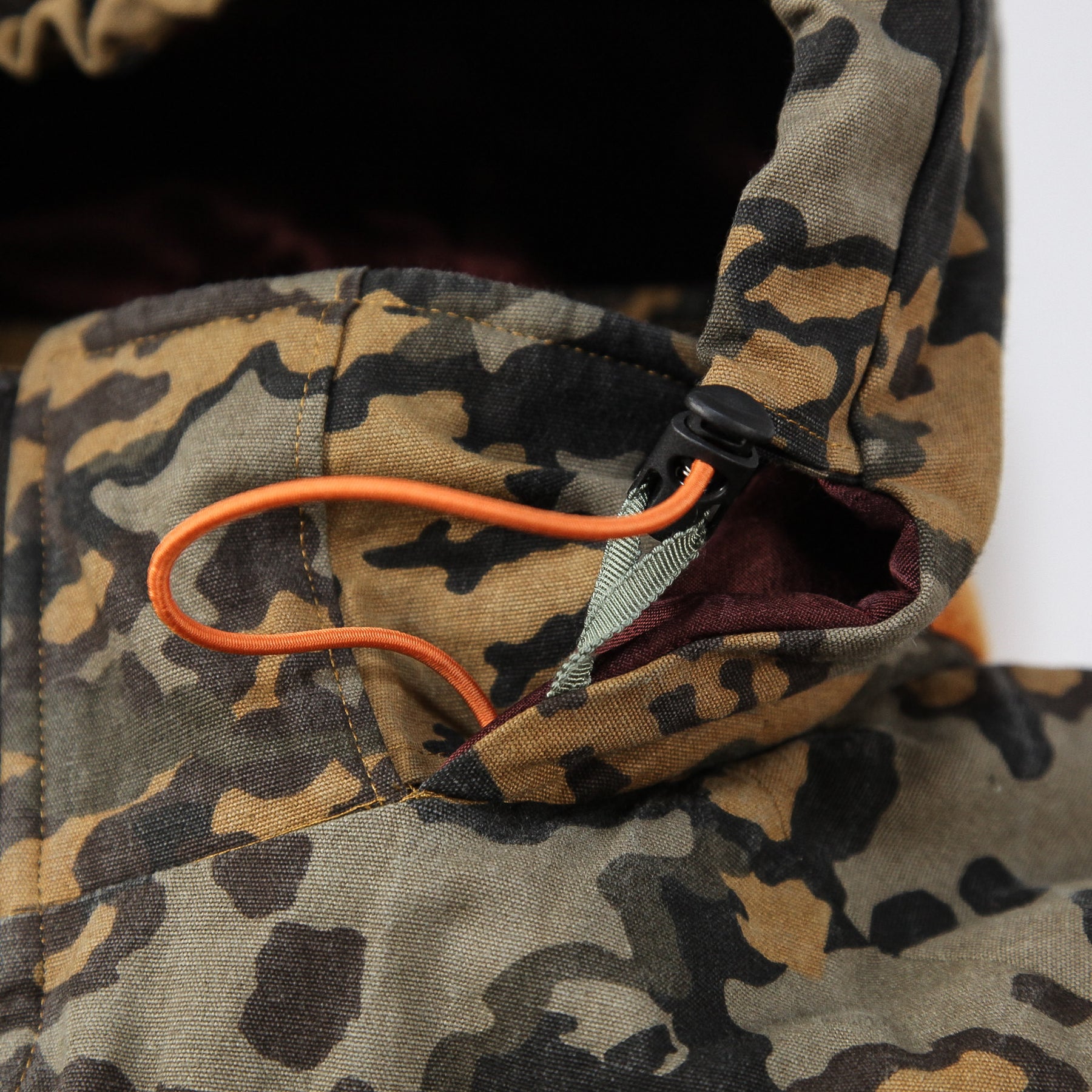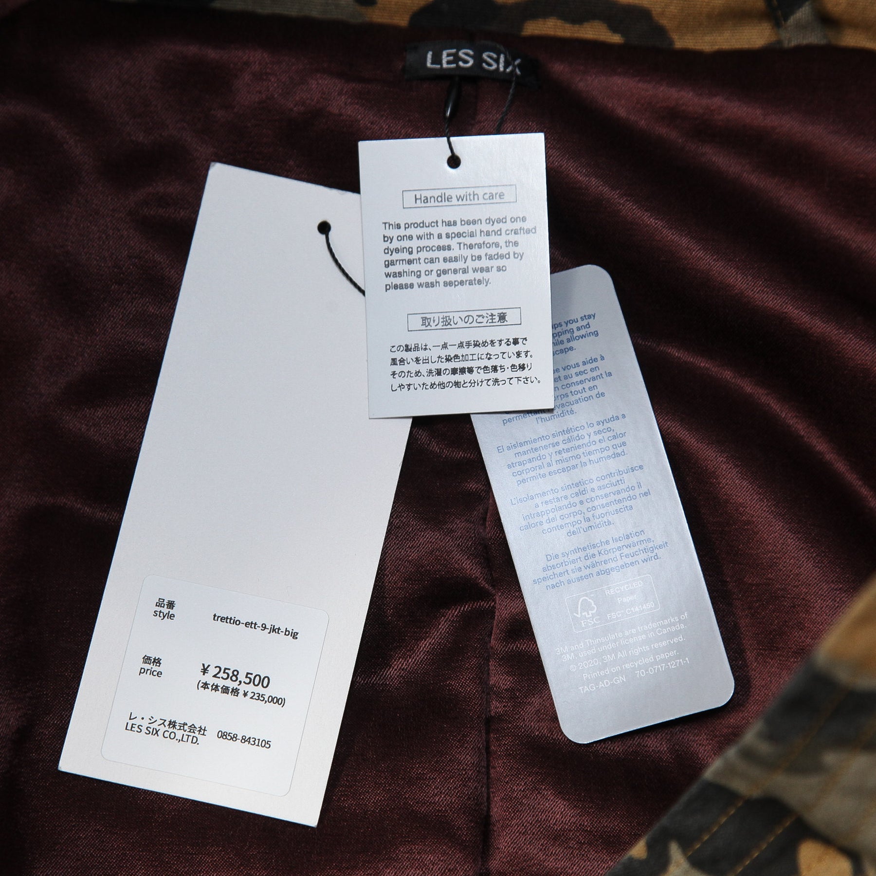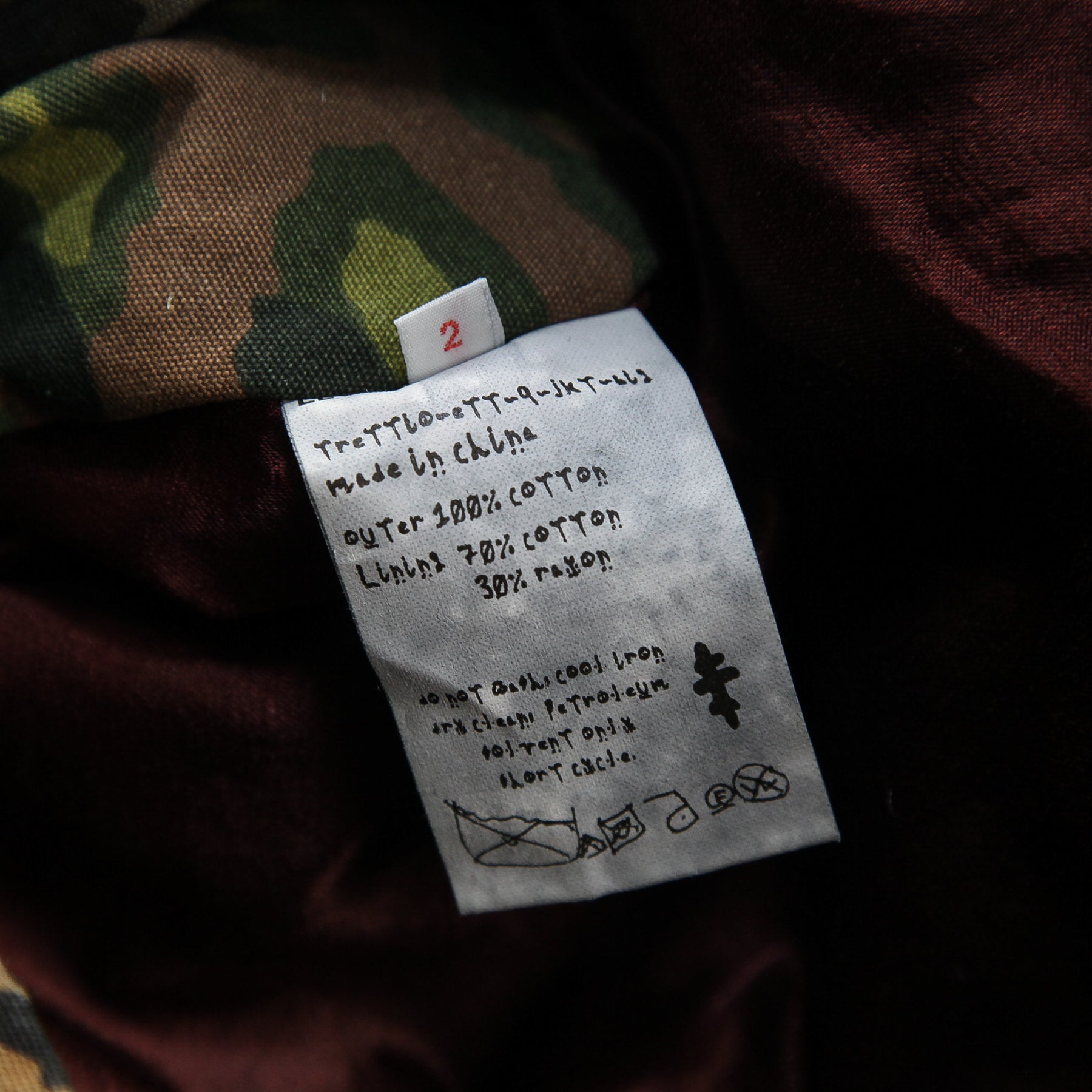 独特な迷彩柄のコットン生地をメインに、裏地には光沢のある滑りの良い生地を使用。袖や身幅のたるみ、ボリュームが生み出す特徴的なシルエットが圧倒的な存在感を放つ1着。