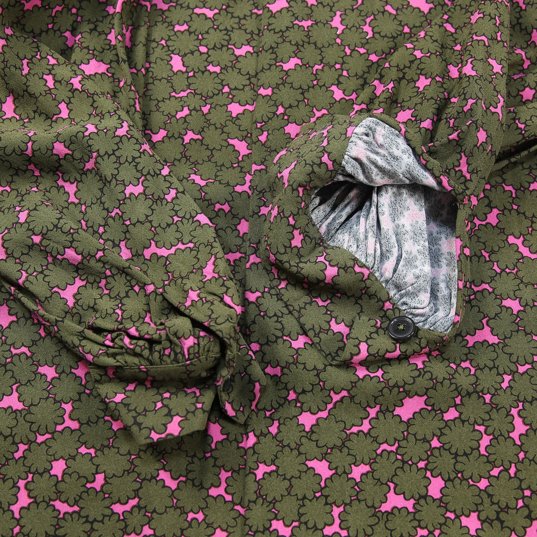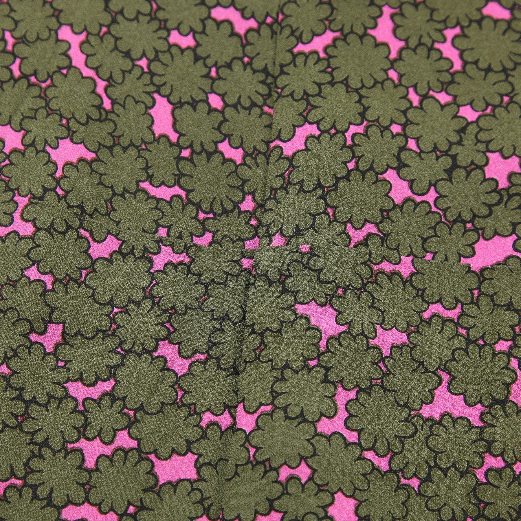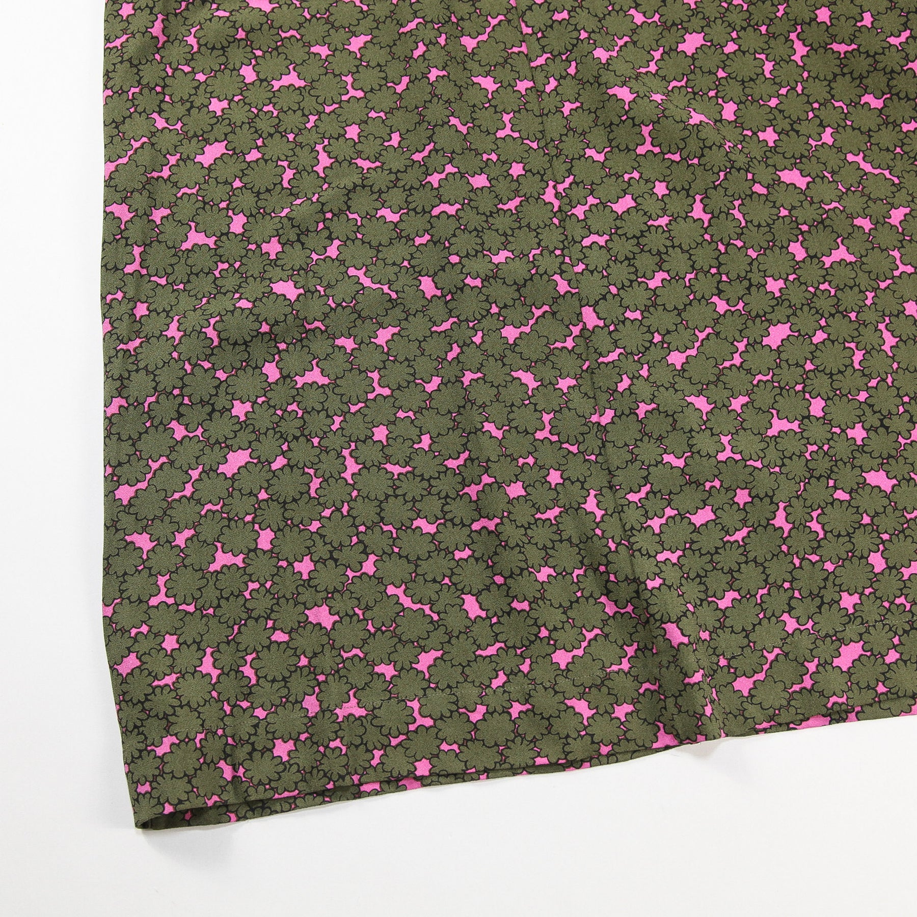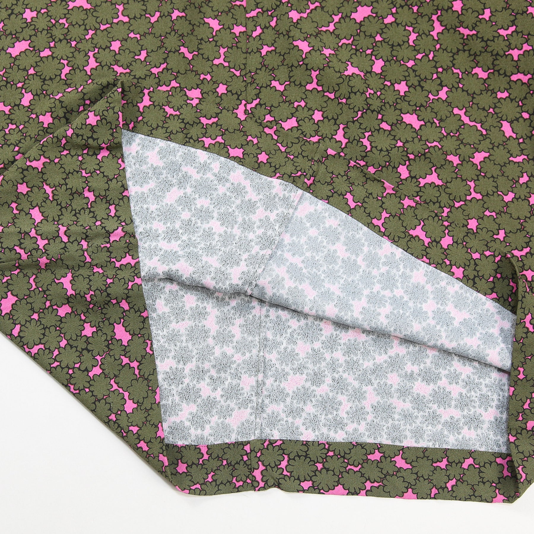 鮮やかなピンクベースの生地にグリーン系のリーフフラワーをプリントしており、派手過ぎず合わせやすい仕上がり。